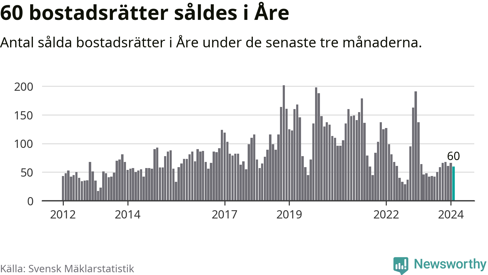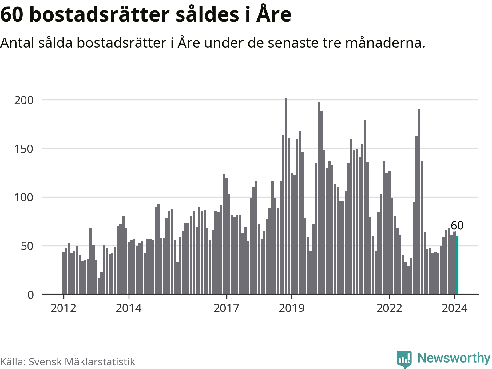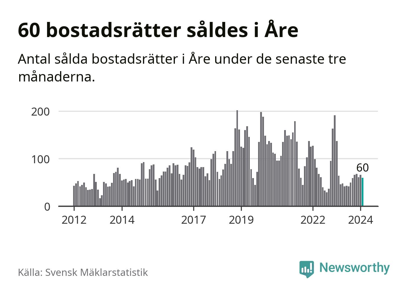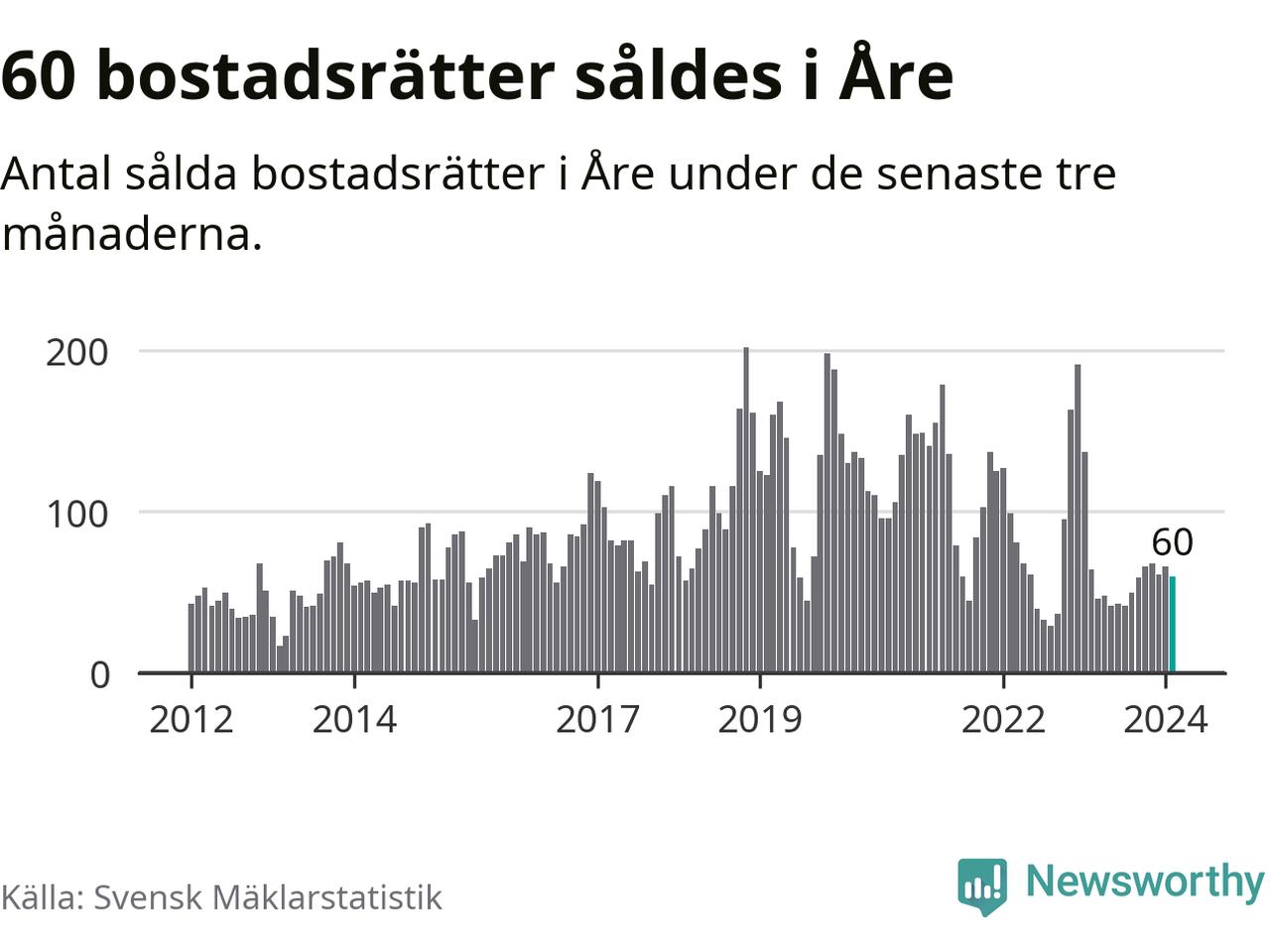 Sammanlagt såldes 60 bostadsrätter i Åre kommun mellan december och februari till ett genomsnittligt pris på 3,8 miljoner kronor. I fjol gjordes 64 affärer vid den här tiden på året.