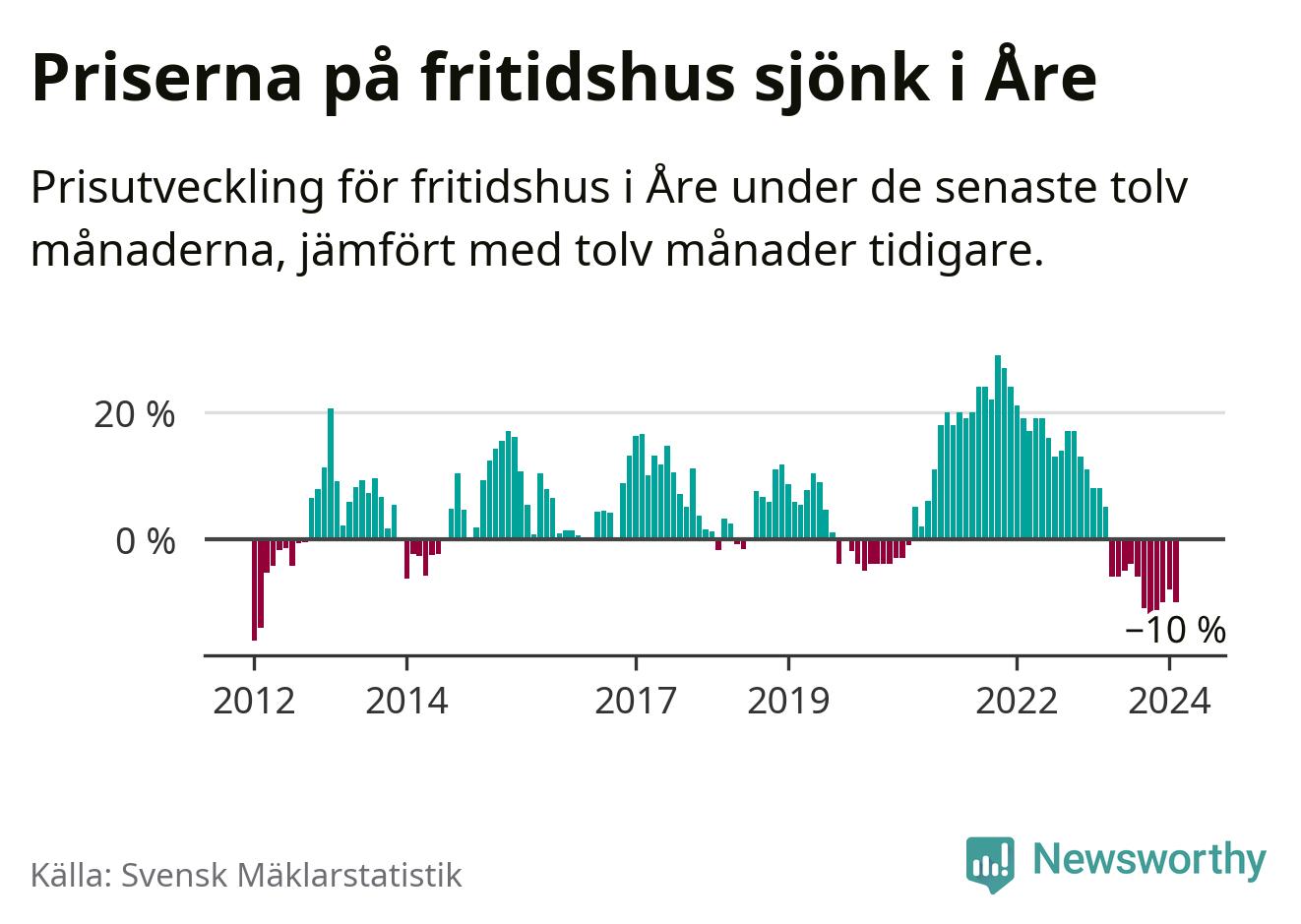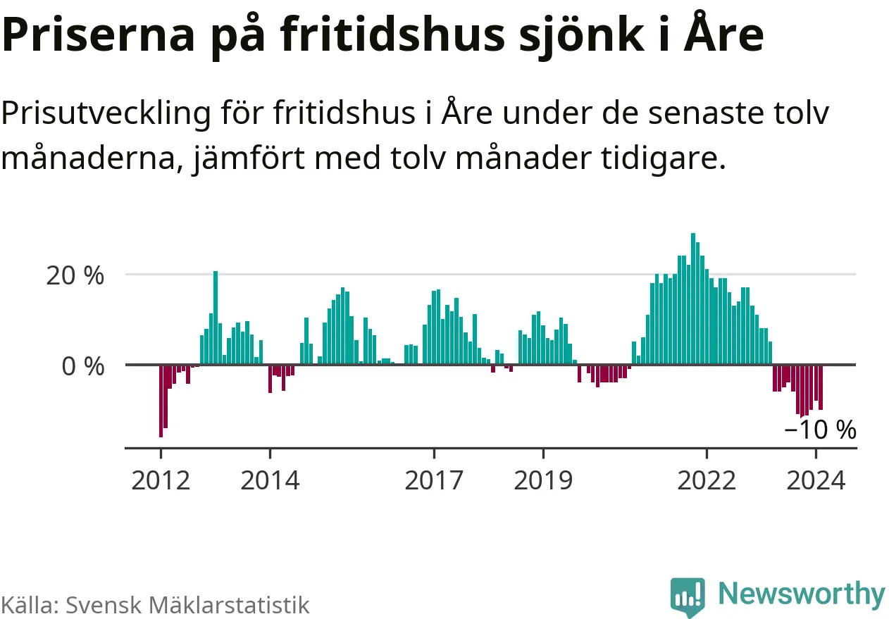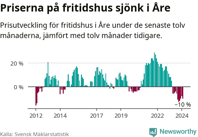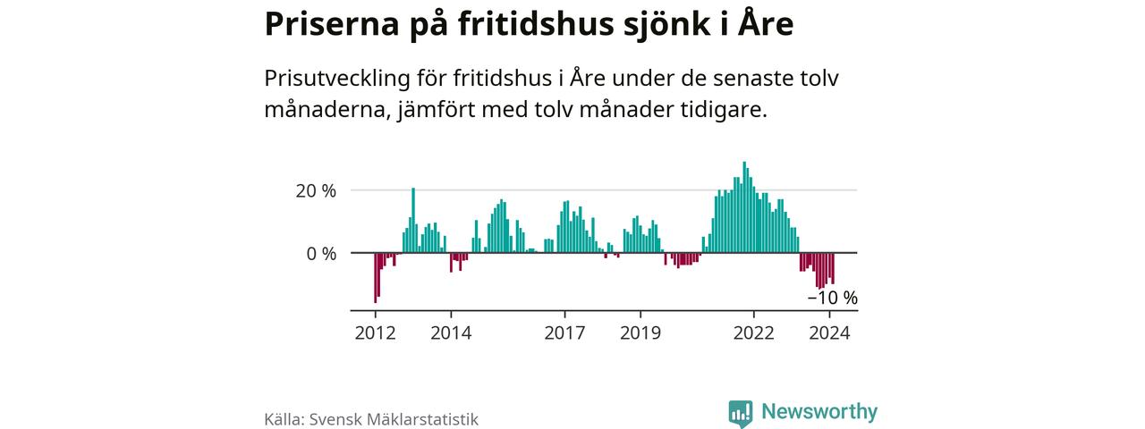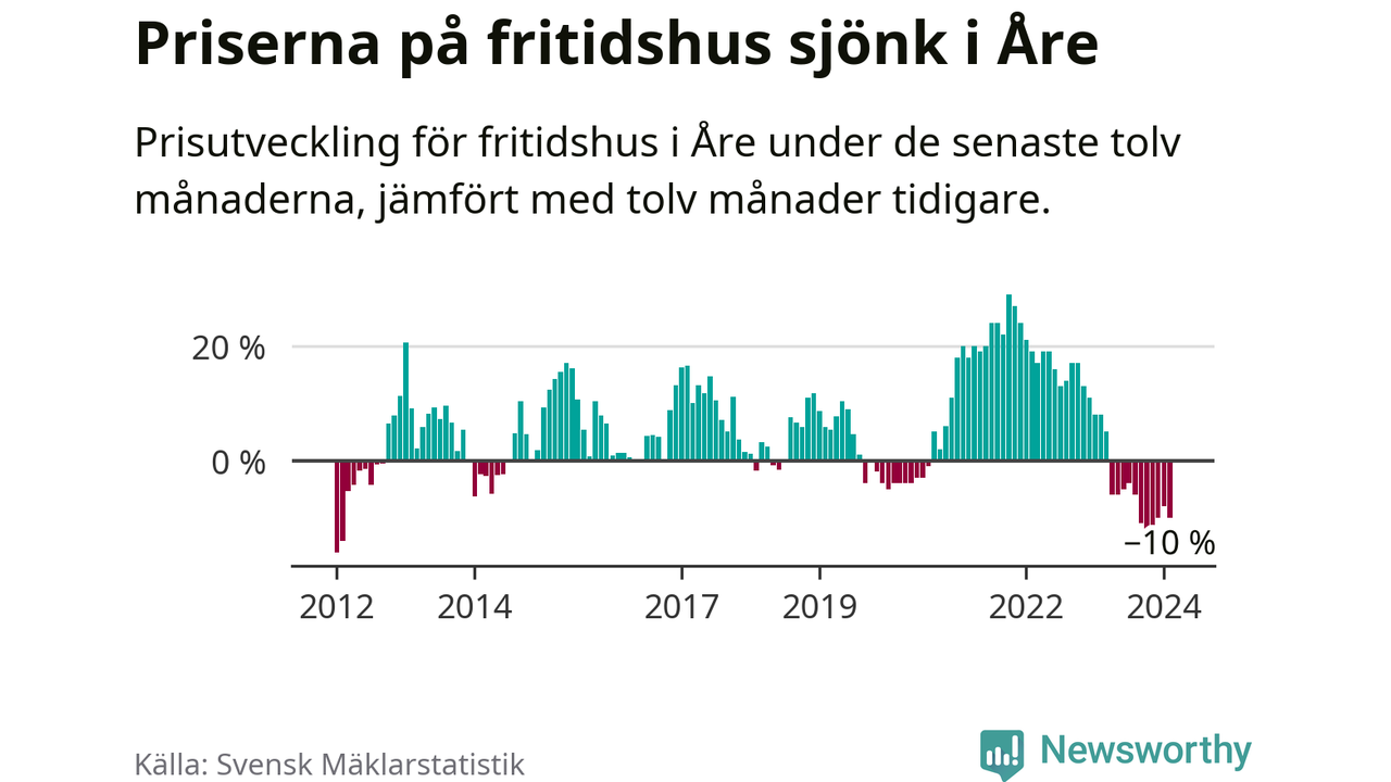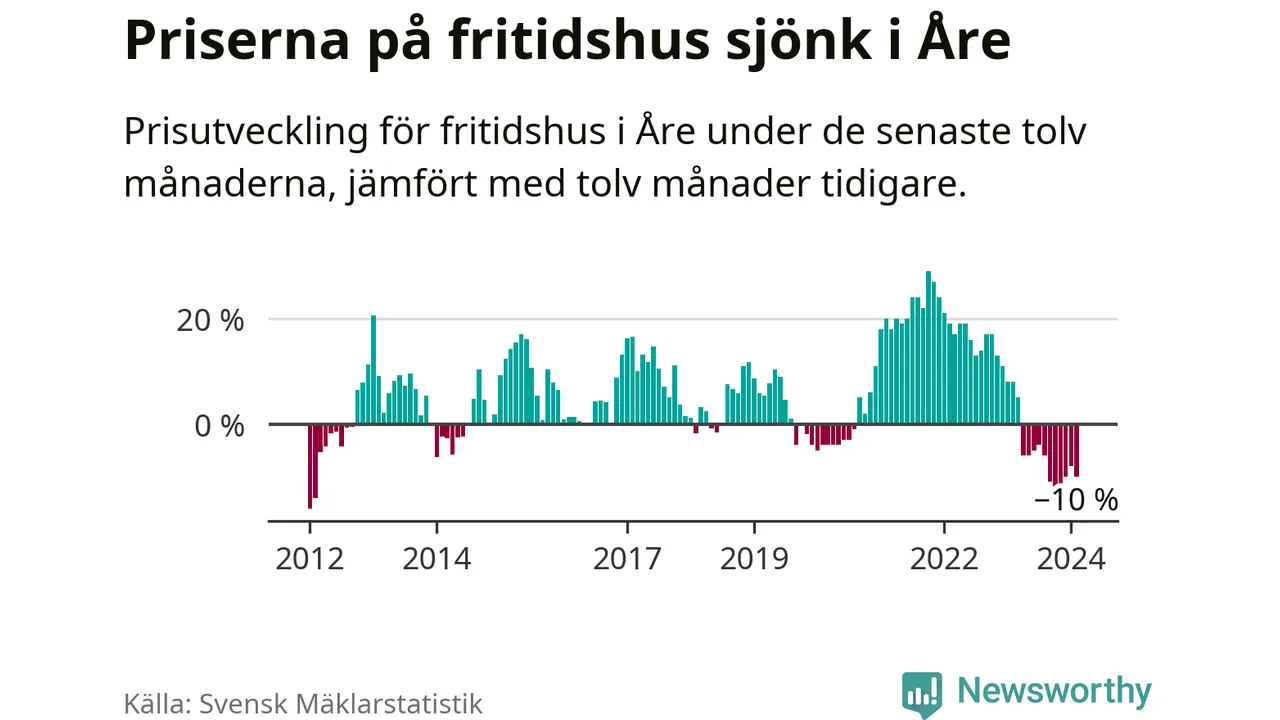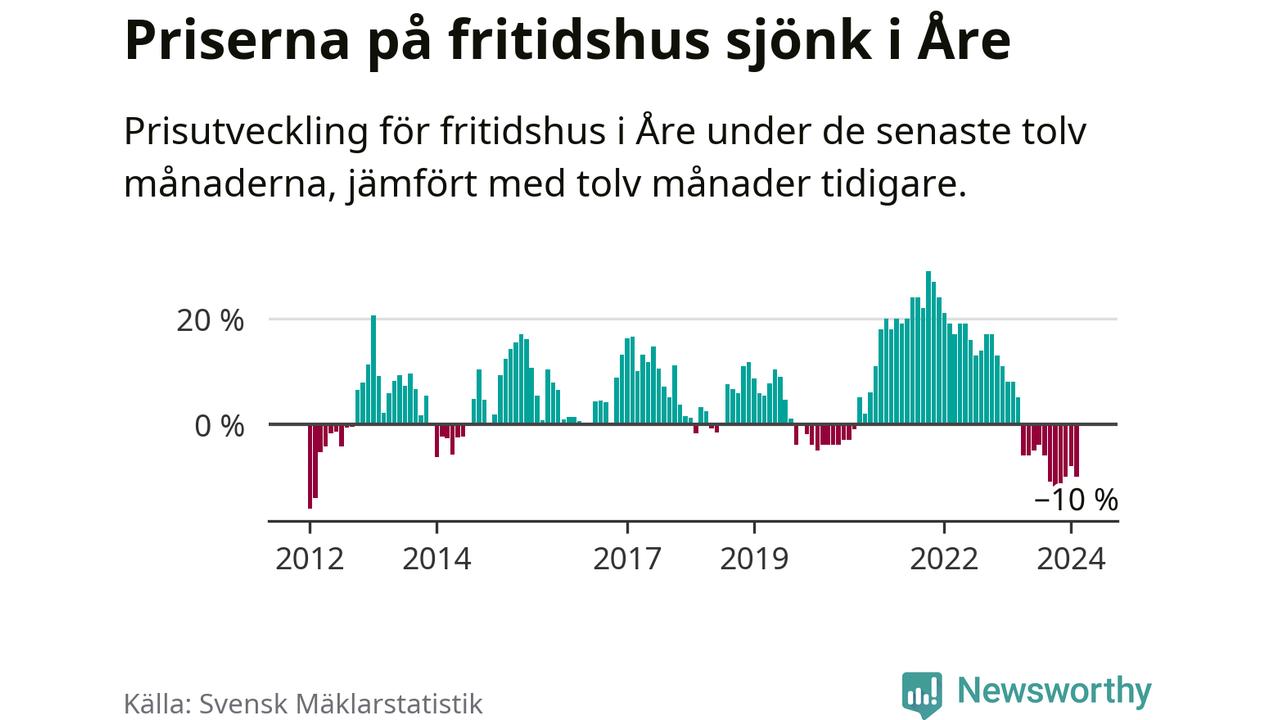 Priserna på fritidshus har gått ner i Åre kommun. Medelpriset på försäljningarna under de senaste tolv månaderna visar på en nedgång med 10 procent.