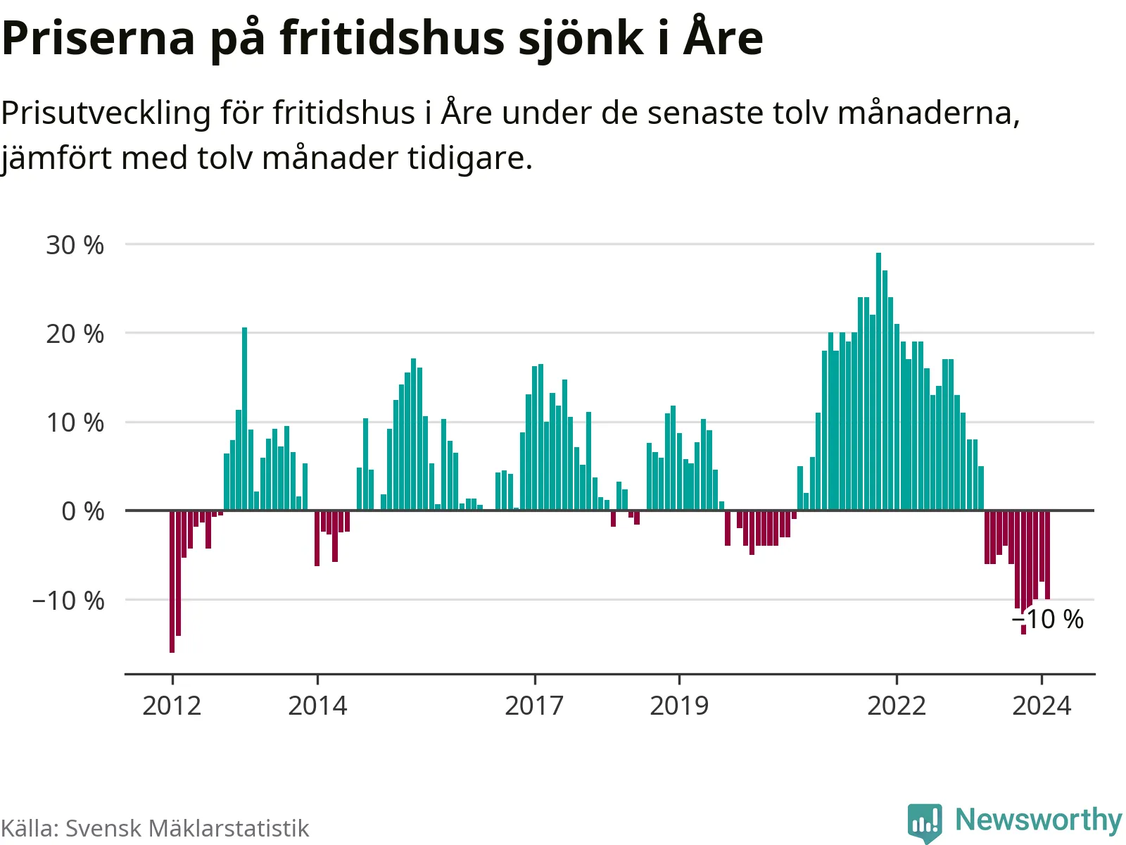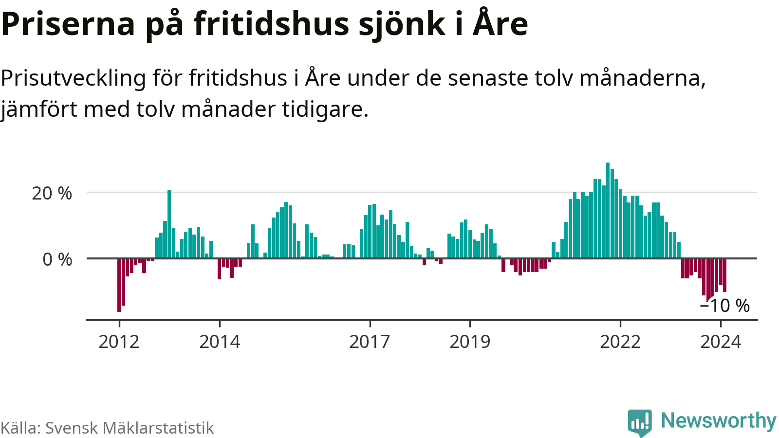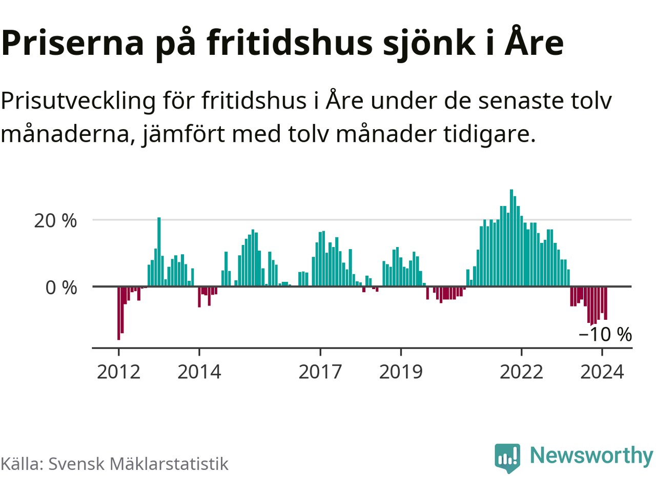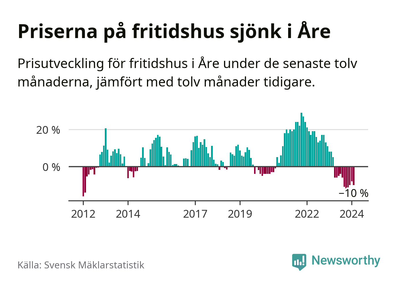 Priserna på fritidshus har gått ner i Åre kommun. Medelpriset på försäljningarna under de senaste tolv månaderna visar på en nedgång med 10 procent.