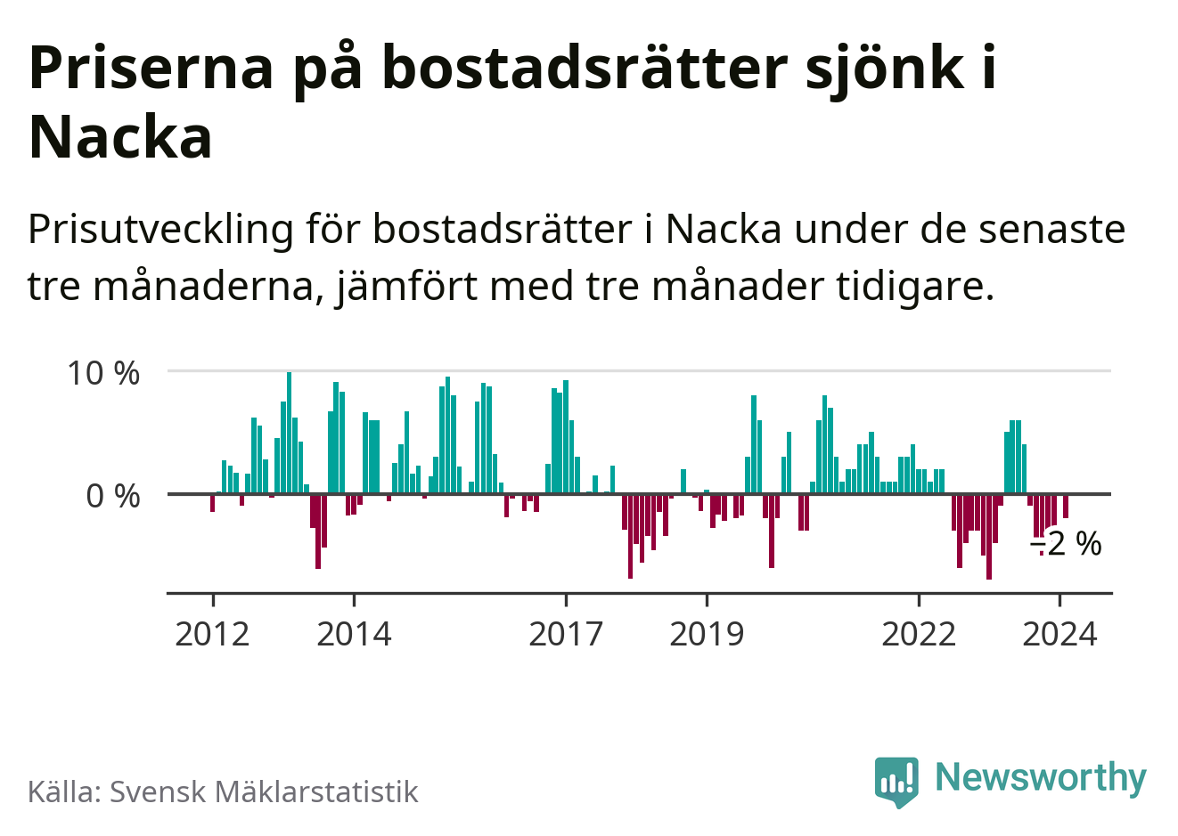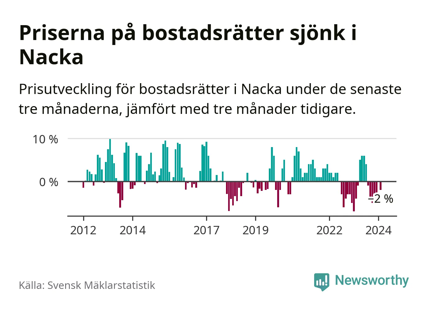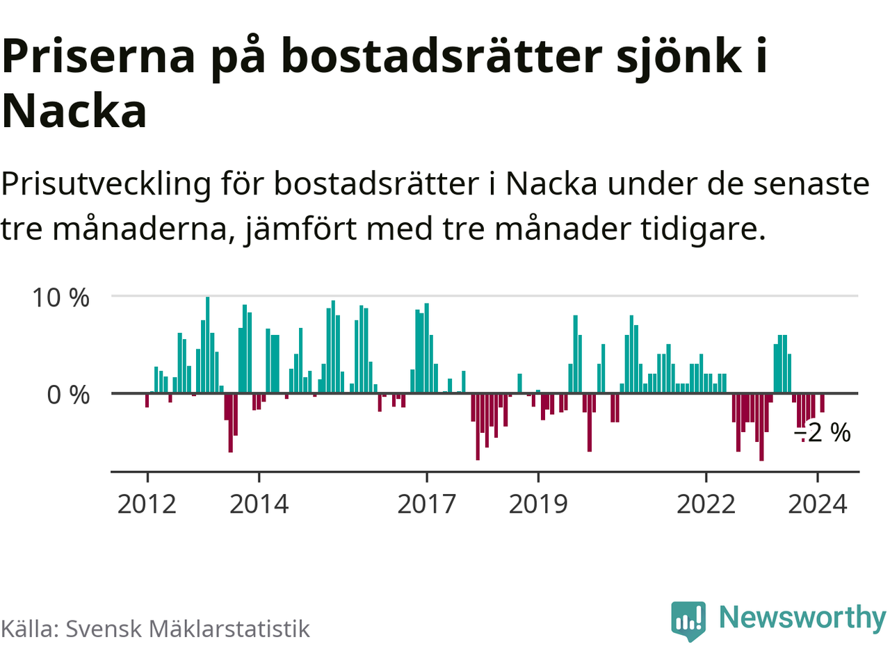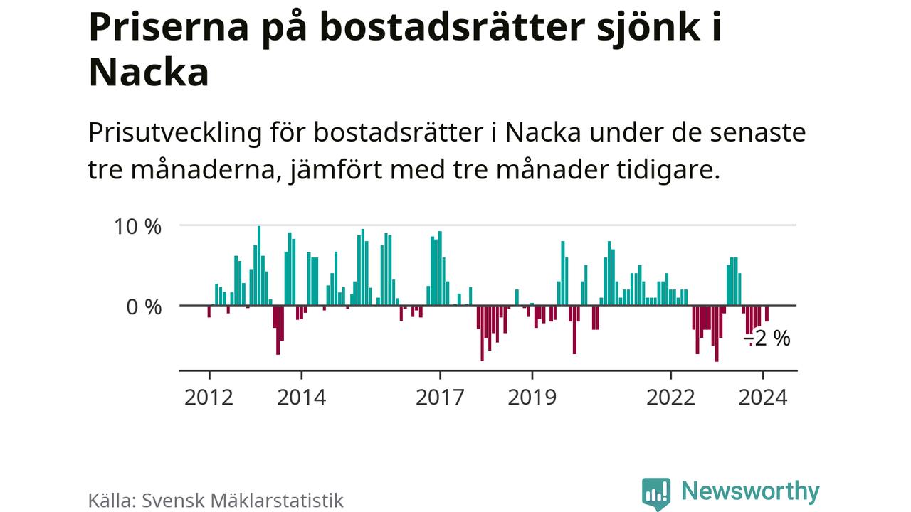 Priserna på bostadsrätter har gått ner i Nacka kommun. Medelpriset på försäljningarna under de senaste tre månaderna visar på en nedgång med 2 procent.