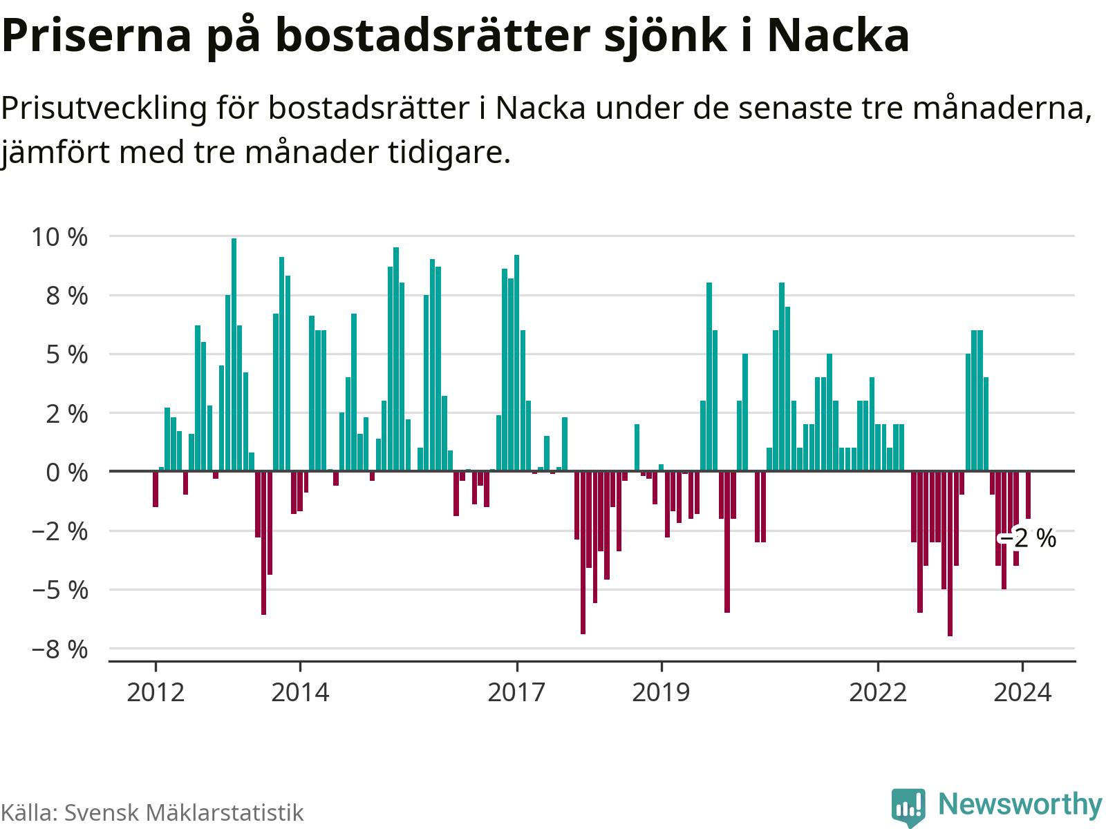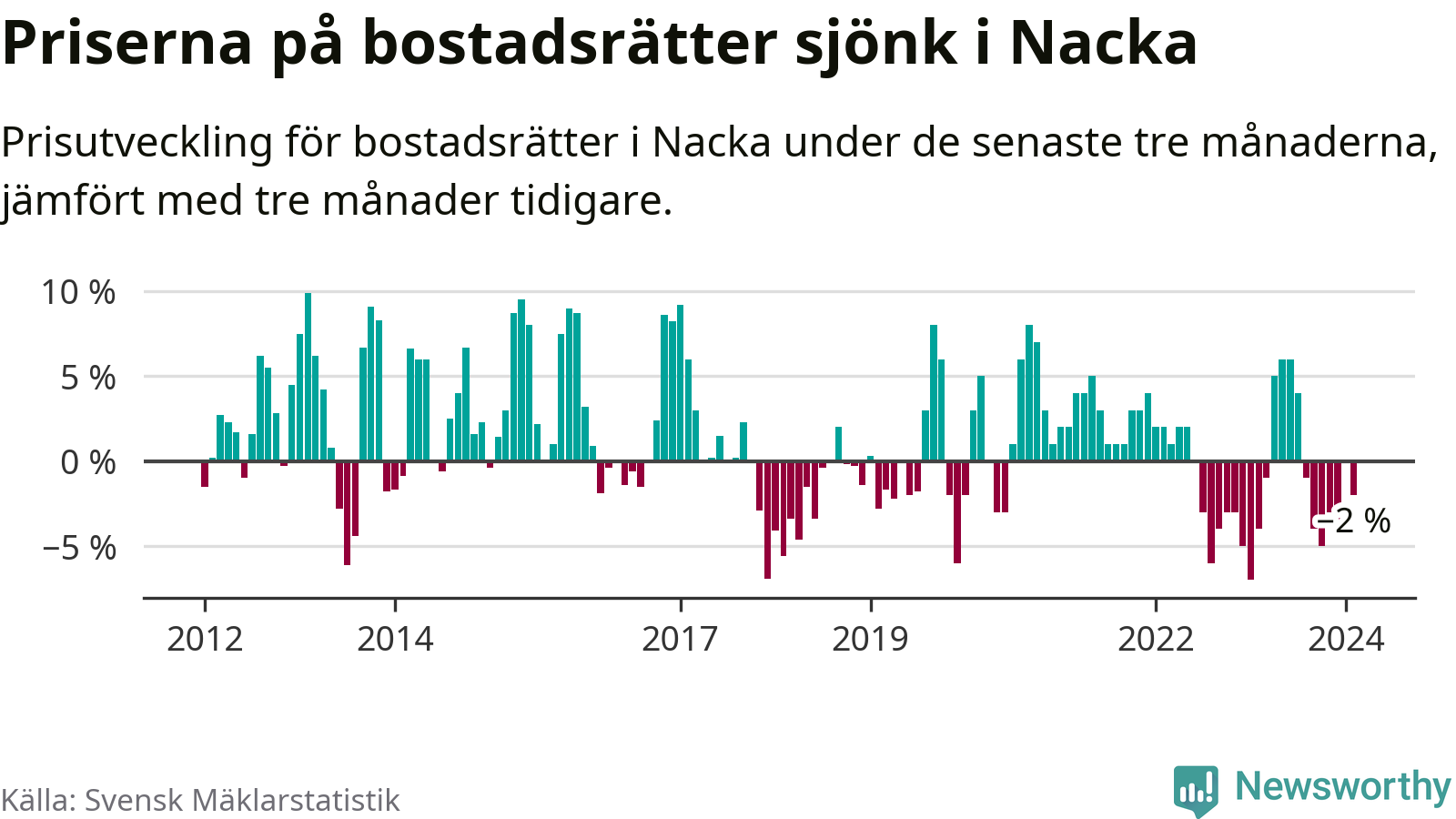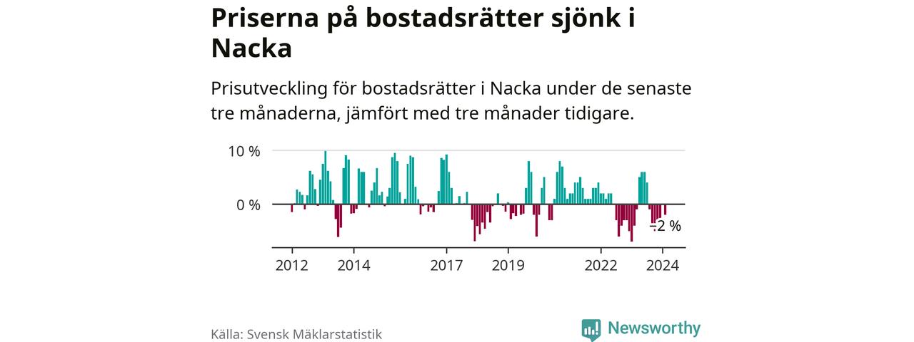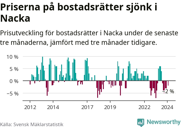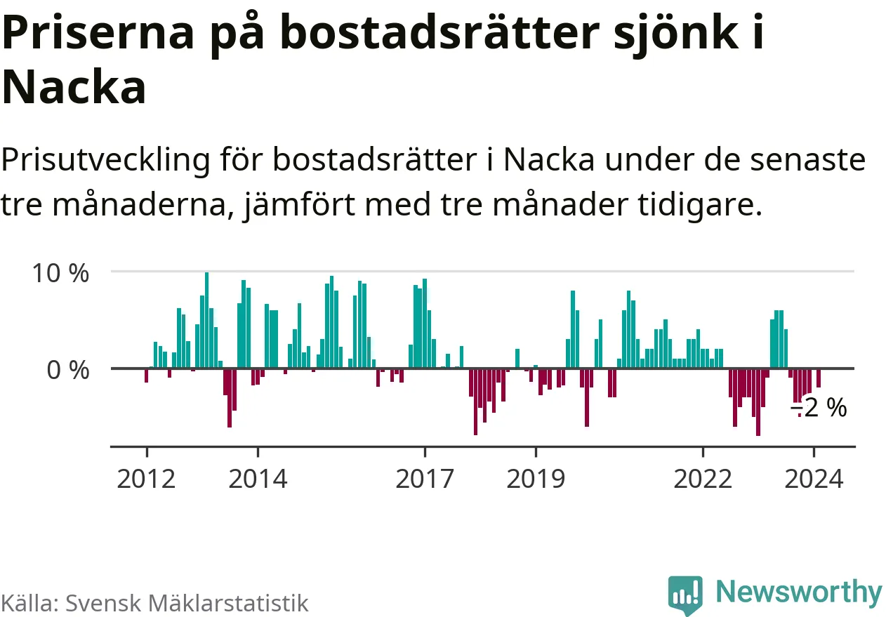 Priserna på bostadsrätter har gått ner i Nacka kommun. Medelpriset på försäljningarna under de senaste tre månaderna visar på en nedgång med 2 procent.