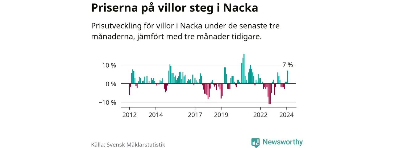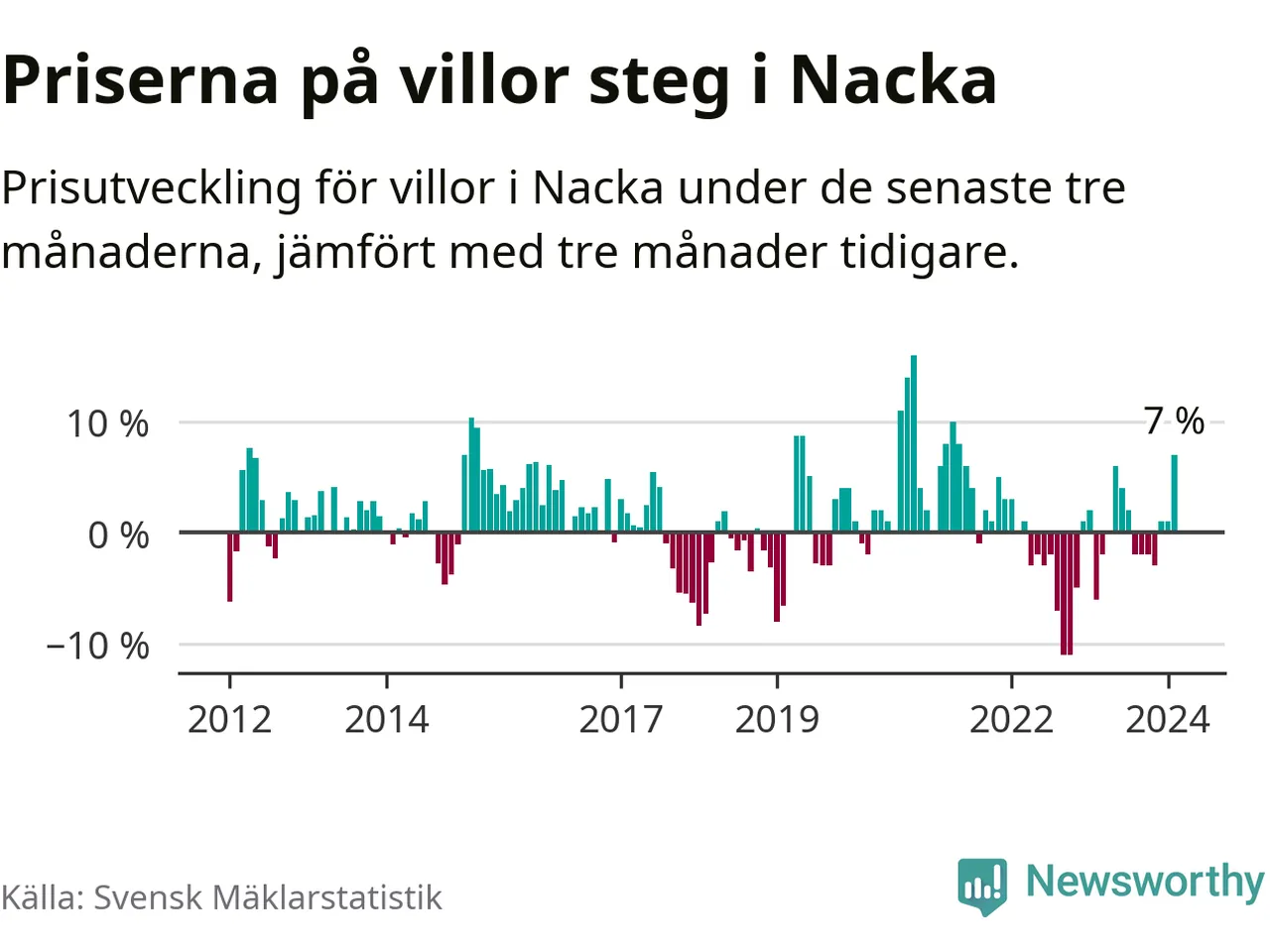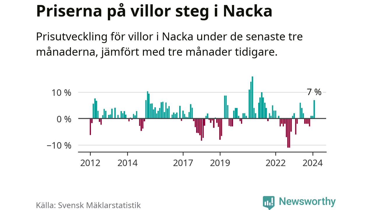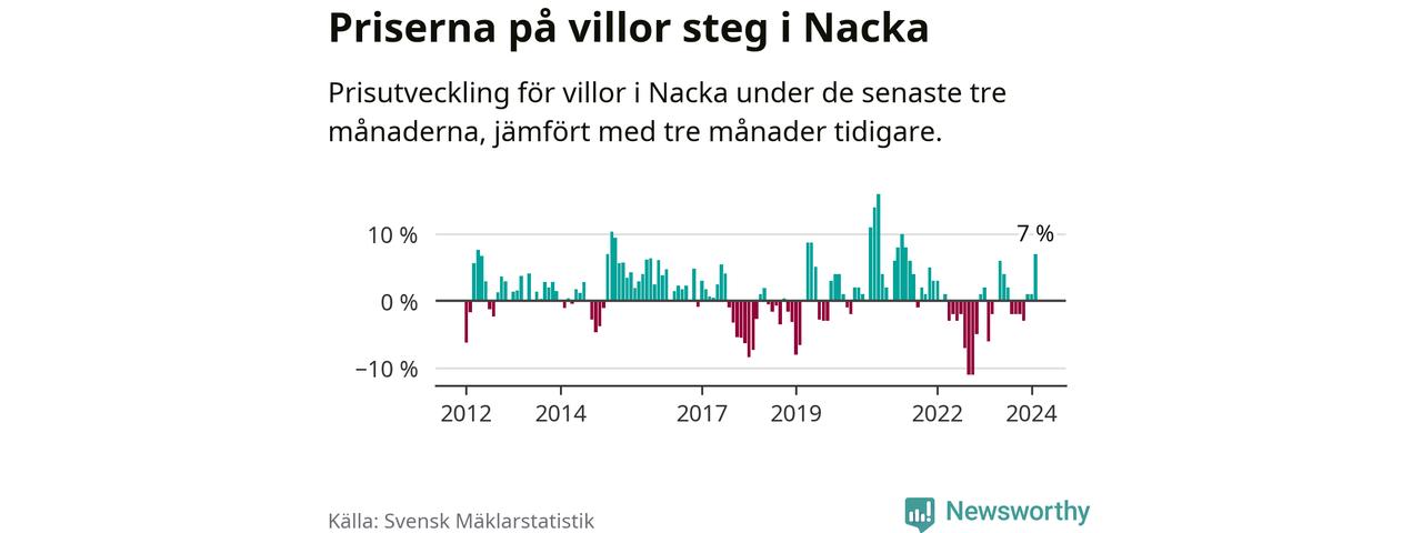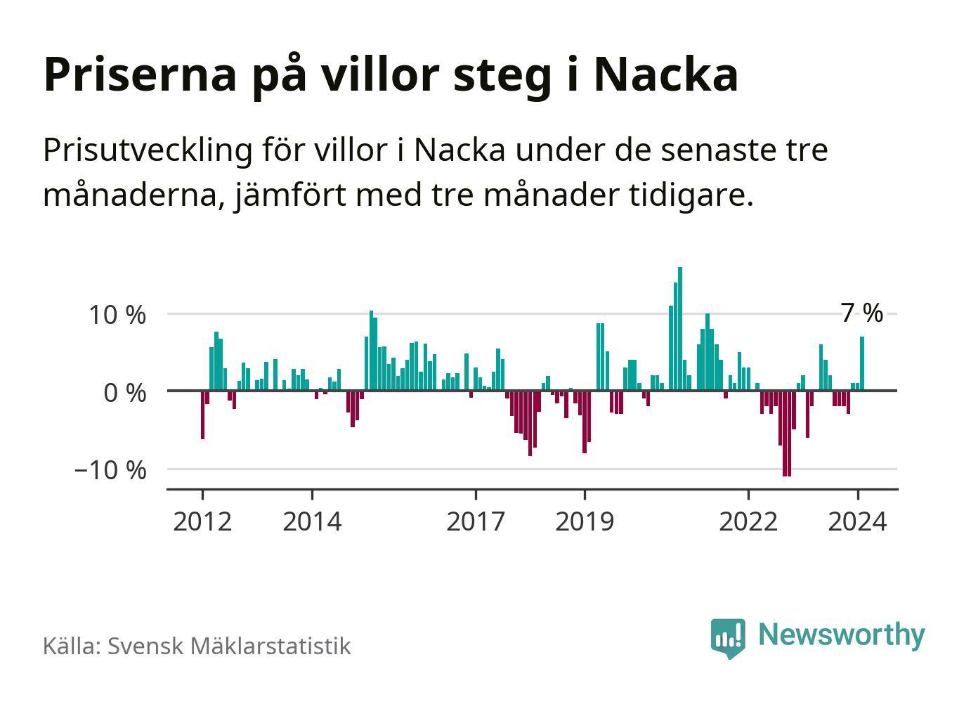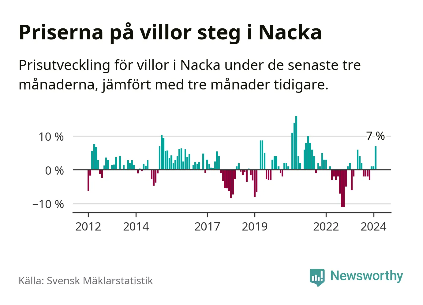 Villapriserna steg mellan december och februari med 7 procent i Nacka kommun. Det är en betydande uppgång jämfört med det gångna året då priserna i snitt ökat med 1 procent.