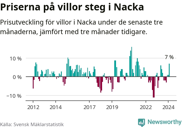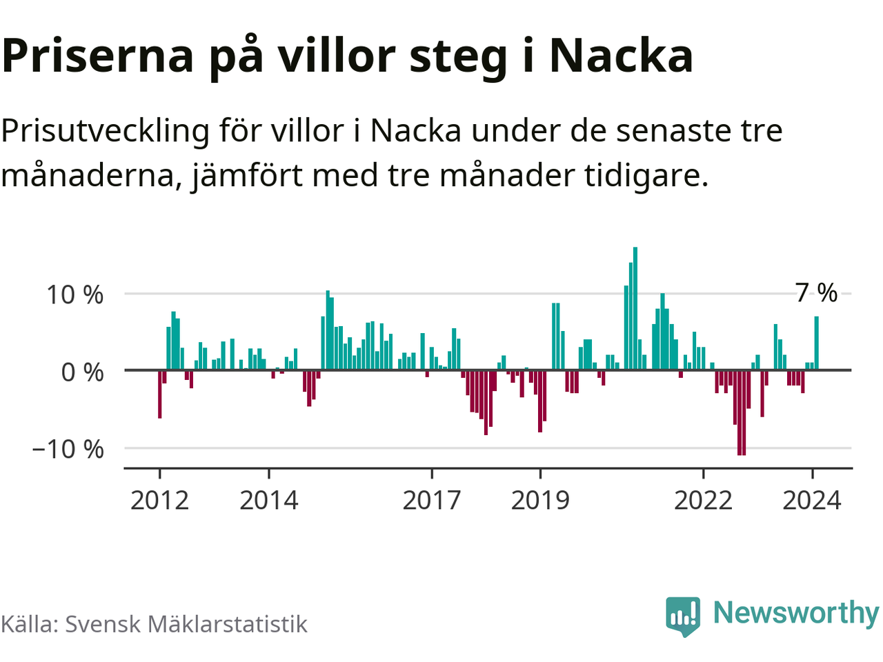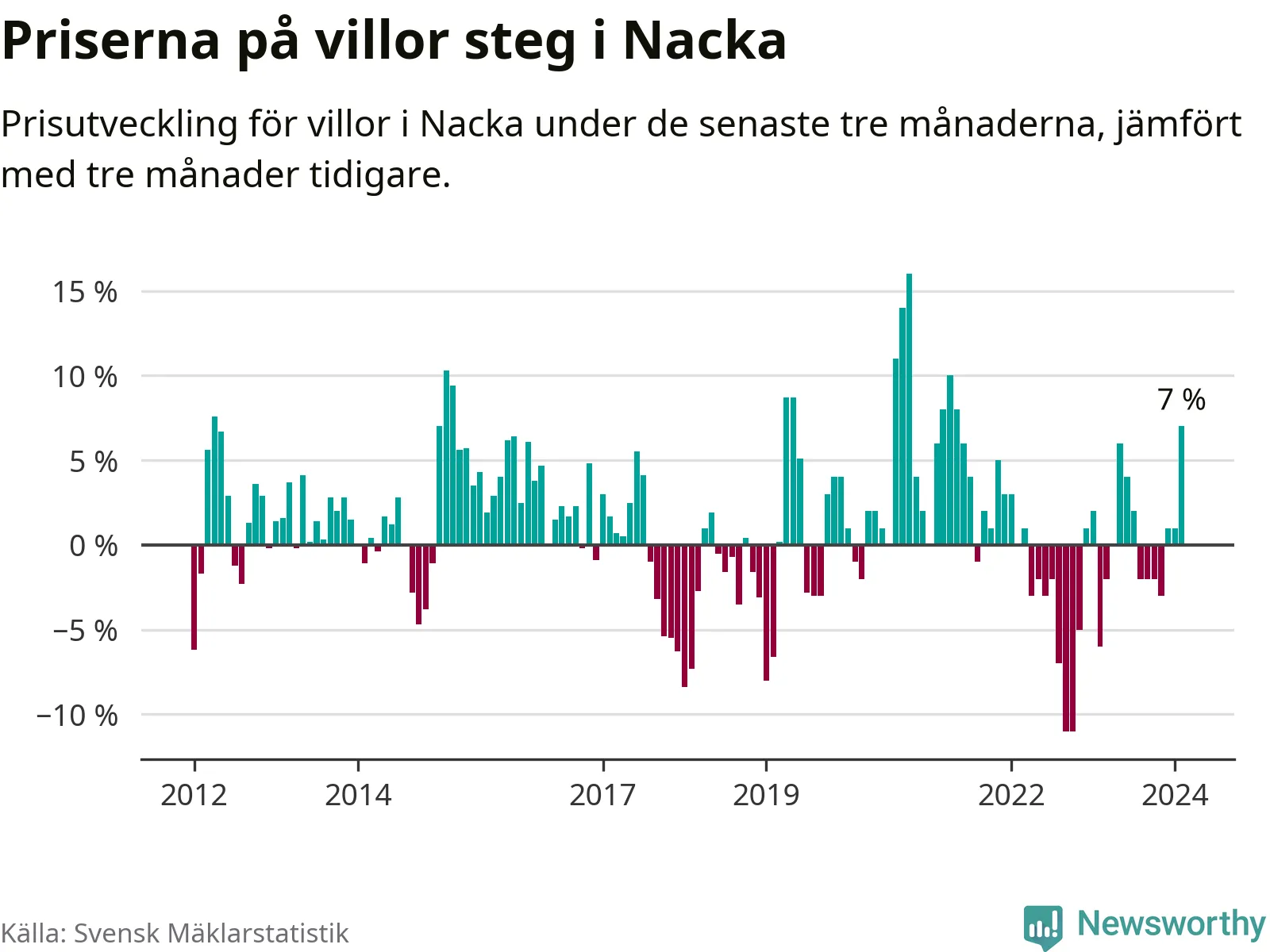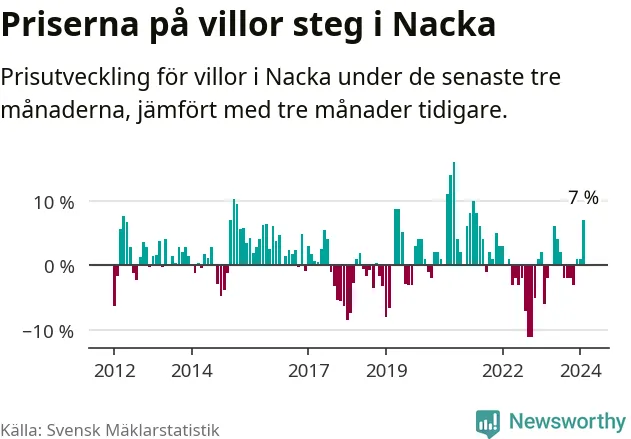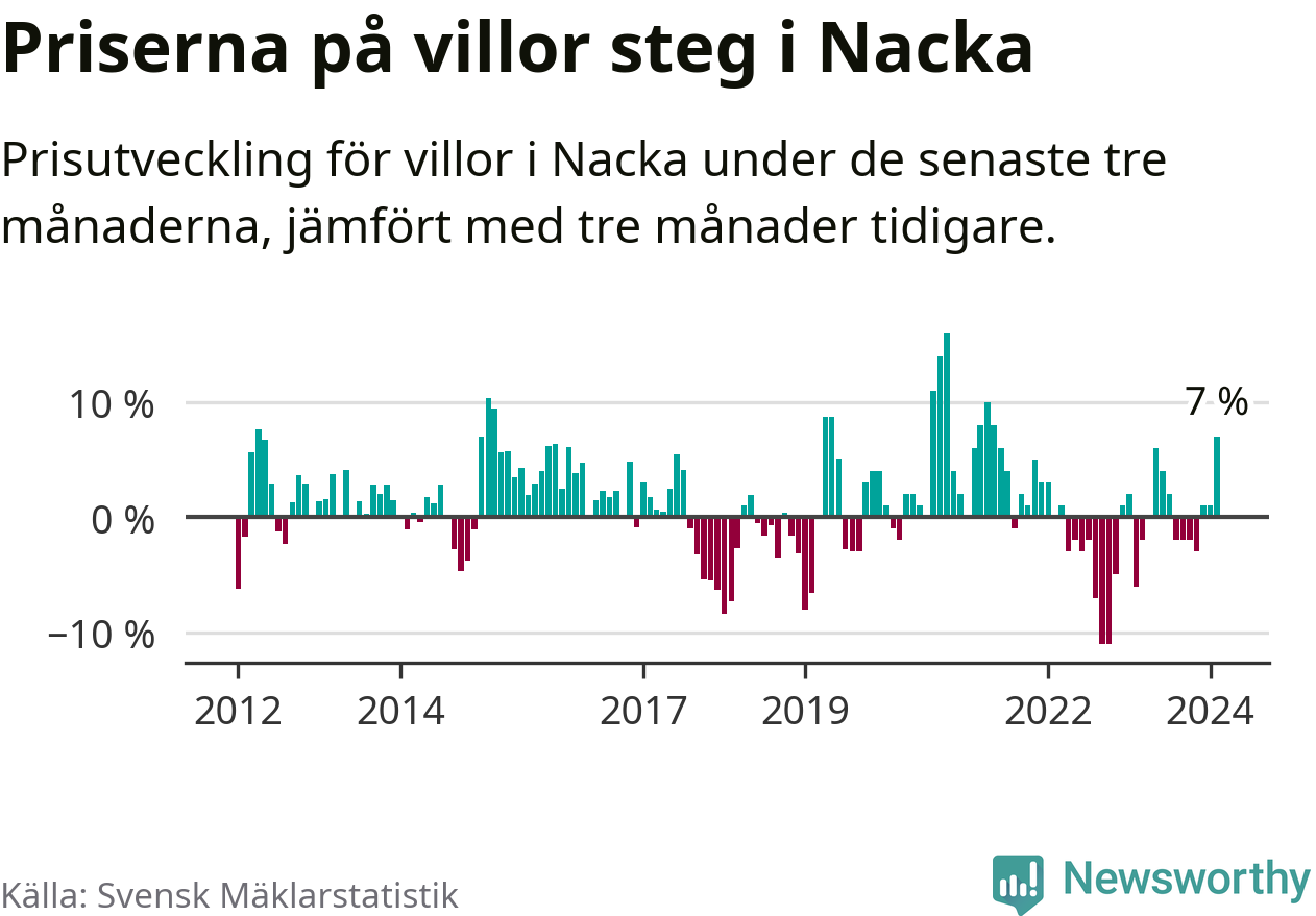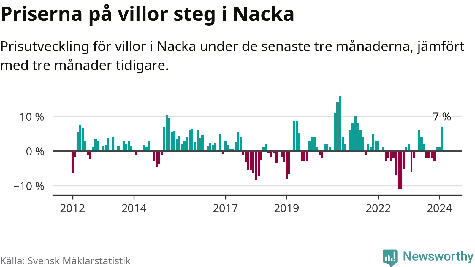 Villapriserna steg mellan december och februari med 7 procent i Nacka kommun. Det är en betydande uppgång jämfört med det gångna året då priserna i snitt ökat med 1 procent.