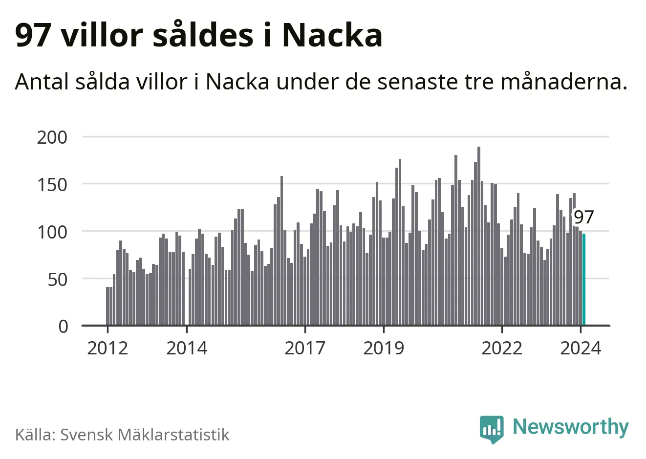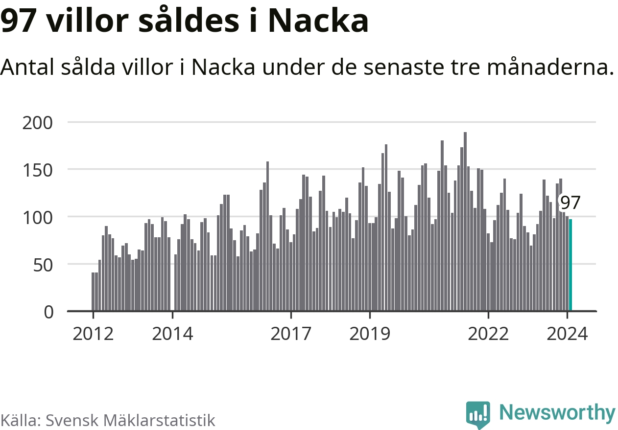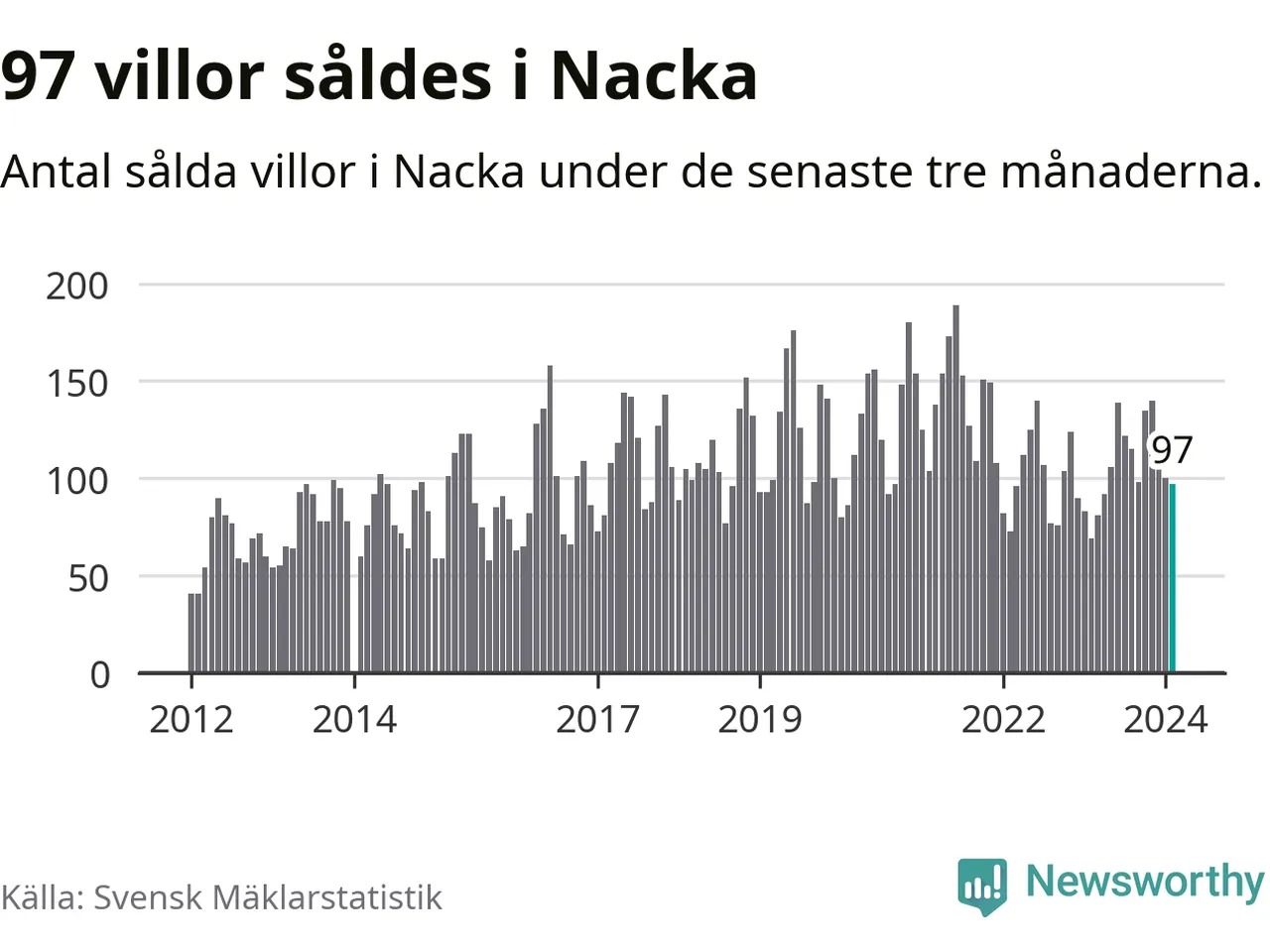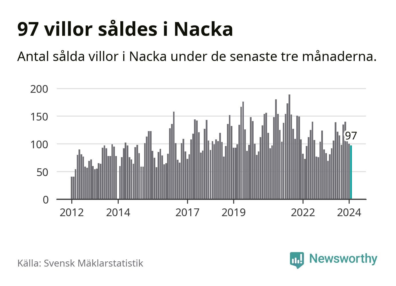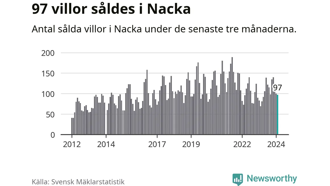 Sammanlagt såldes 97 villor i Nacka kommun mellan december och februari till ett genomsnittligt pris på 9,1 miljoner kronor. I fjol gjordes 69 affärer vid den här tiden på året.
