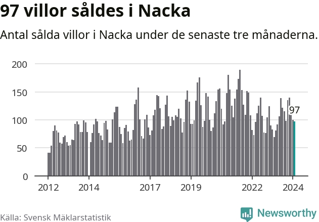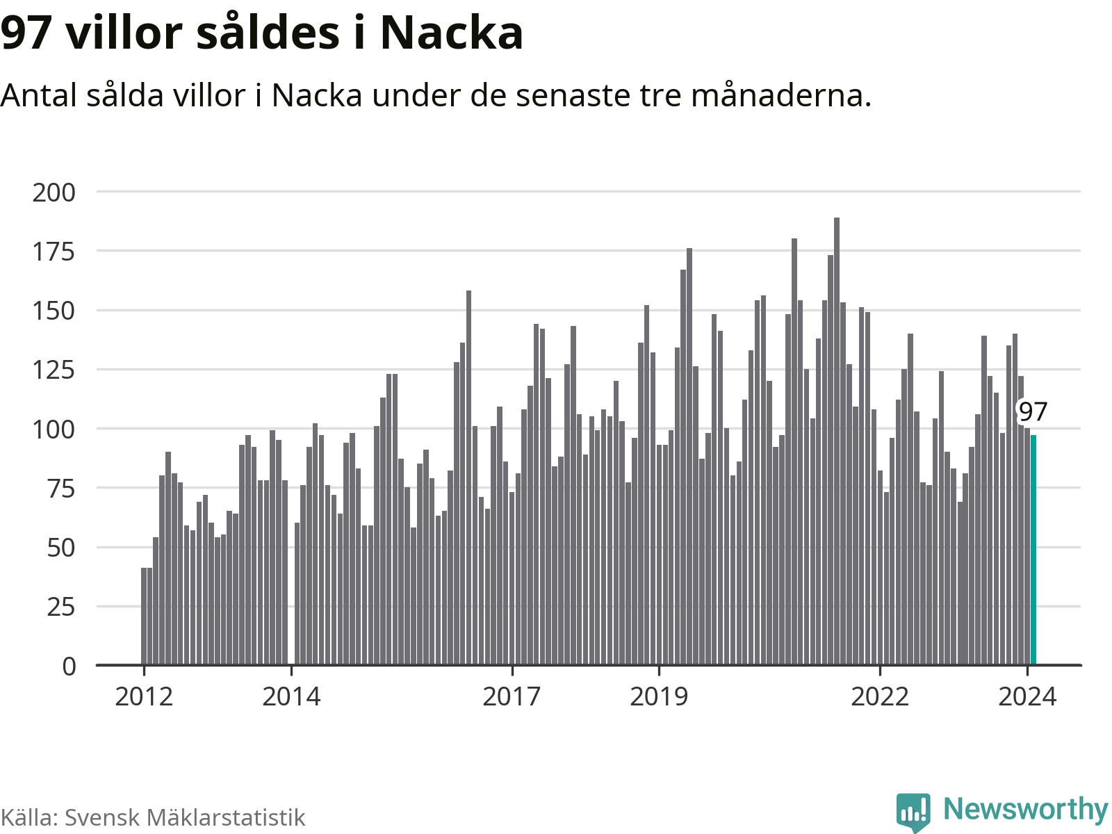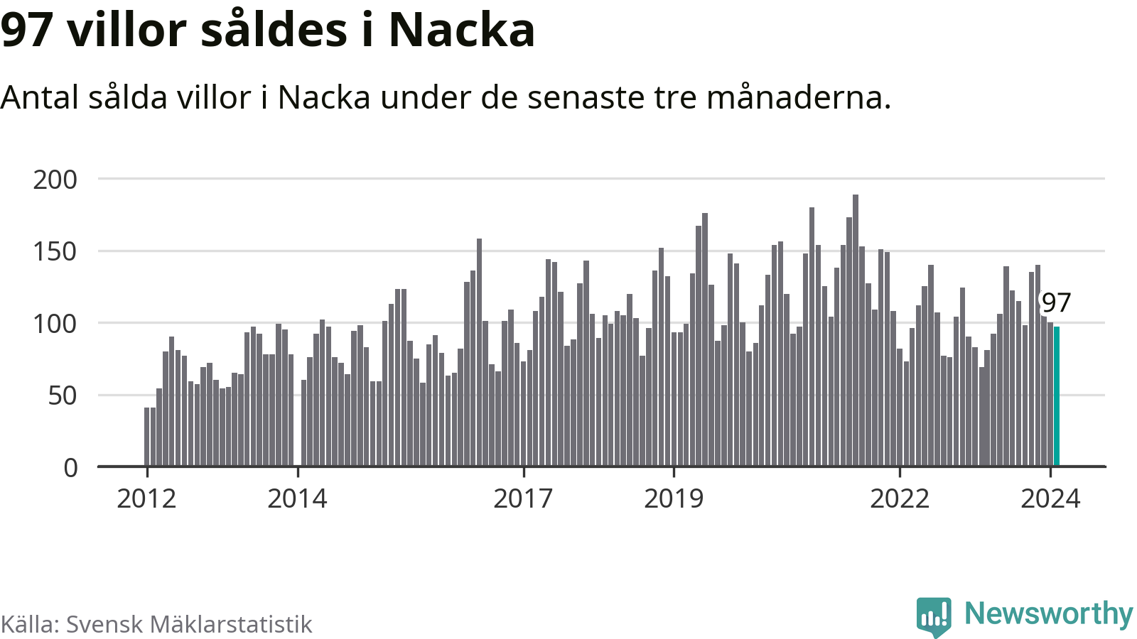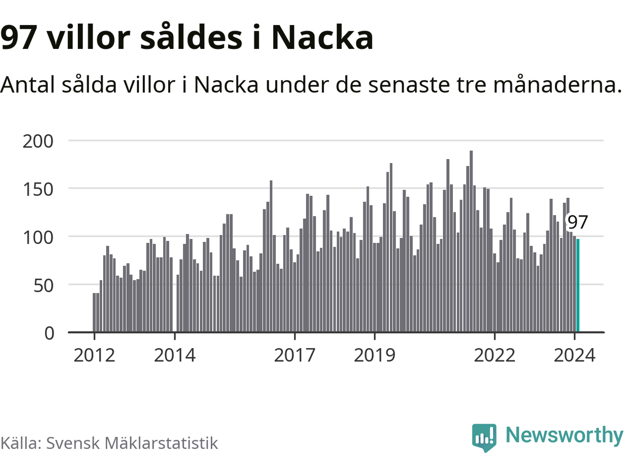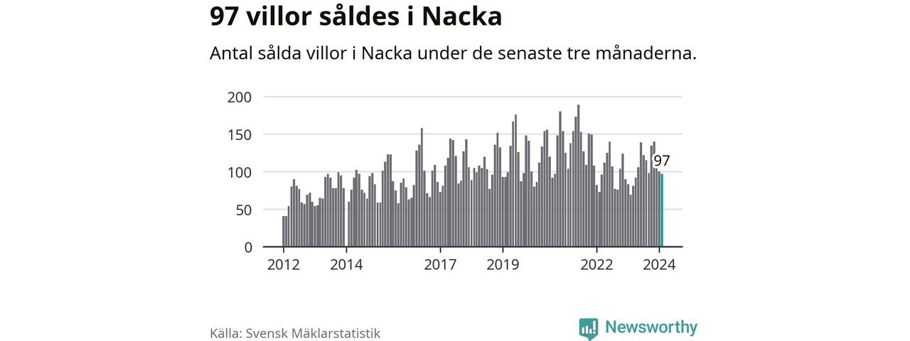 Sammanlagt såldes 97 villor i Nacka kommun mellan december och februari till ett genomsnittligt pris på 9,1 miljoner kronor. I fjol gjordes 69 affärer vid den här tiden på året.