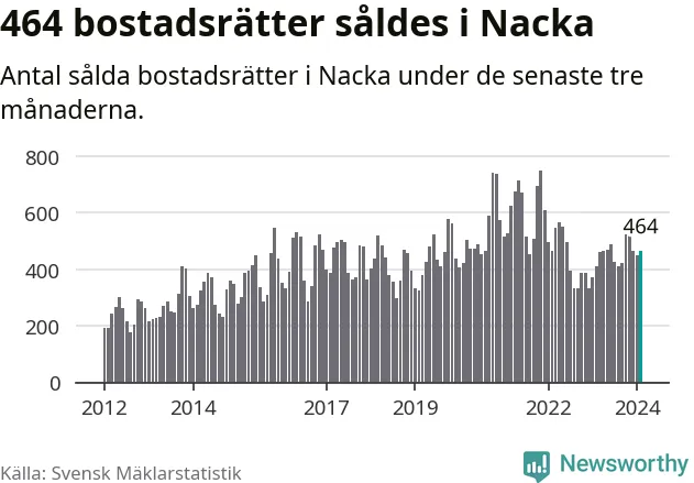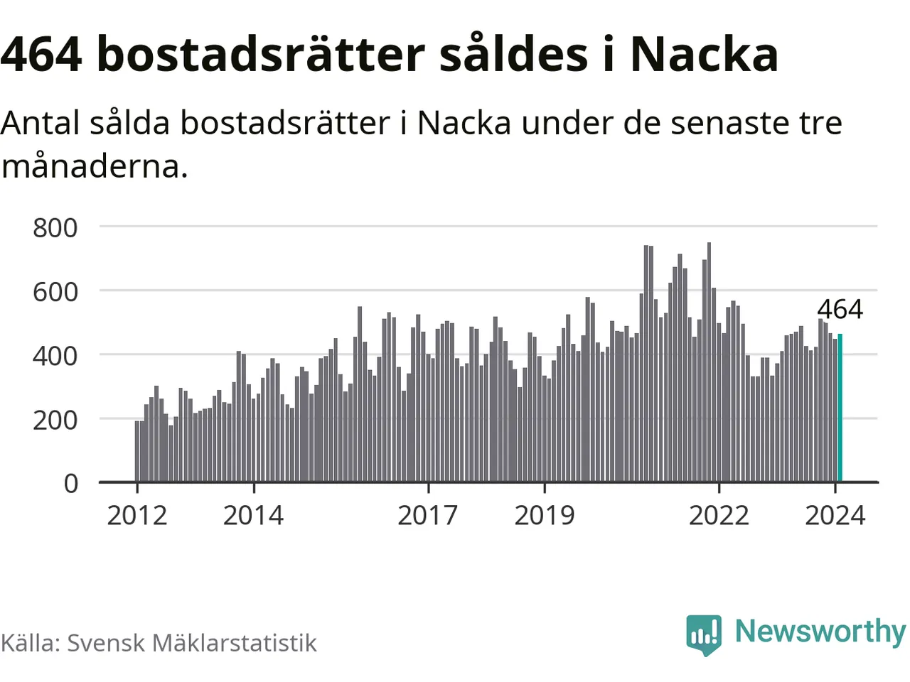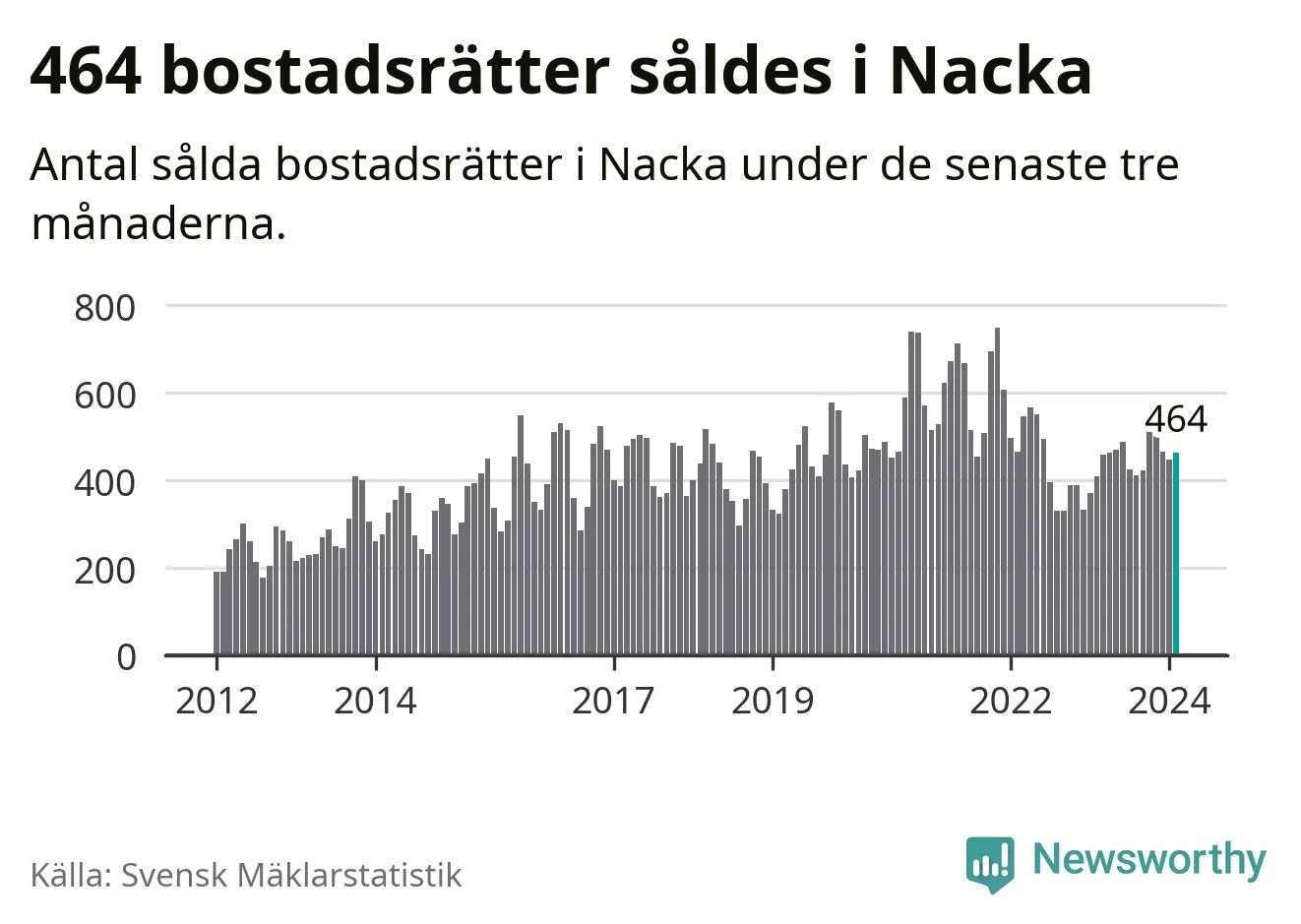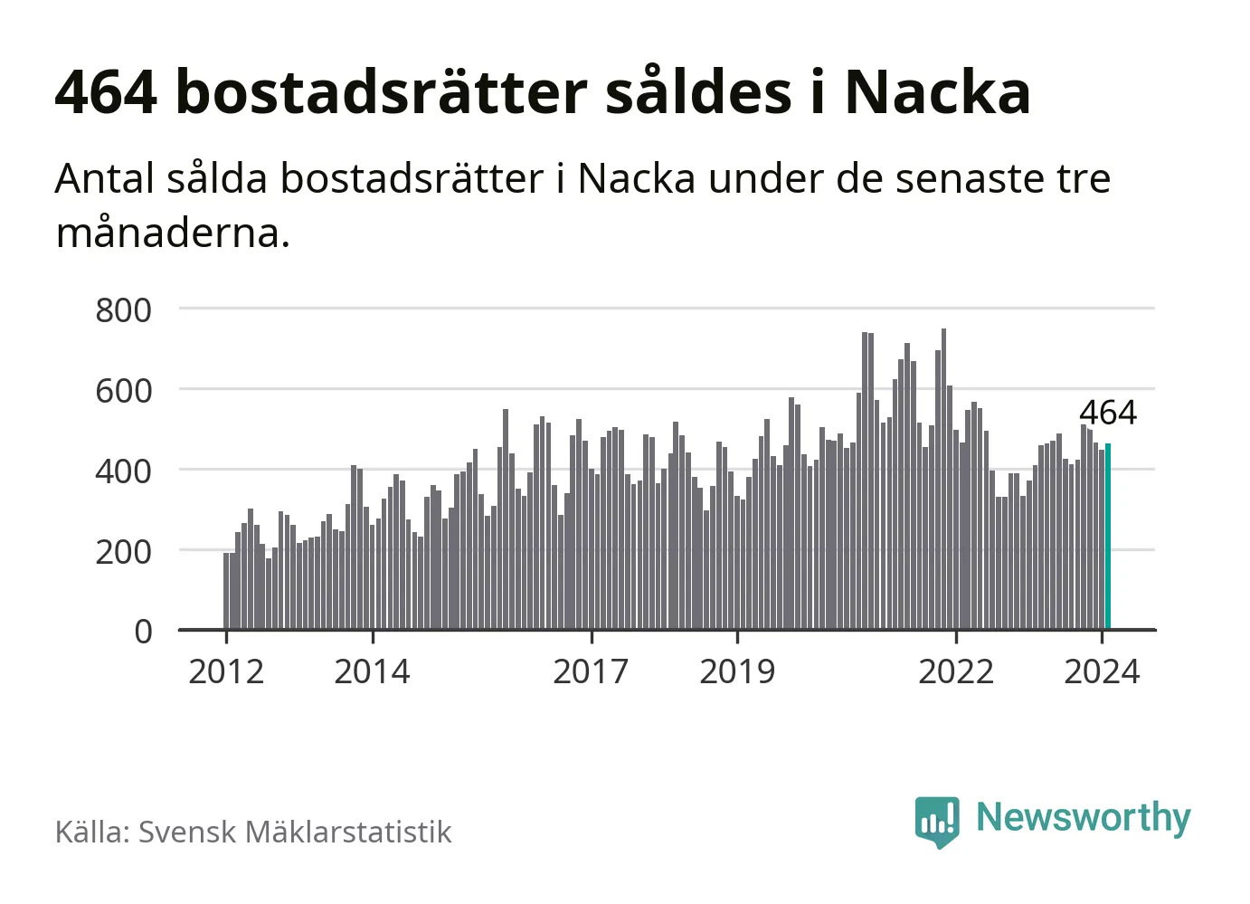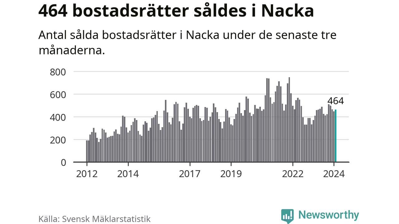 Sammanlagt såldes 464 bostadsrätter i Nacka kommun mellan december och februari till ett genomsnittligt pris på 3,9 miljoner kronor. I fjol gjordes 409 affärer vid den här tiden på året.