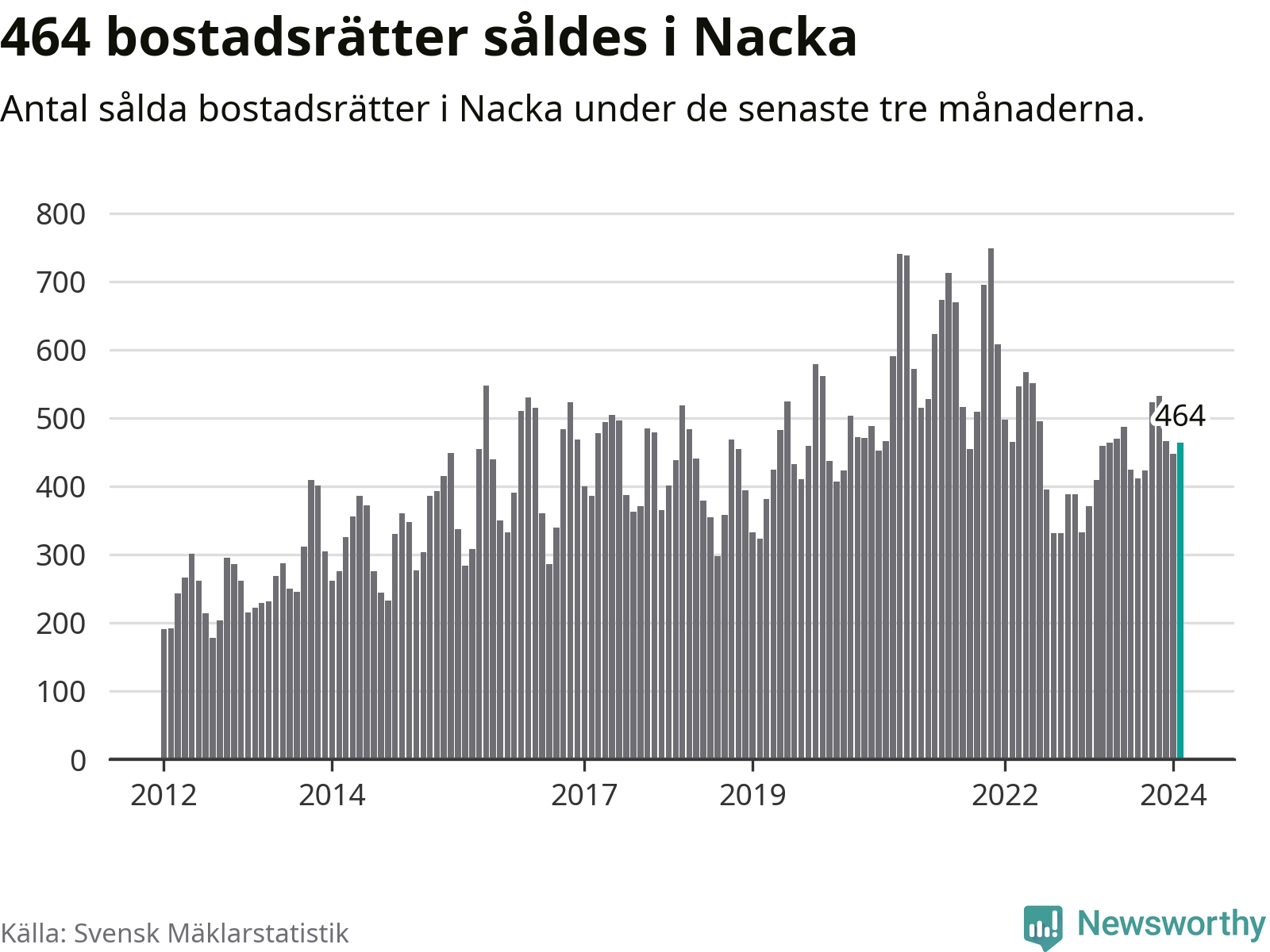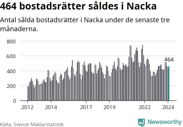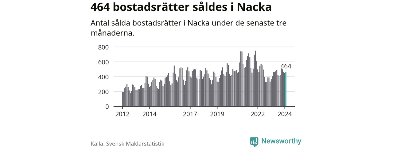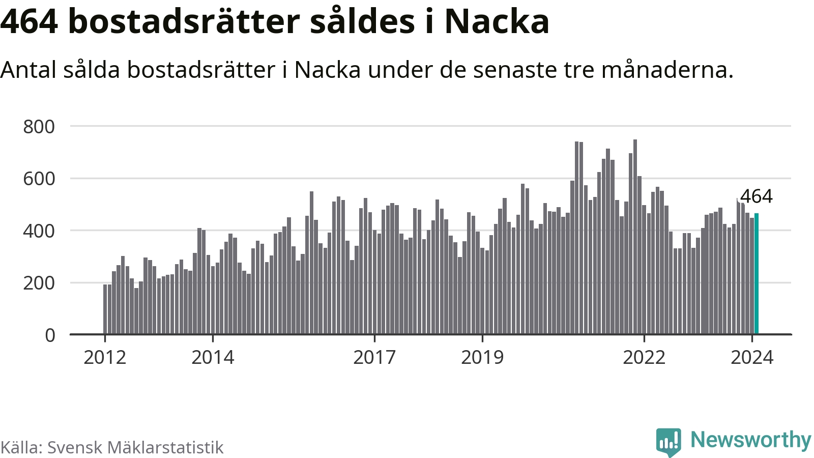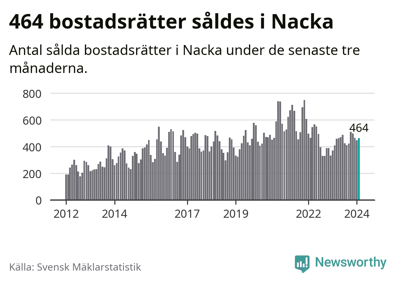 Sammanlagt såldes 464 bostadsrätter i Nacka kommun mellan december och februari till ett genomsnittligt pris på 3,9 miljoner kronor. I fjol gjordes 409 affärer vid den här tiden på året.