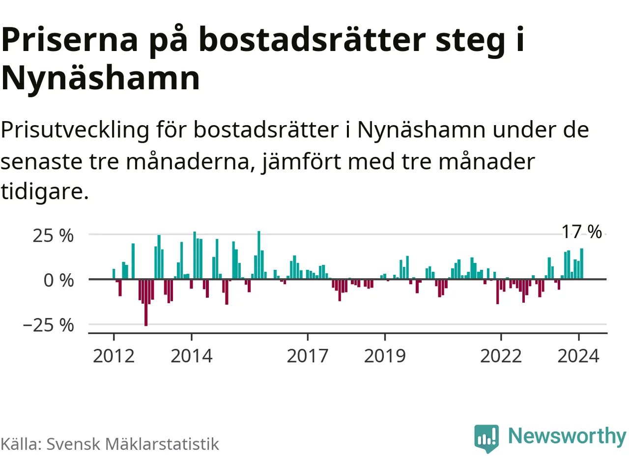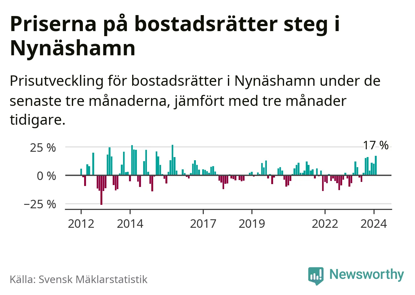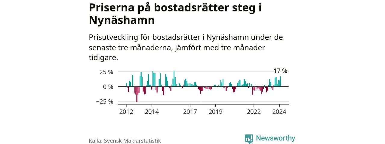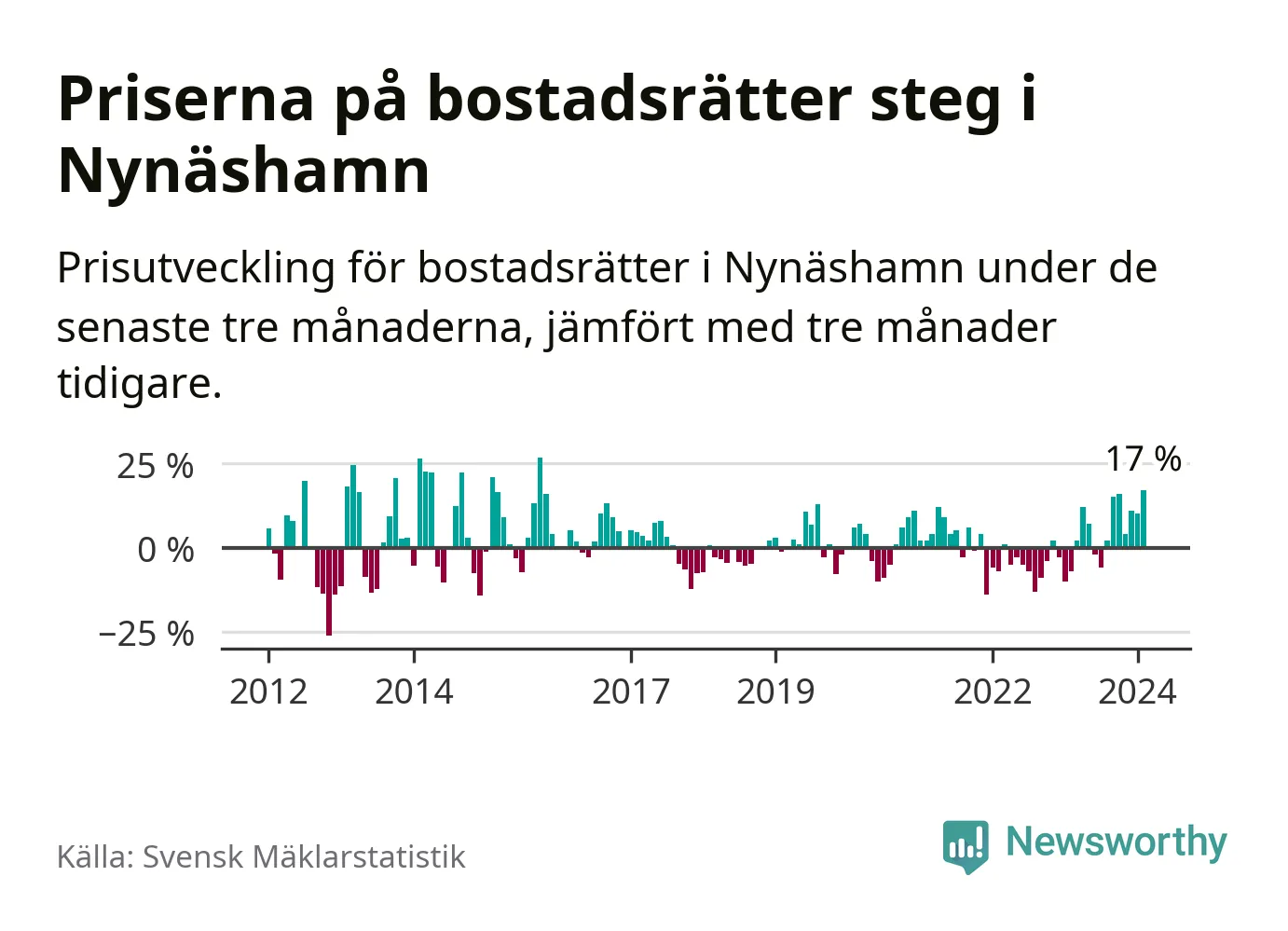 Priserna på bostadsrätter steg med 17 procent i Nynäshamns kommun under de senaste tre månaderna. Det är den starkaste prisutvecklingen sedan 2015.