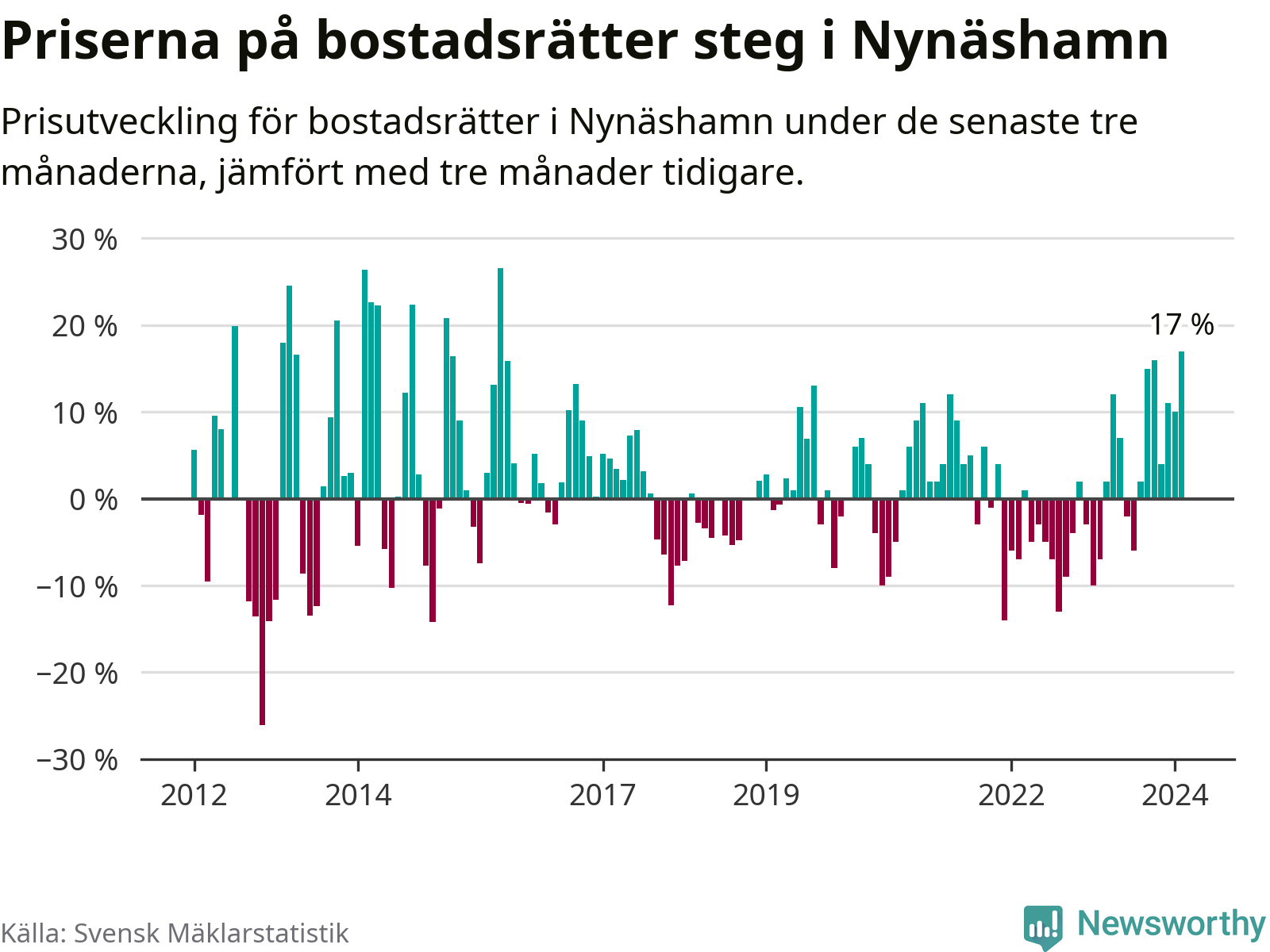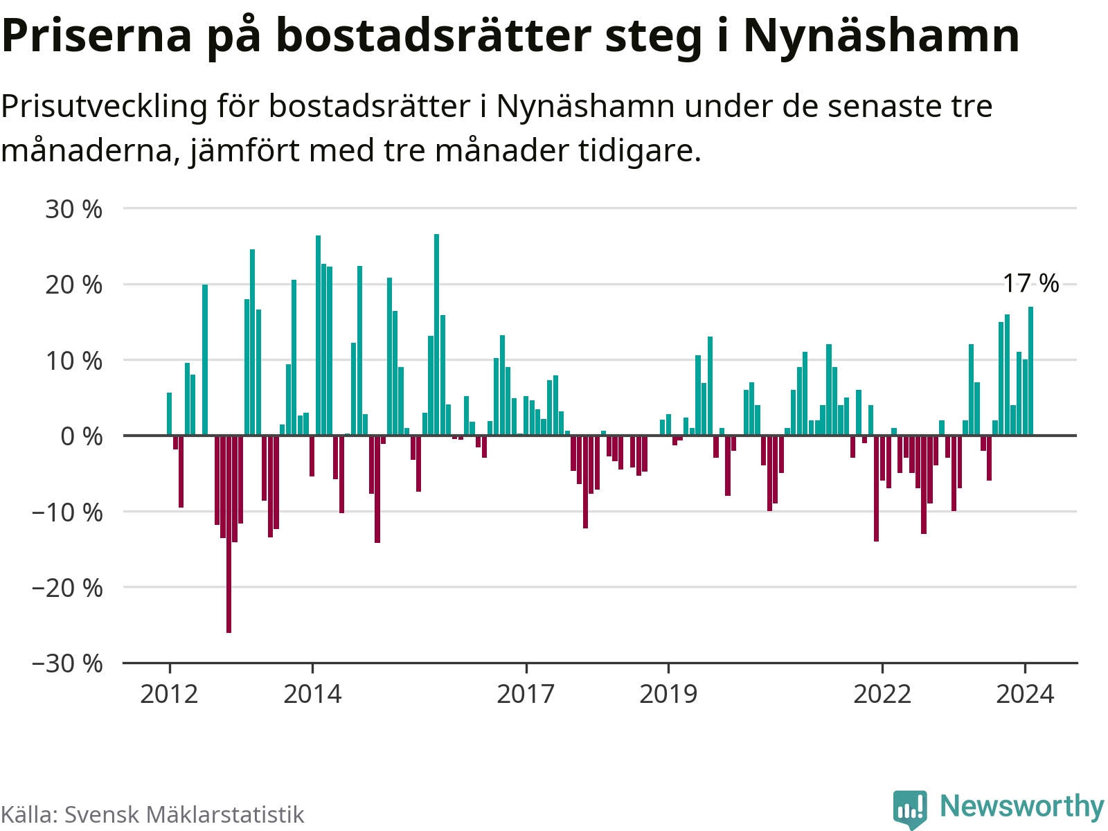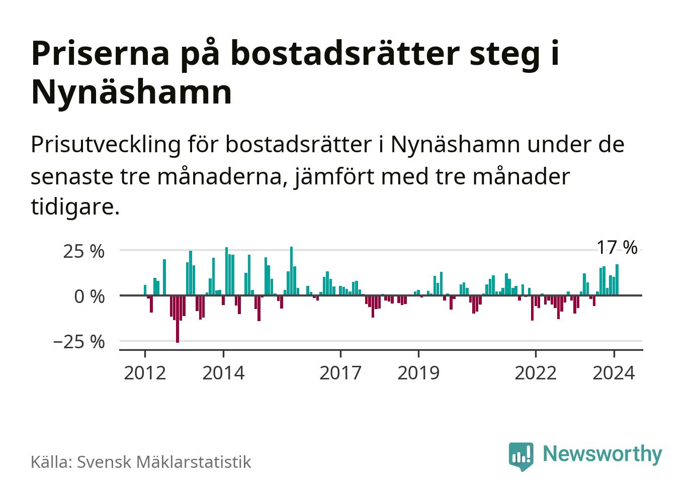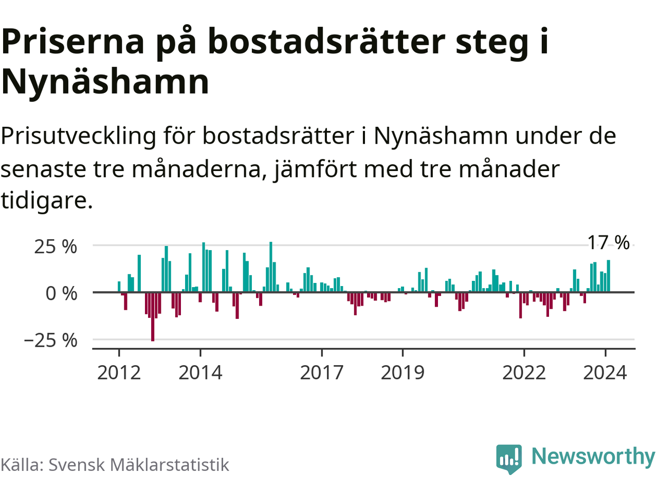 Priserna på bostadsrätter steg med 17 procent i Nynäshamns kommun under de senaste tre månaderna. Det är den starkaste prisutvecklingen sedan 2015.