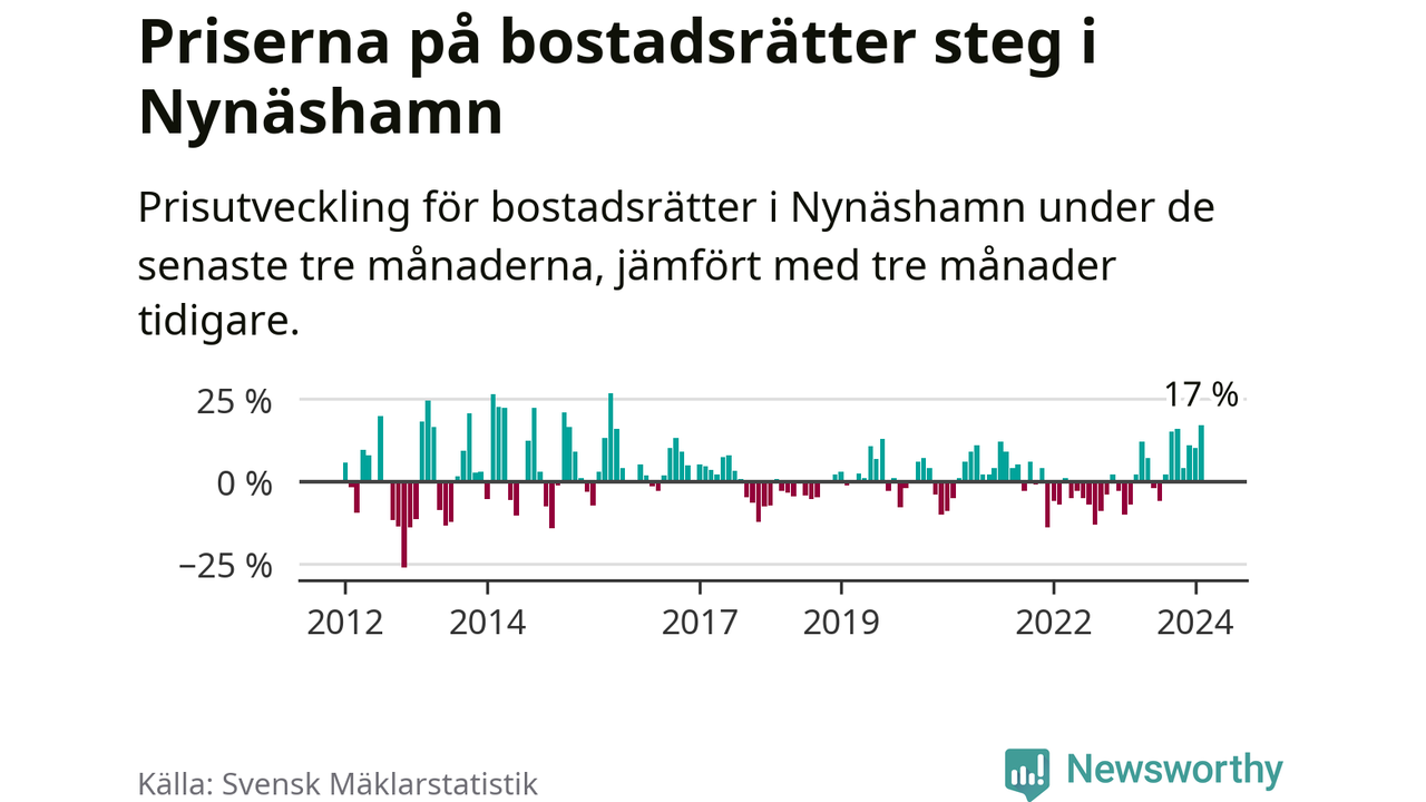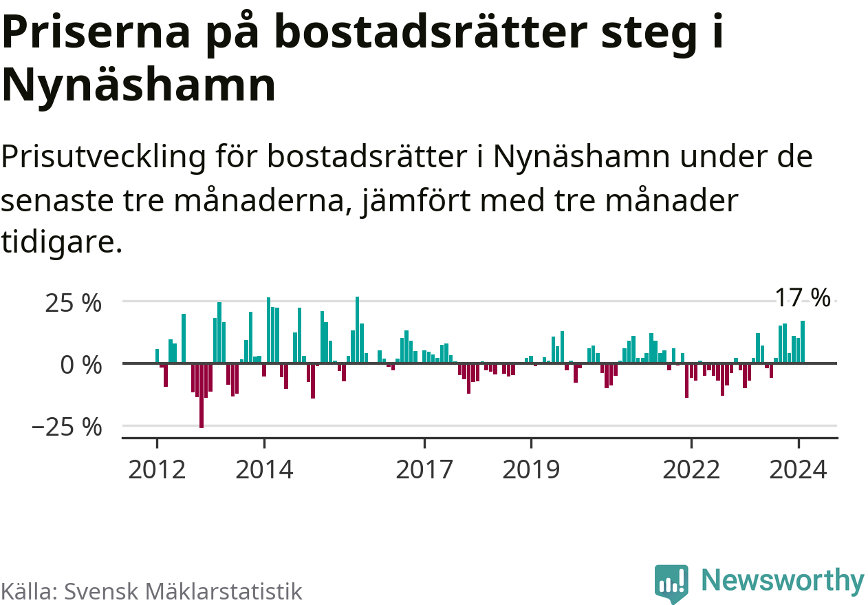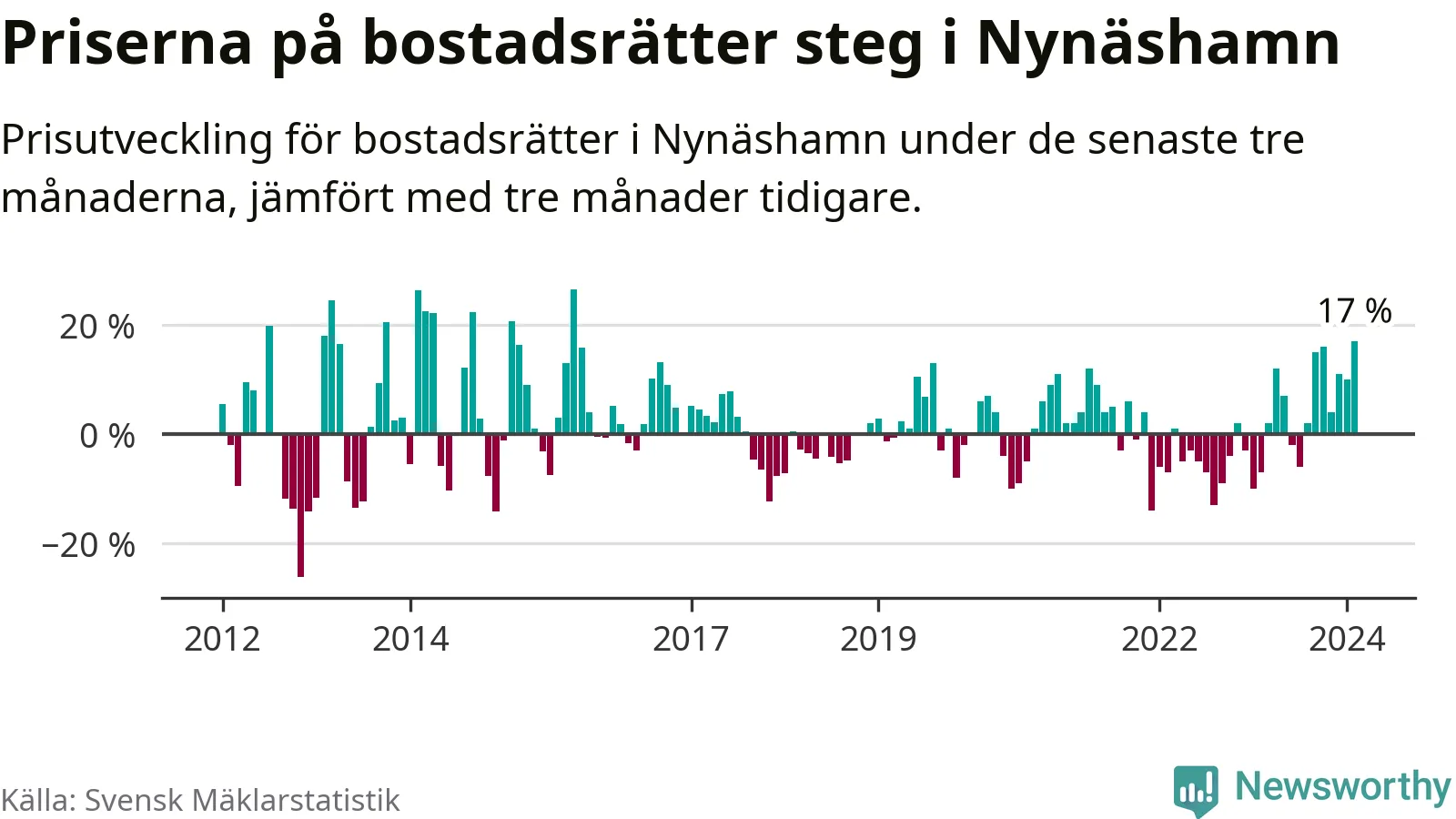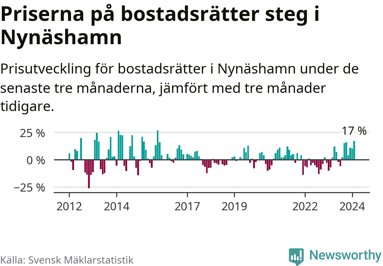 Priserna på bostadsrätter steg med 17 procent i Nynäshamns kommun under de senaste tre månaderna. Det är den starkaste prisutvecklingen sedan 2015.