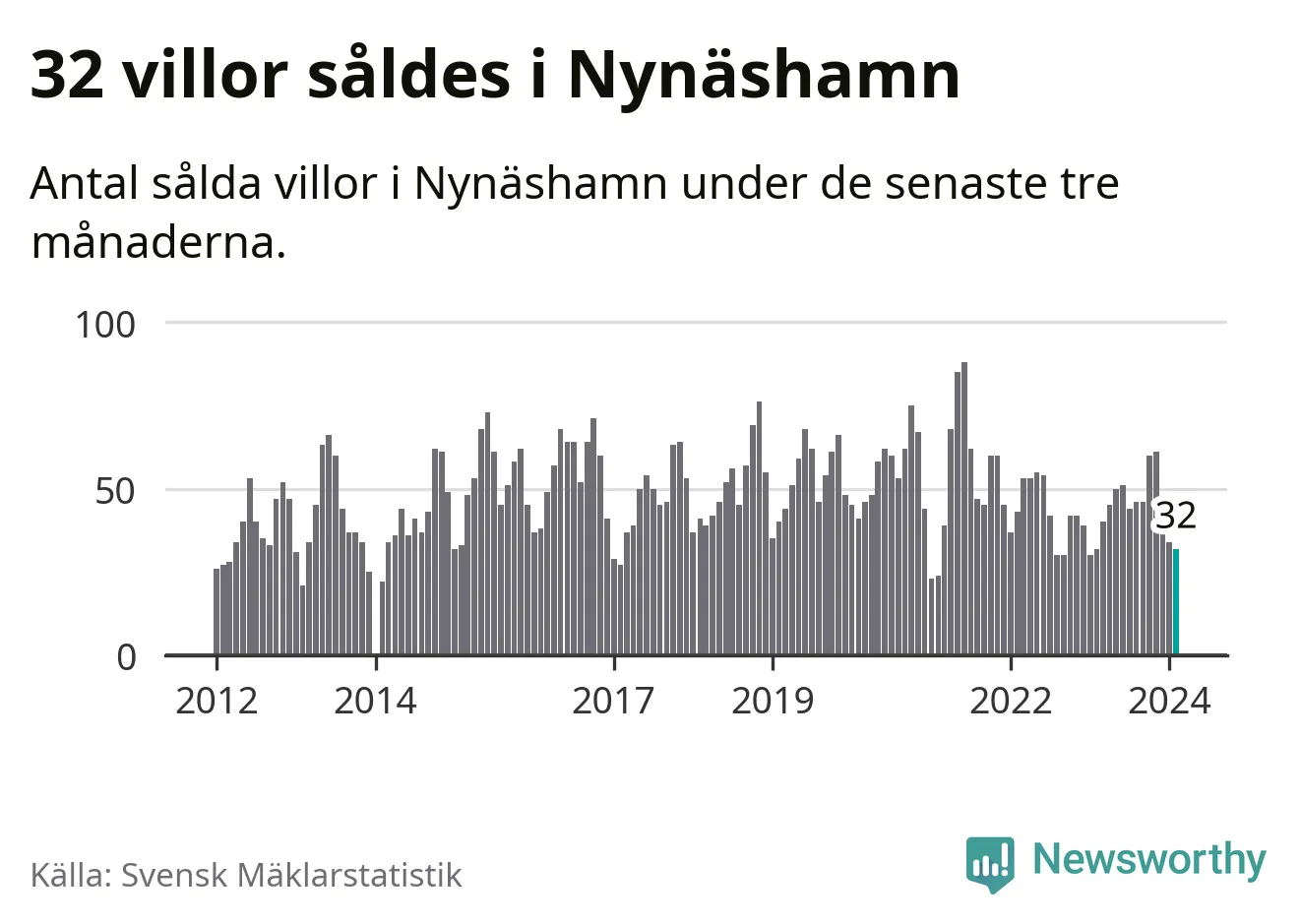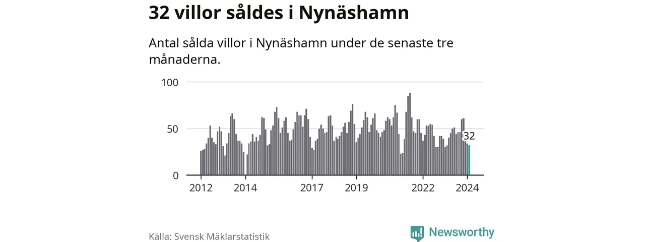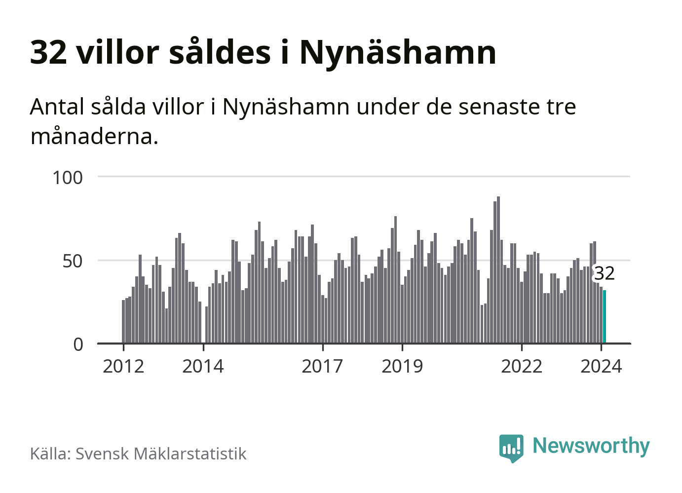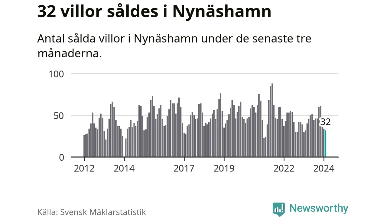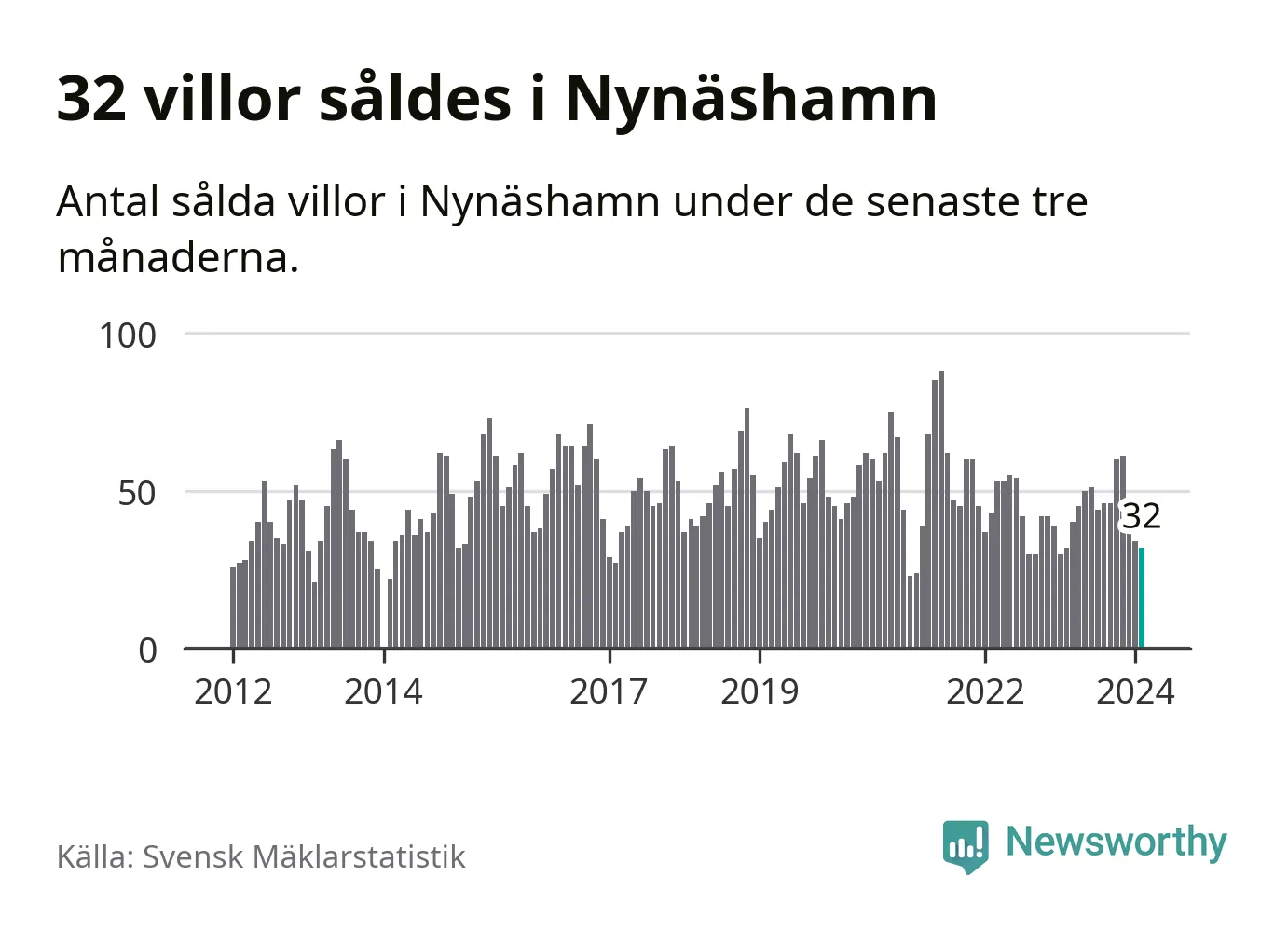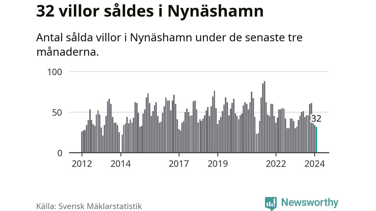 Sammanlagt såldes 32 villor i Nynäshamns kommun mellan december och februari till ett genomsnittligt pris på 3,6 miljoner kronor. I fjol gjordes 32 affärer vid den här tiden på året.