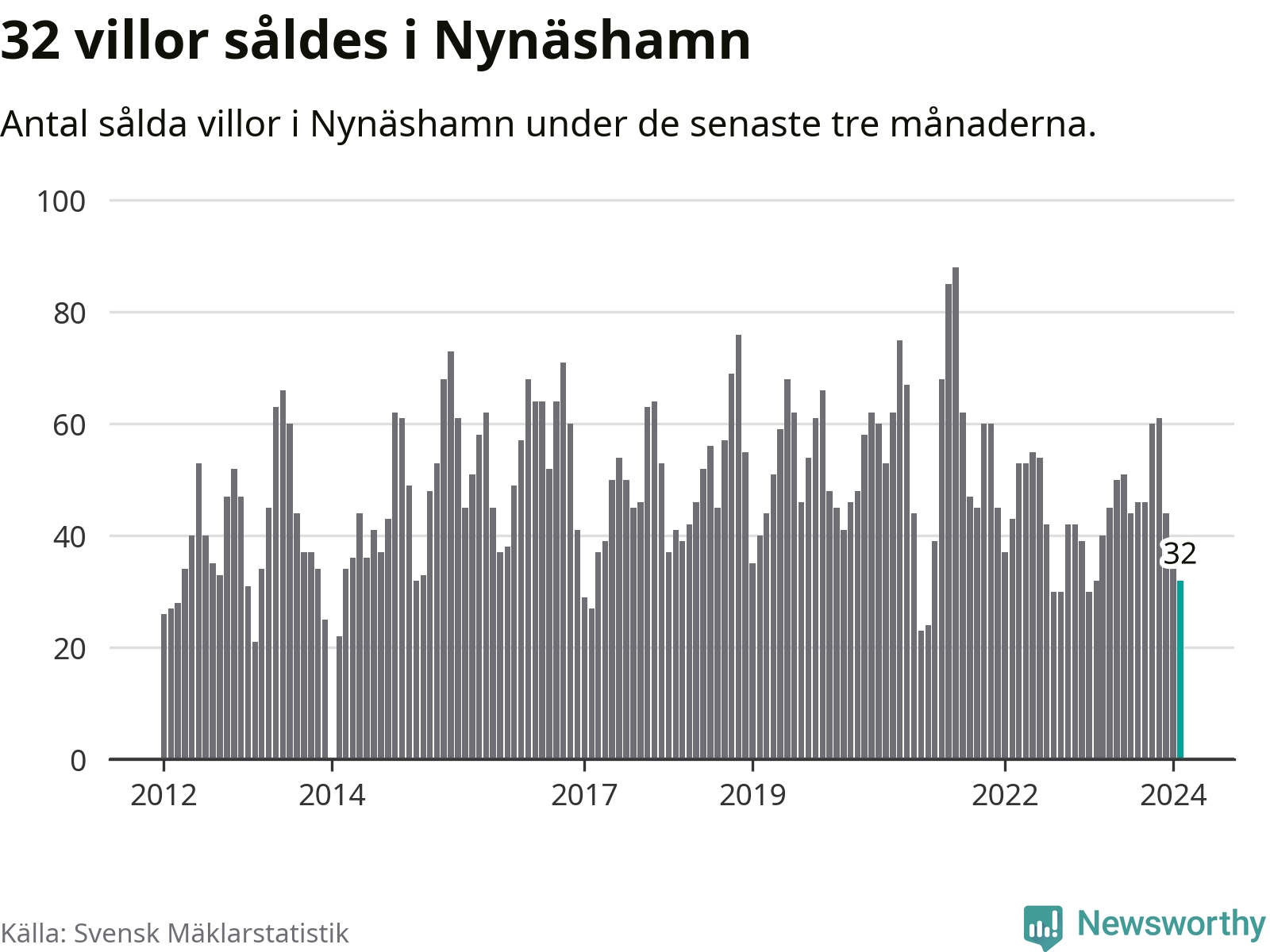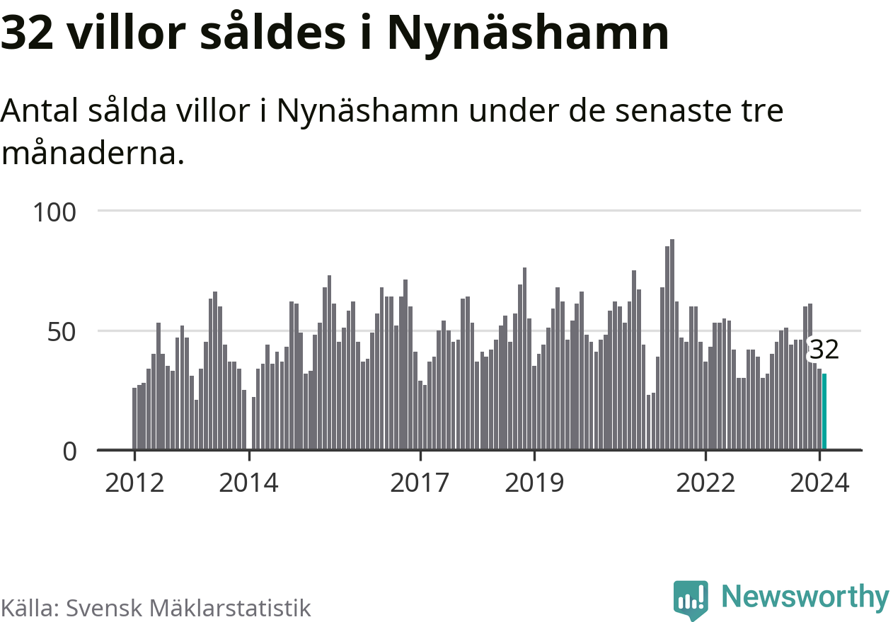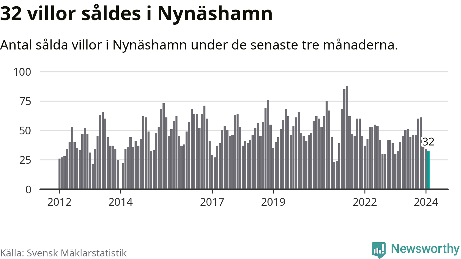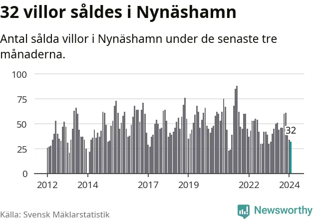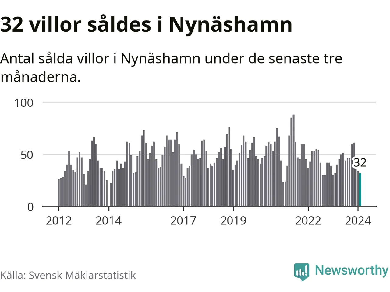 Sammanlagt såldes 32 villor i Nynäshamns kommun mellan december och februari till ett genomsnittligt pris på 3,6 miljoner kronor. I fjol gjordes 32 affärer vid den här tiden på året.