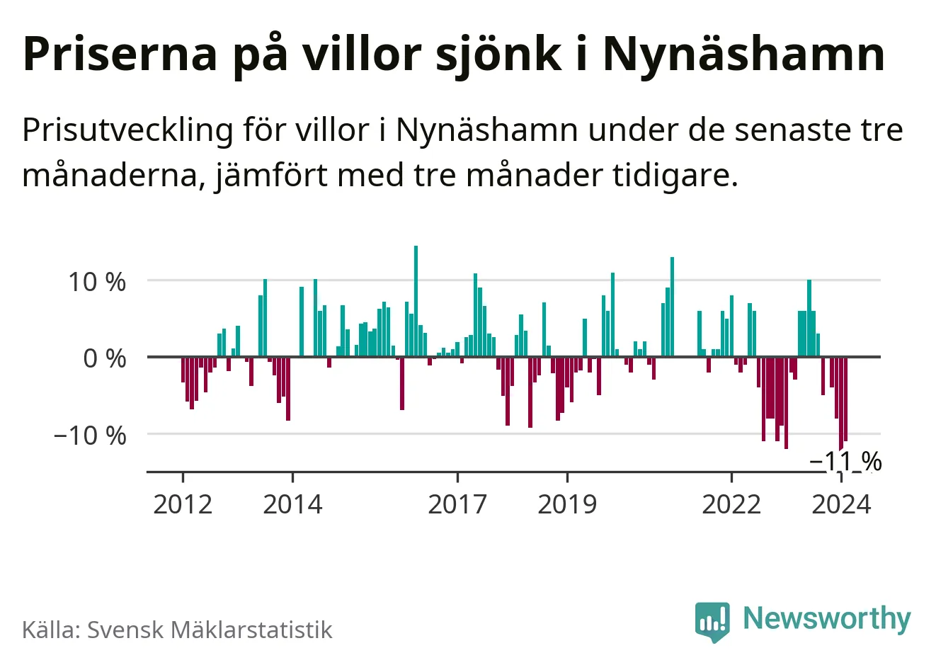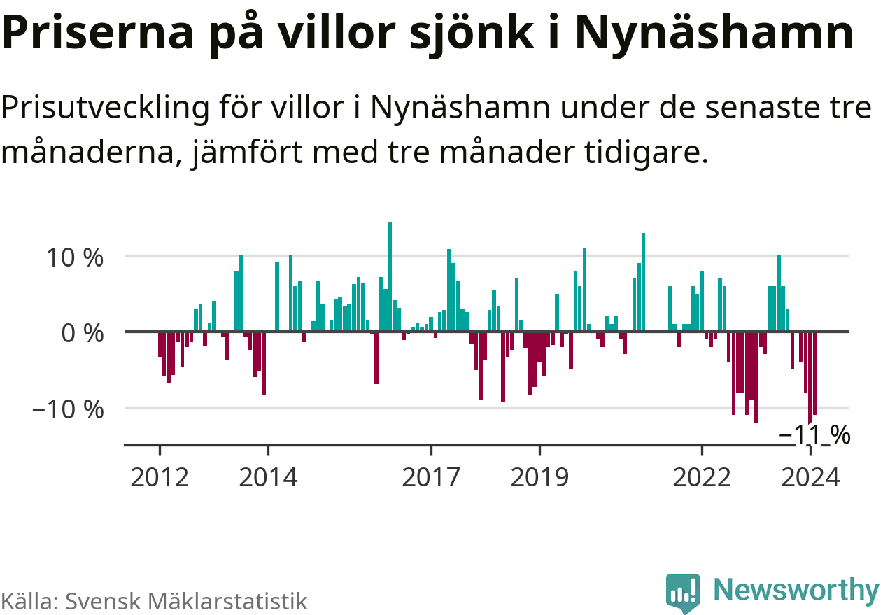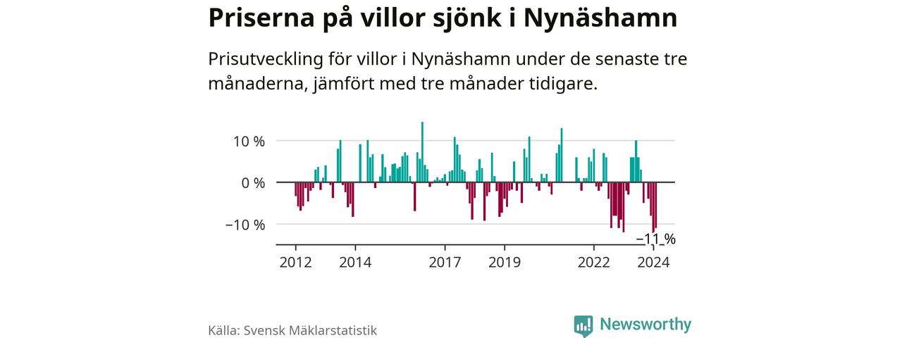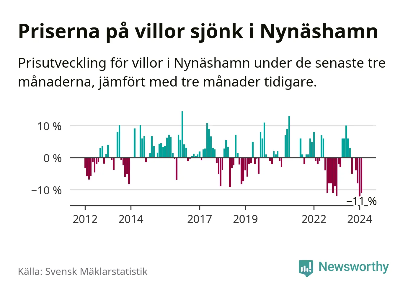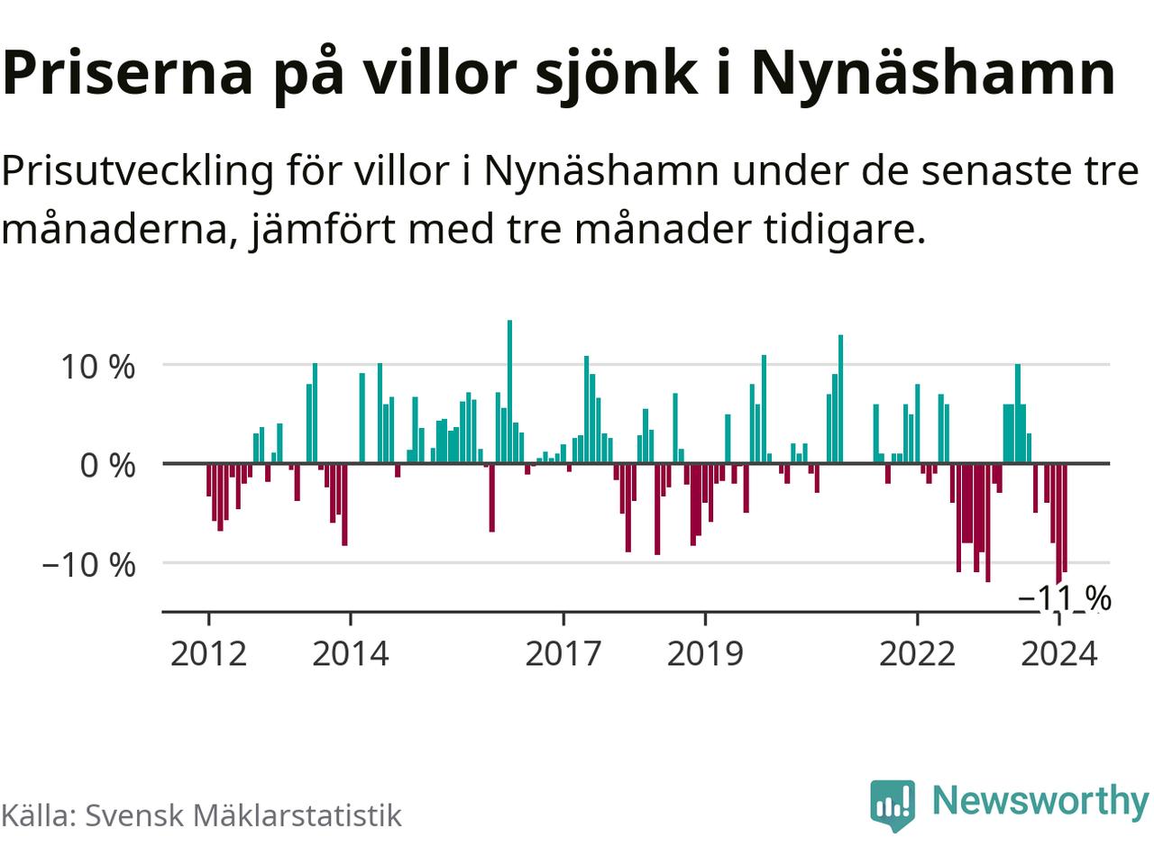 Villapriserna sjönk mellan december och februari med 11 procent i Nynäshamns kommun. Det är en betydande nedgång jämfört med det gångna året då priserna i snitt sjunkit med 1 procent.