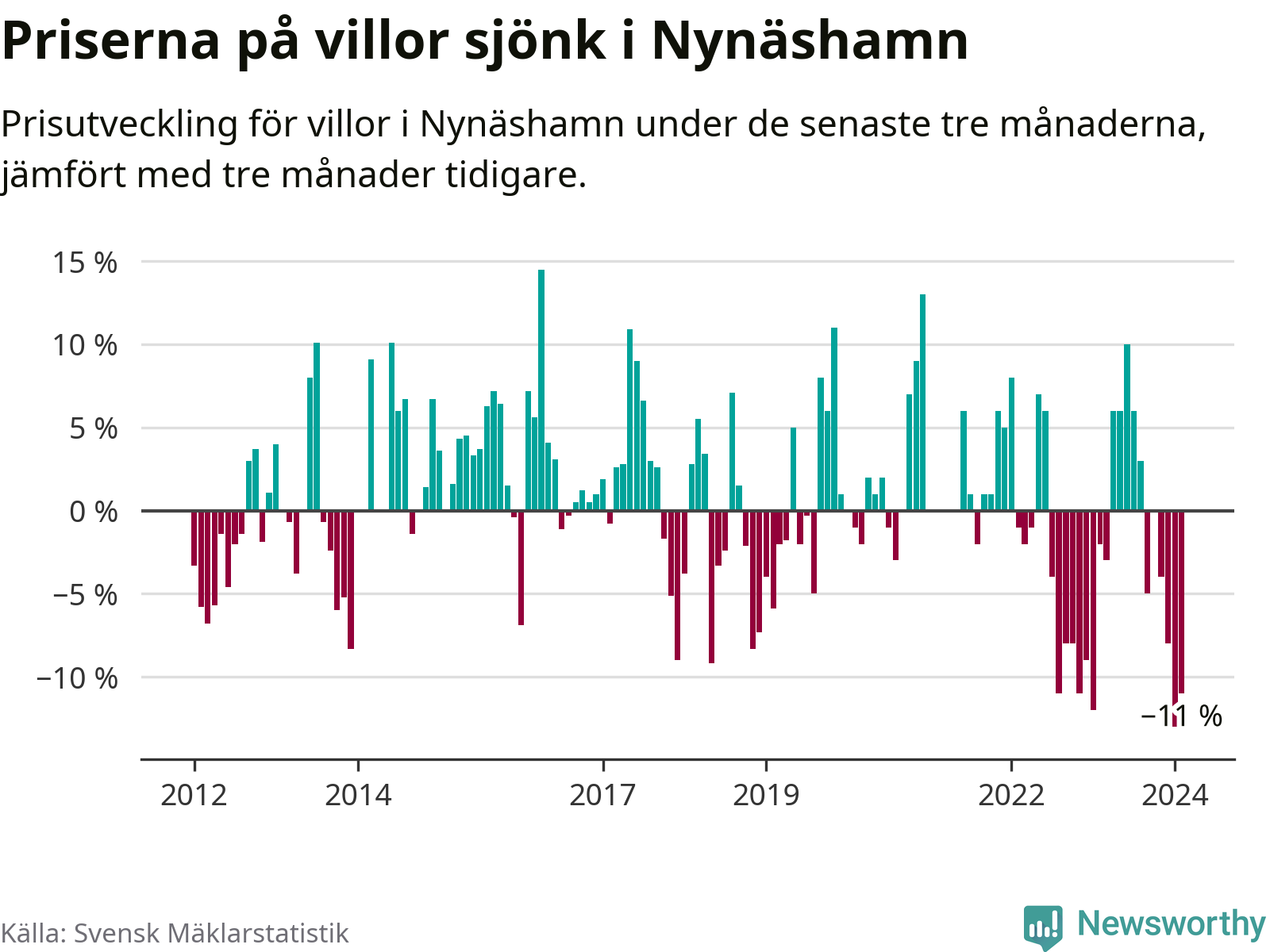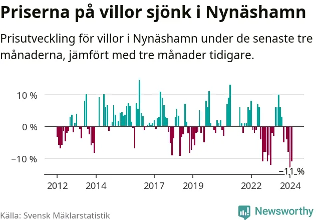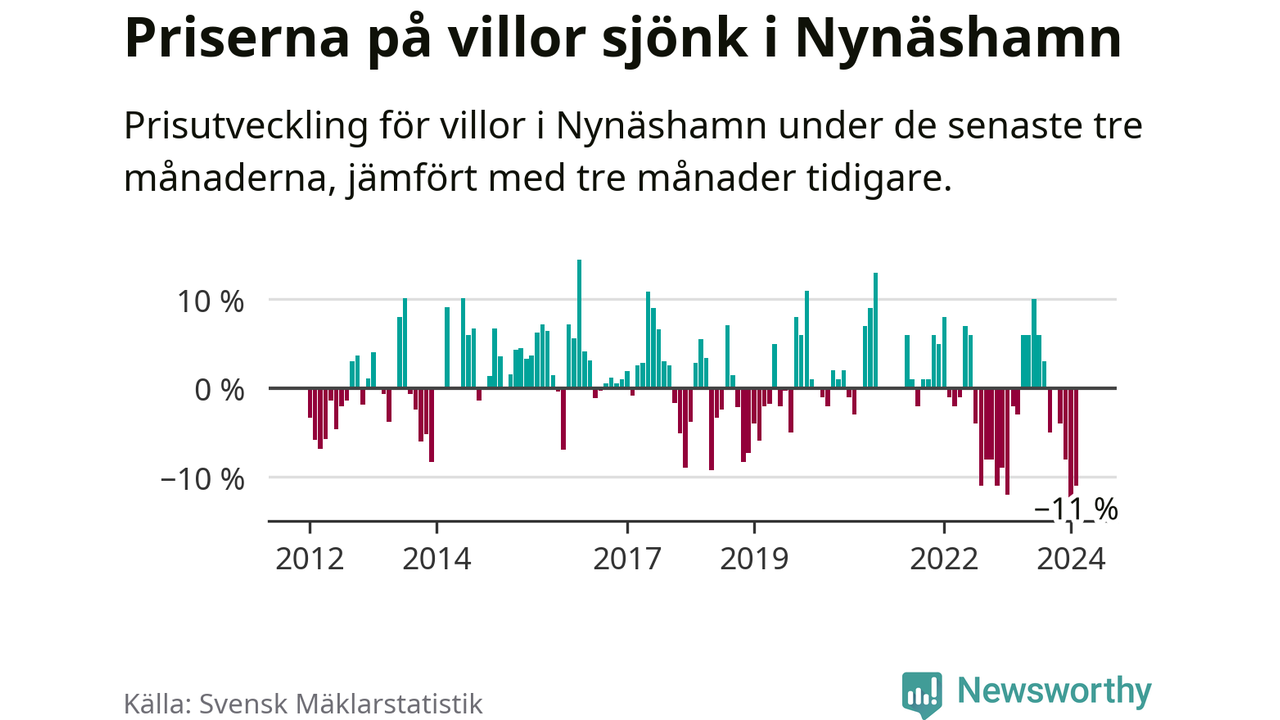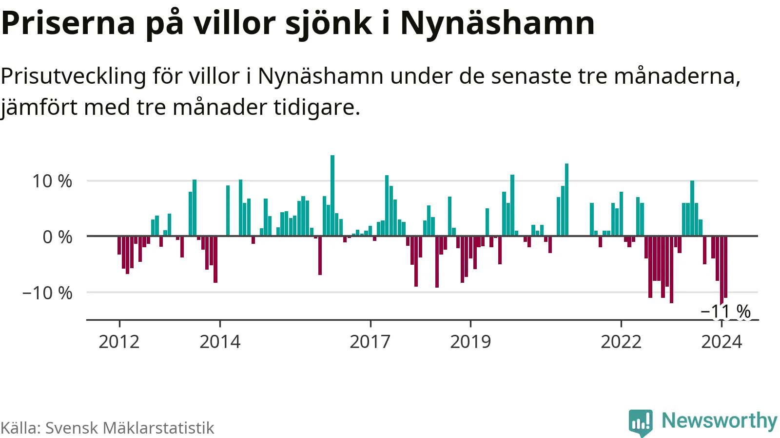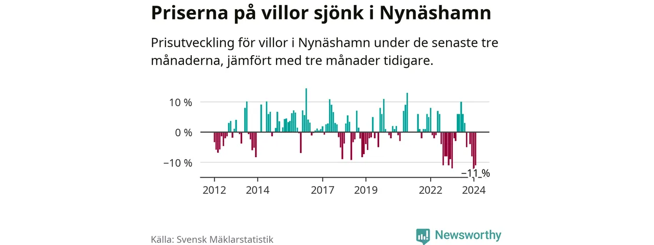 Villapriserna sjönk mellan december och februari med 11 procent i Nynäshamns kommun. Det är en betydande nedgång jämfört med det gångna året då priserna i snitt sjunkit med 1 procent.