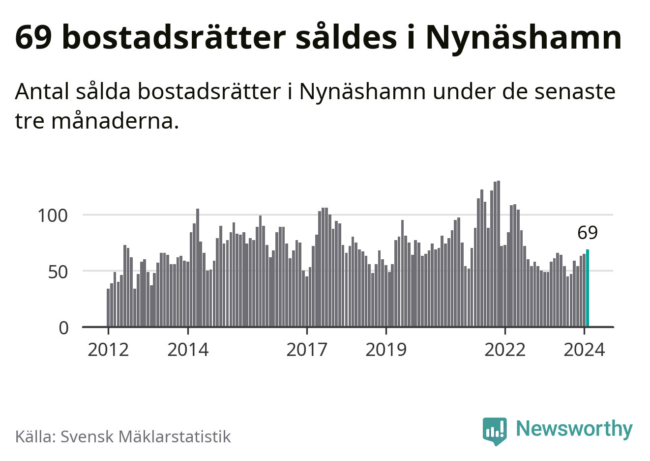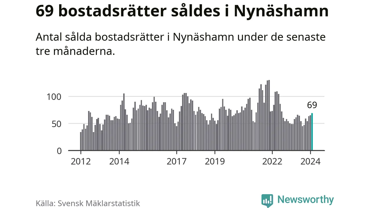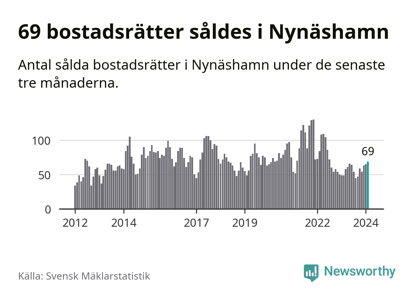 Sammanlagt såldes 69 bostadsrätter i Nynäshamns kommun mellan december och februari till ett genomsnittligt pris på 2,4 miljoner kronor. I fjol gjordes 49 affärer vid den här tiden på året.