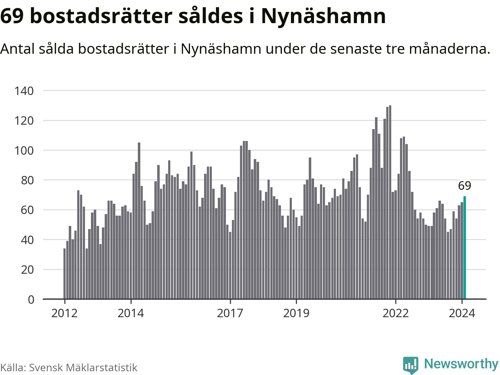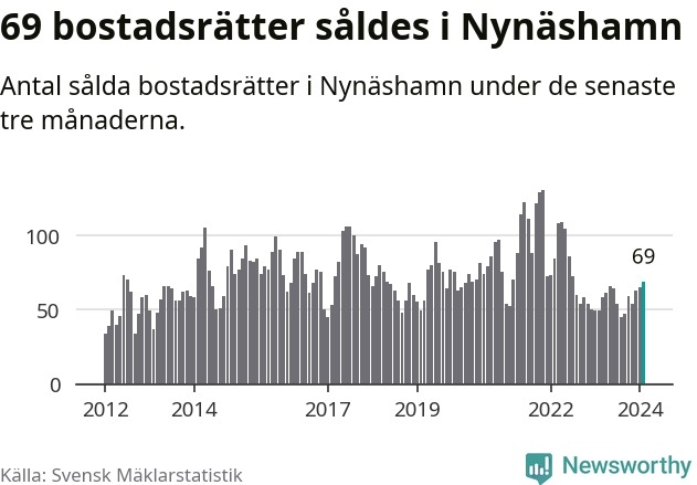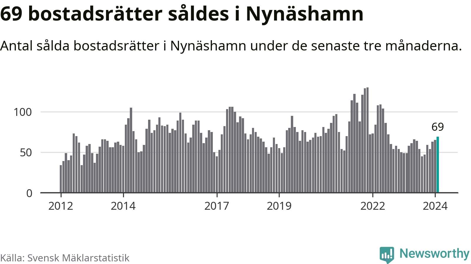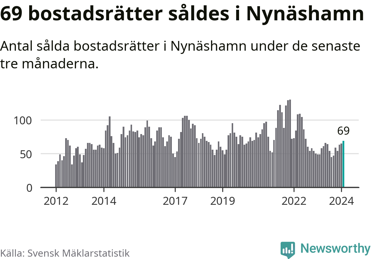 Sammanlagt såldes 69 bostadsrätter i Nynäshamns kommun mellan december och februari till ett genomsnittligt pris på 2,4 miljoner kronor. I fjol gjordes 49 affärer vid den här tiden på året.