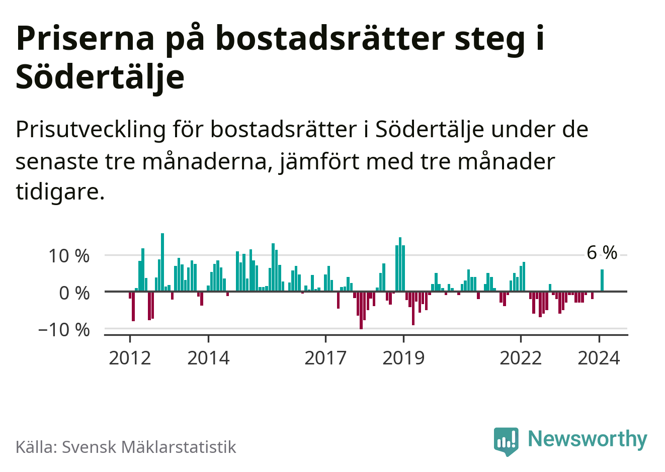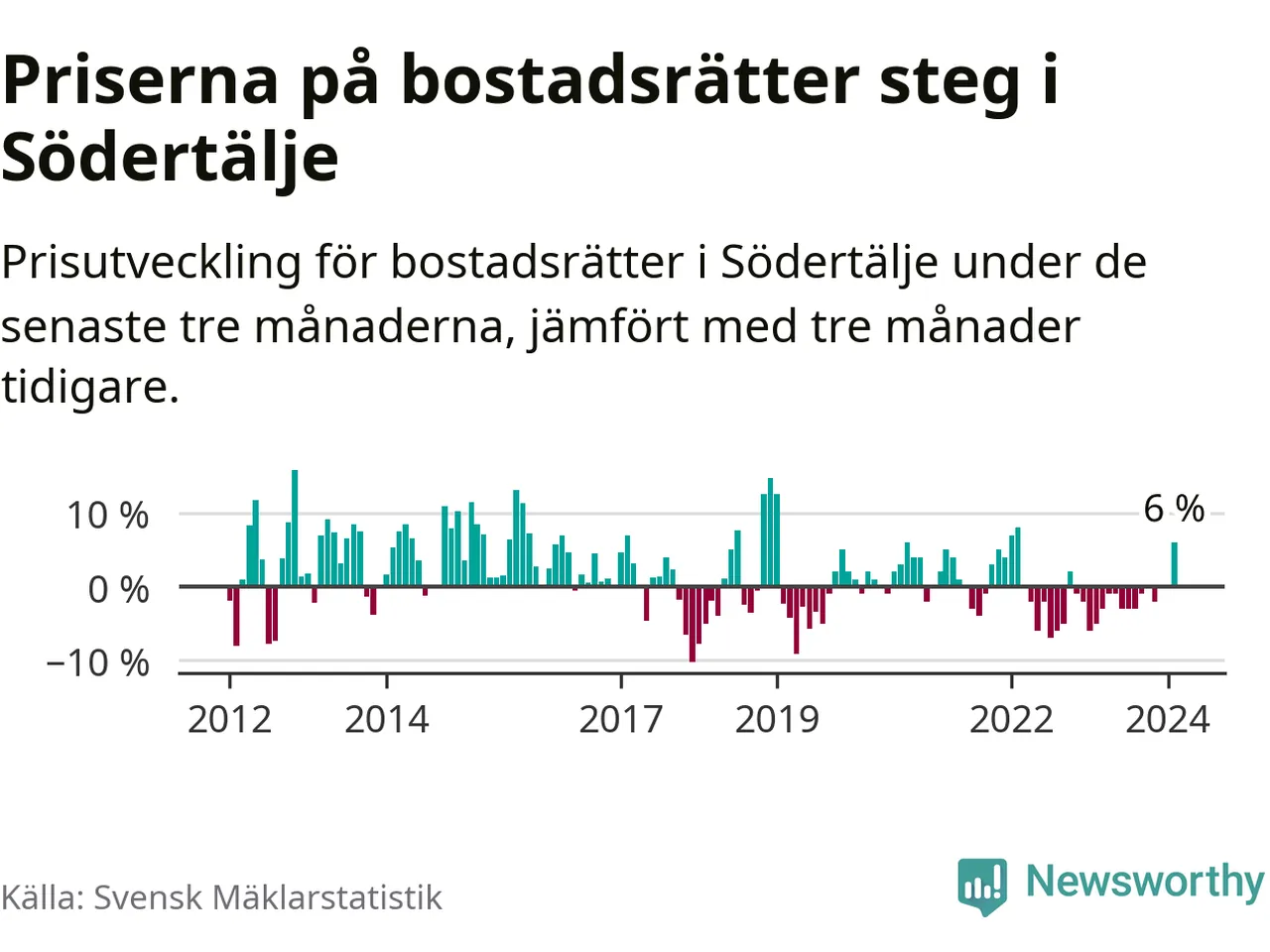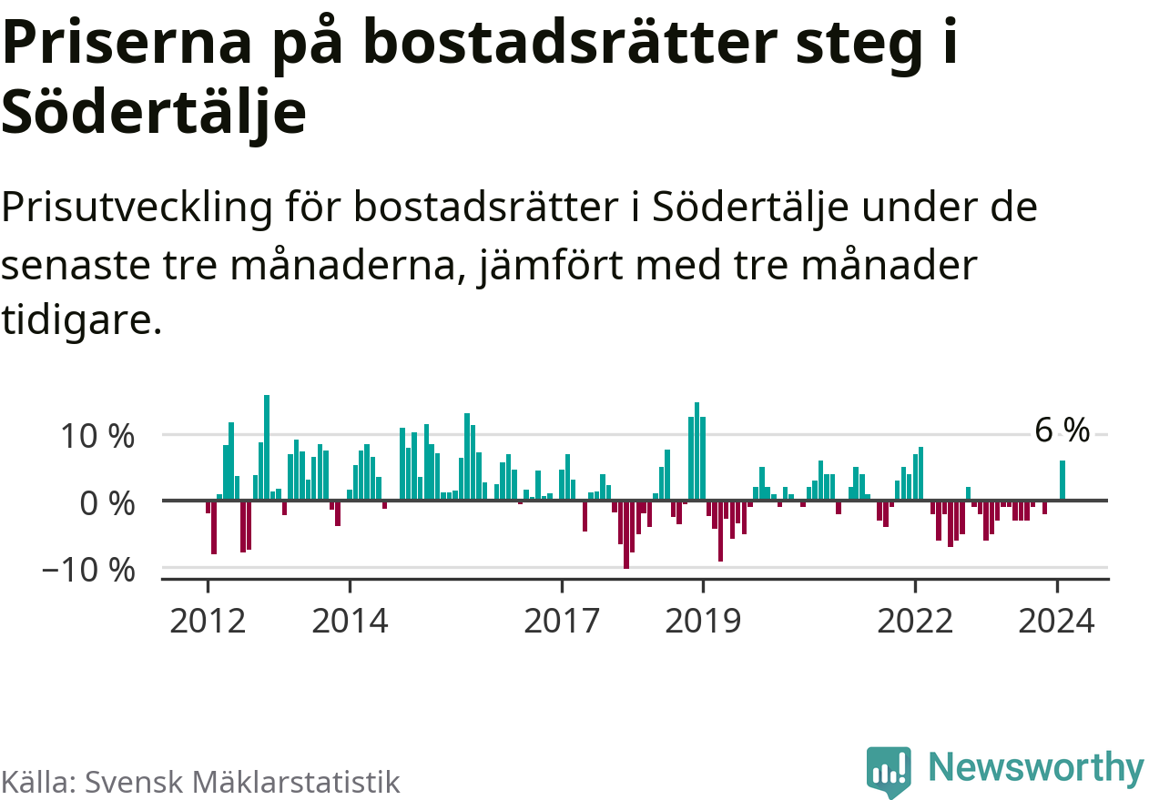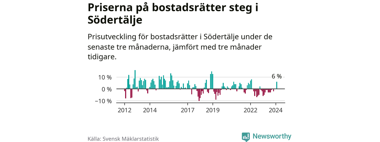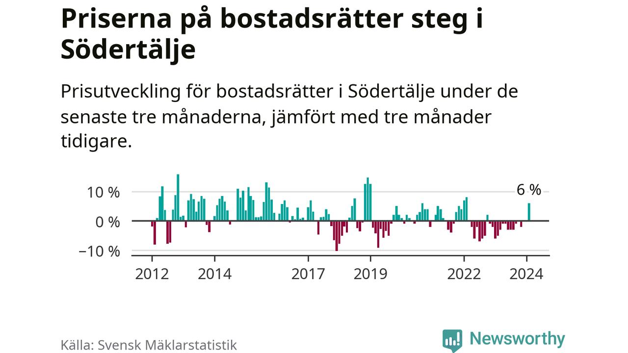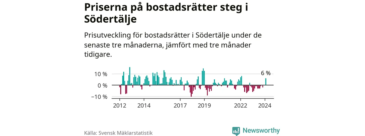 Priserna på bostadsrätter steg mellan december och februari med 6 procent i Södertälje kommun. Det är en betydande uppgång jämfört med det gångna året då priserna i snitt sjunkit med 1 procent.