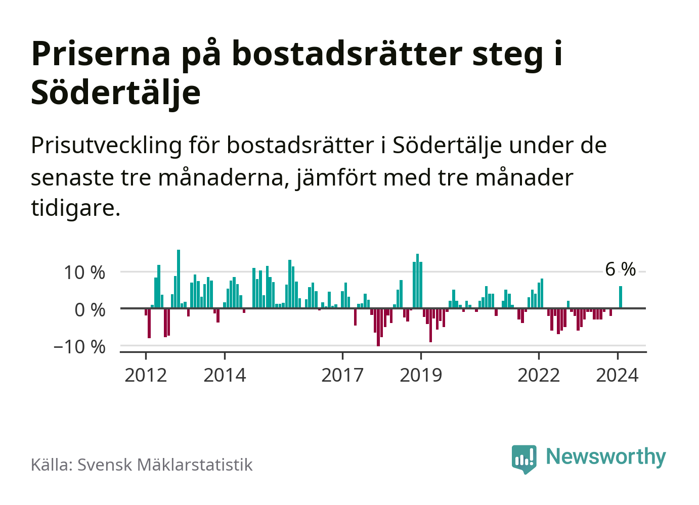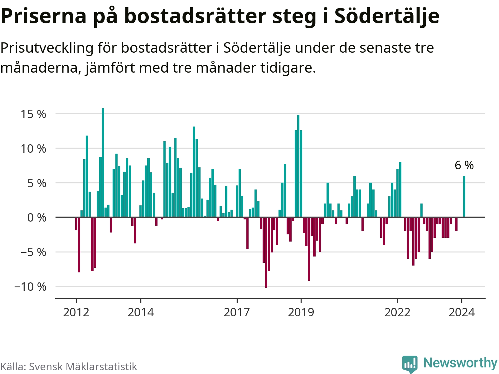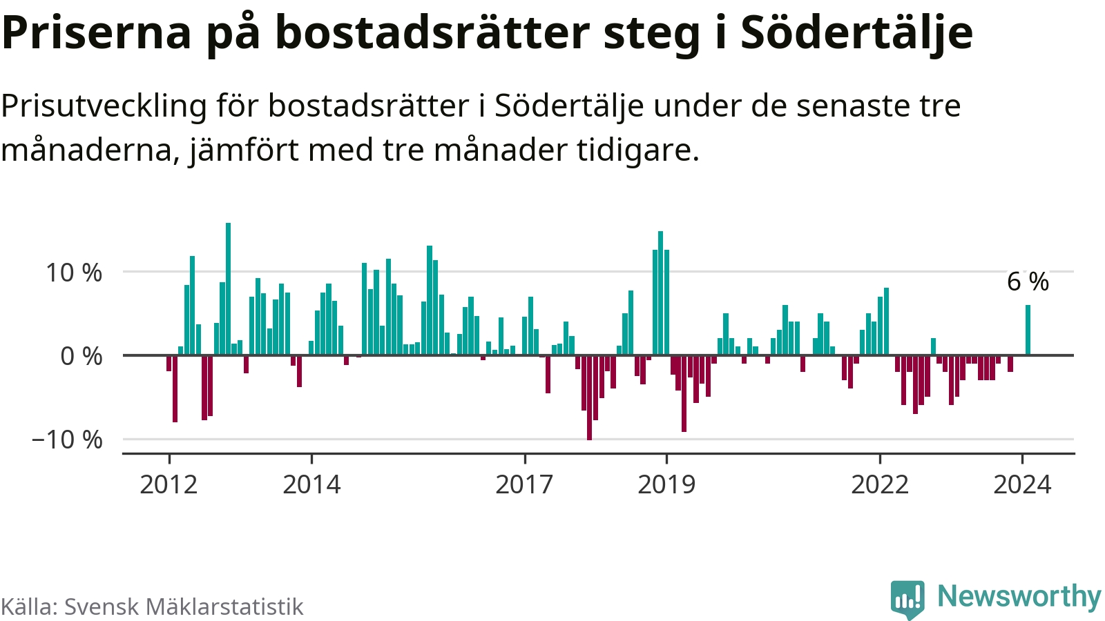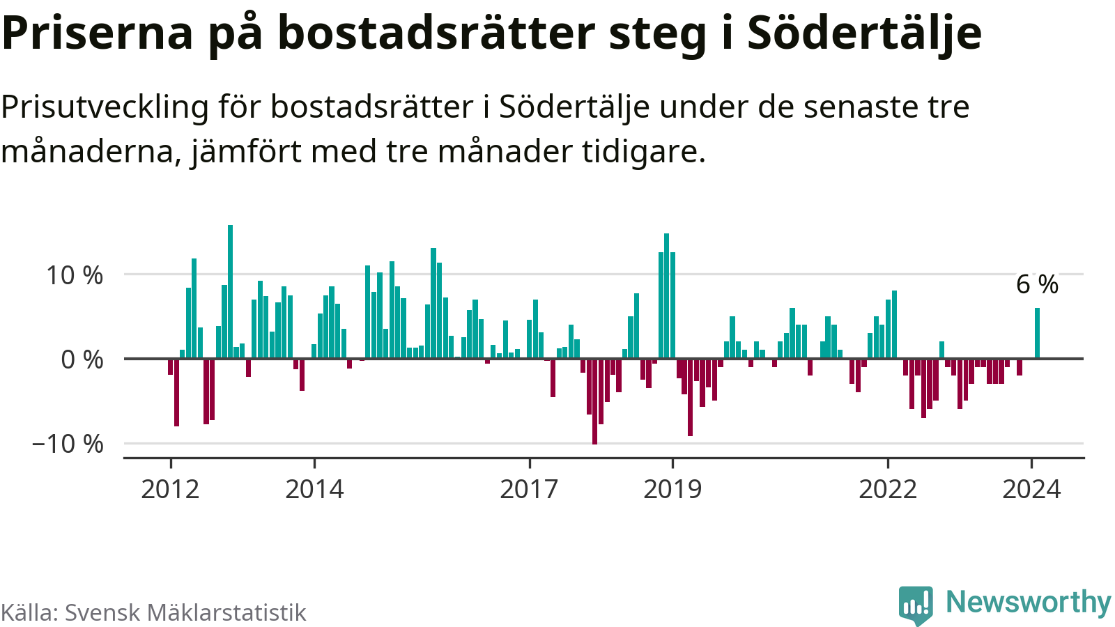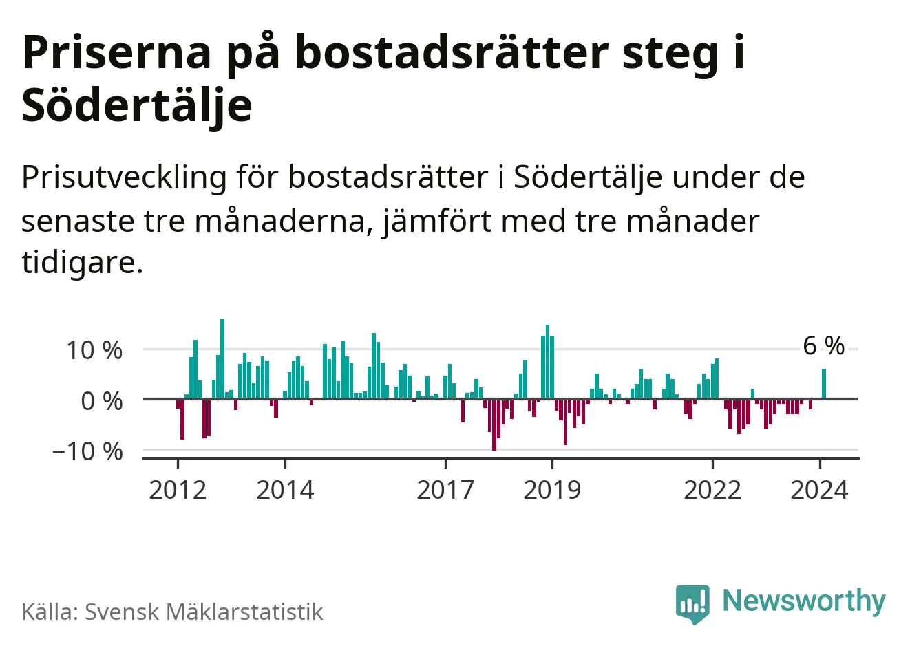 Priserna på bostadsrätter steg mellan december och februari med 6 procent i Södertälje kommun. Det är en betydande uppgång jämfört med det gångna året då priserna i snitt sjunkit med 1 procent.
