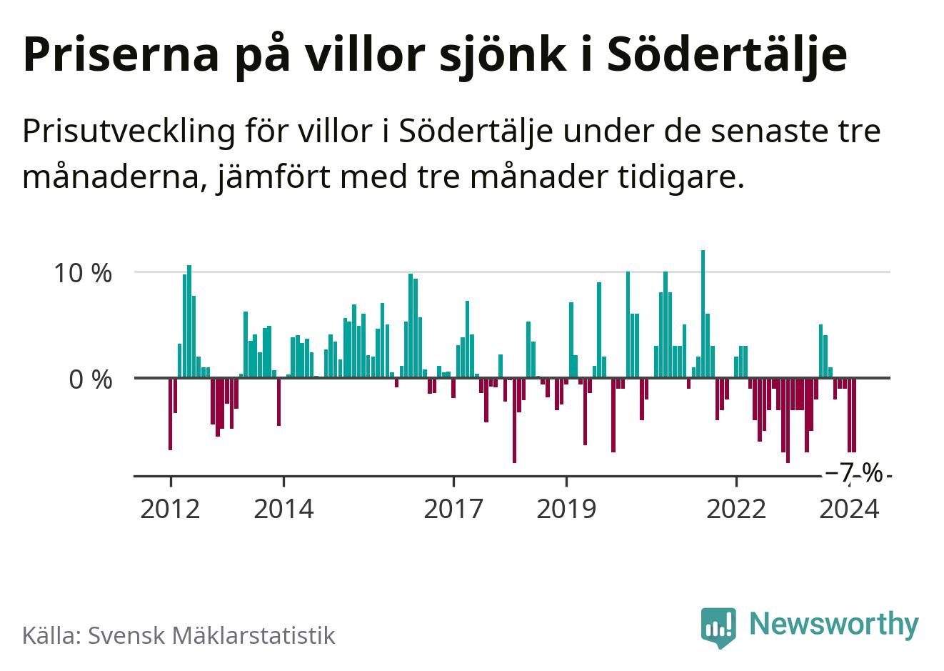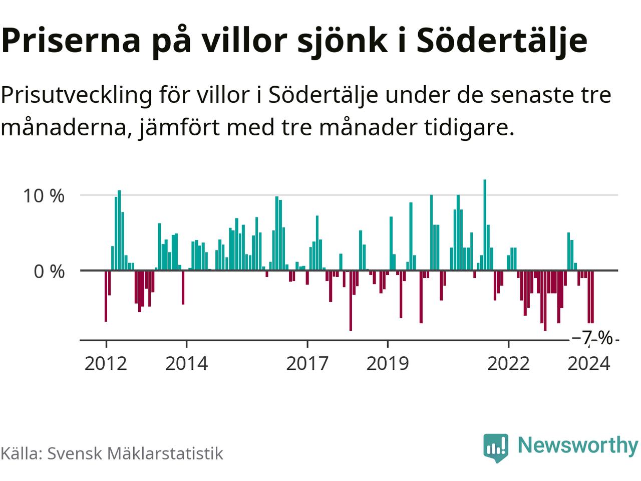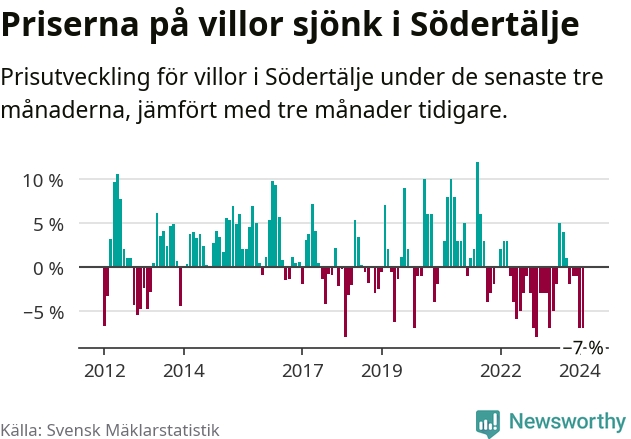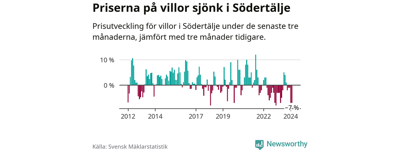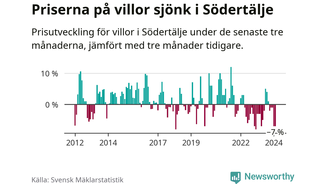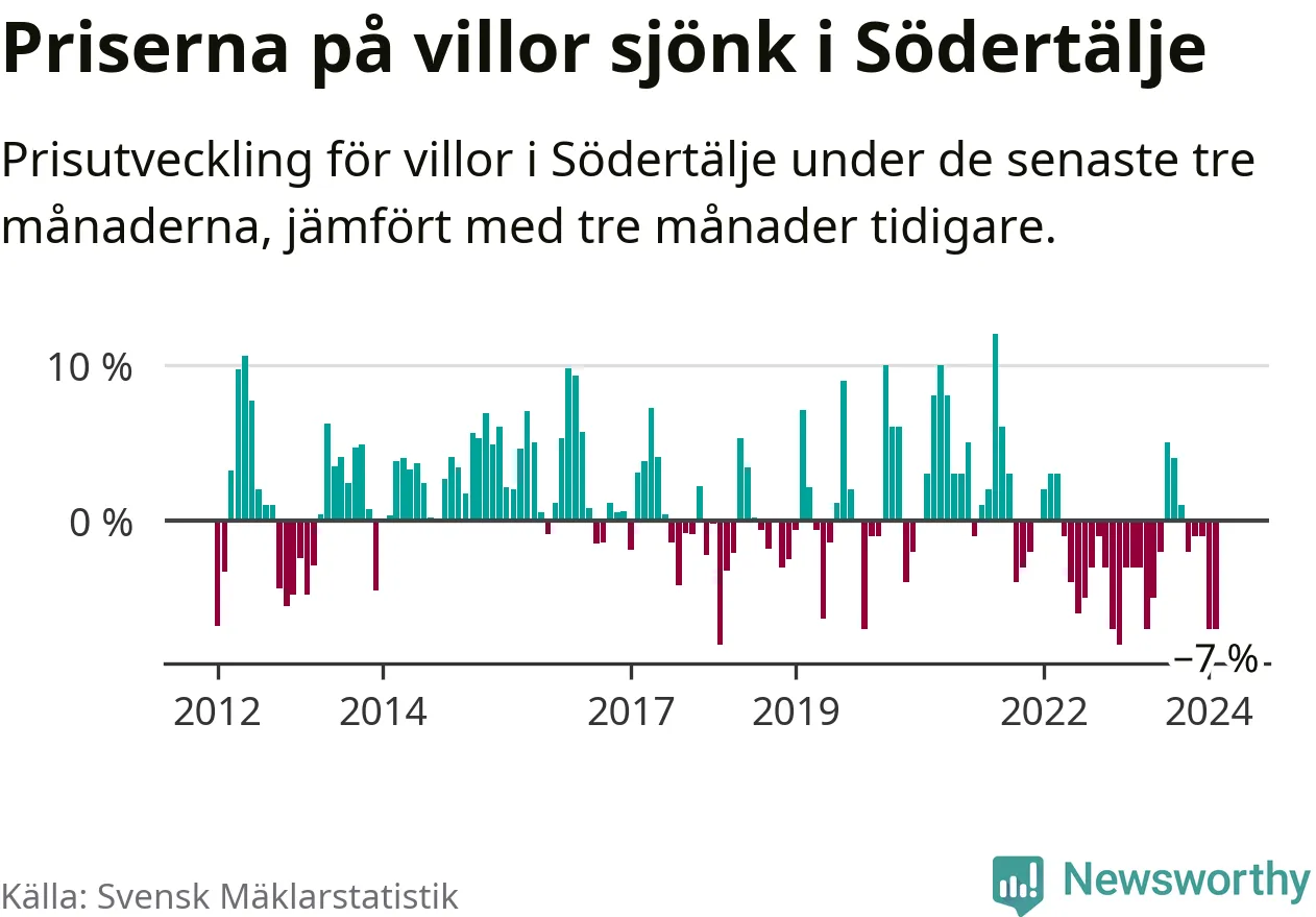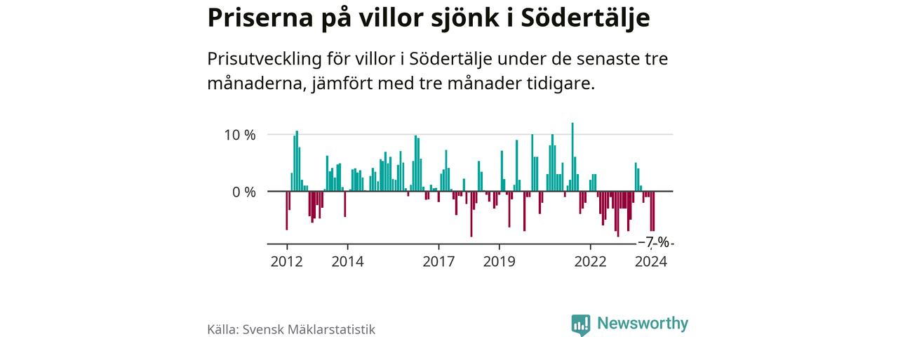 Villapriserna har gått ner i Södertälje kommun. Medelpriset på försäljningarna under de senaste tre månaderna visar på en nedgång med 7 procent.