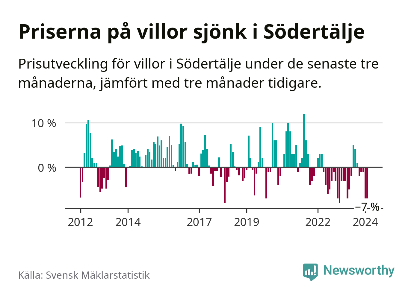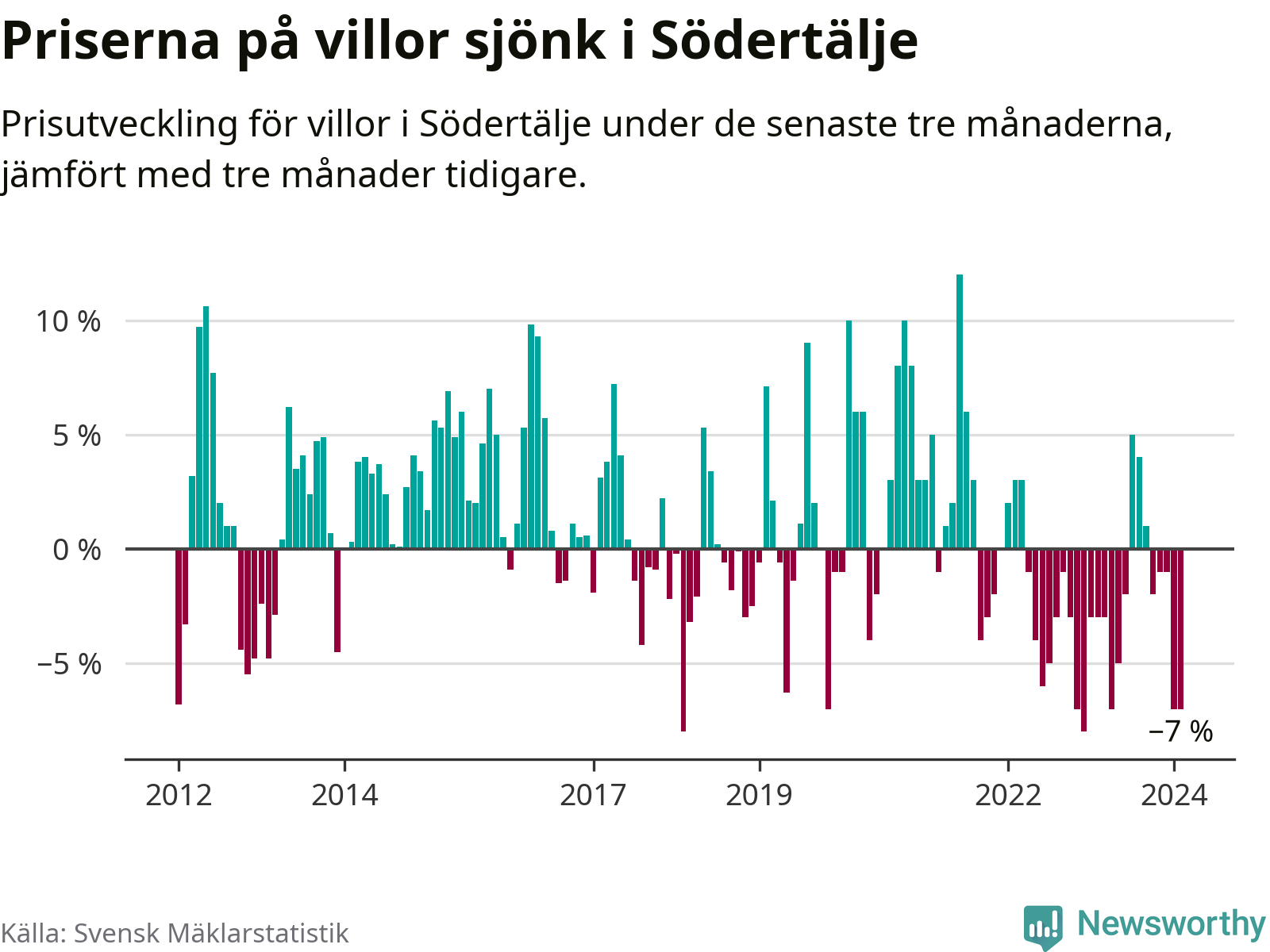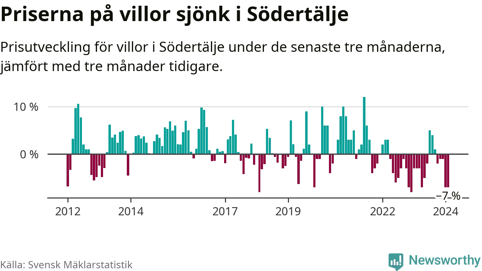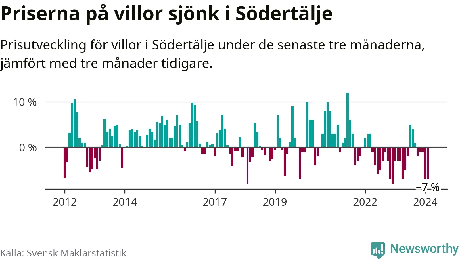 Villapriserna har gått ner i Södertälje kommun. Medelpriset på försäljningarna under de senaste tre månaderna visar på en nedgång med 7 procent.