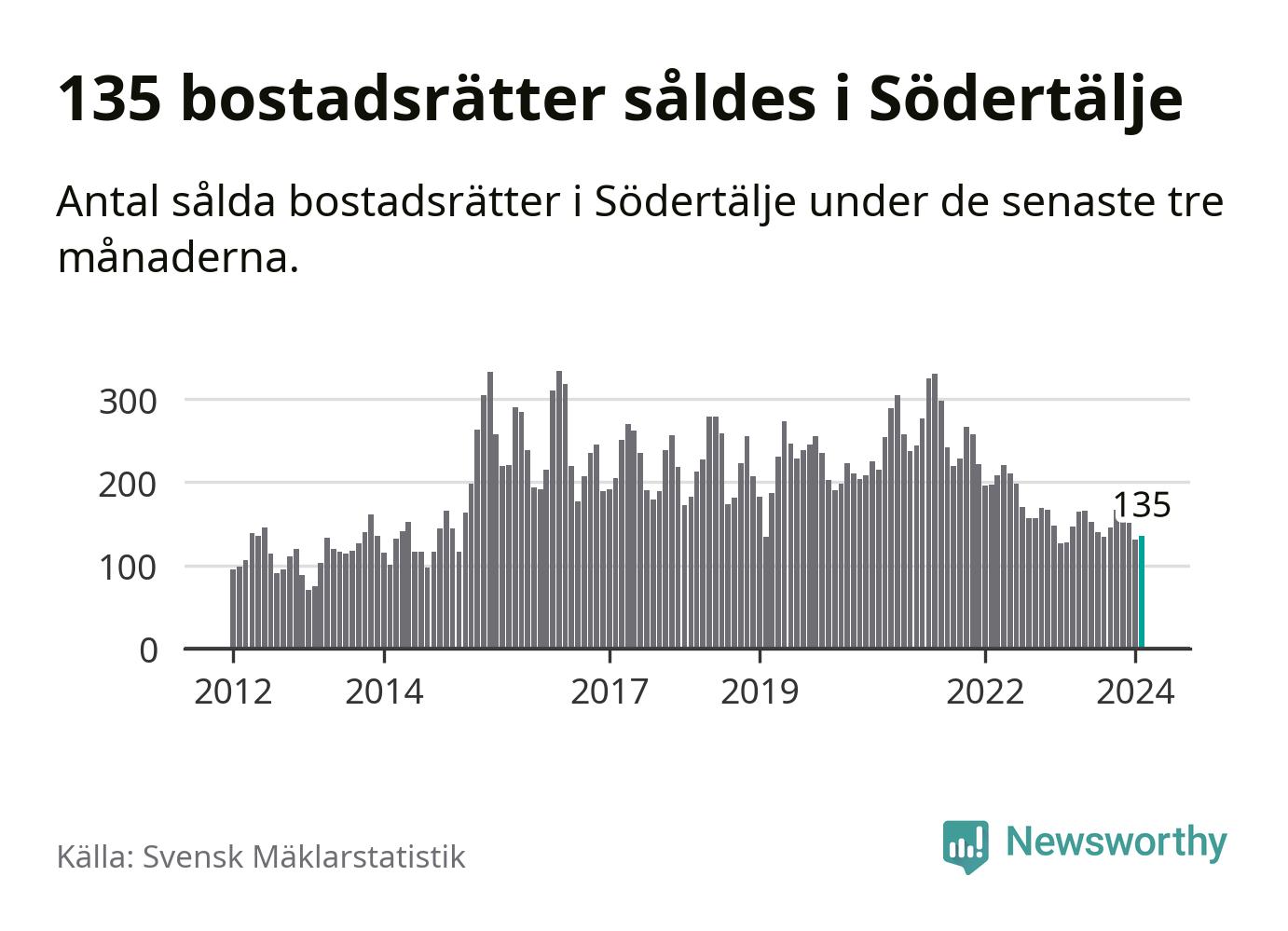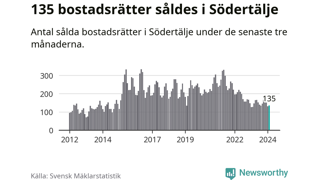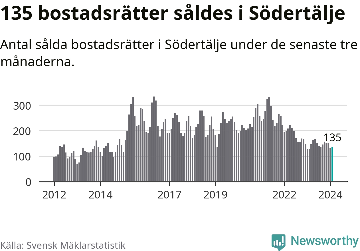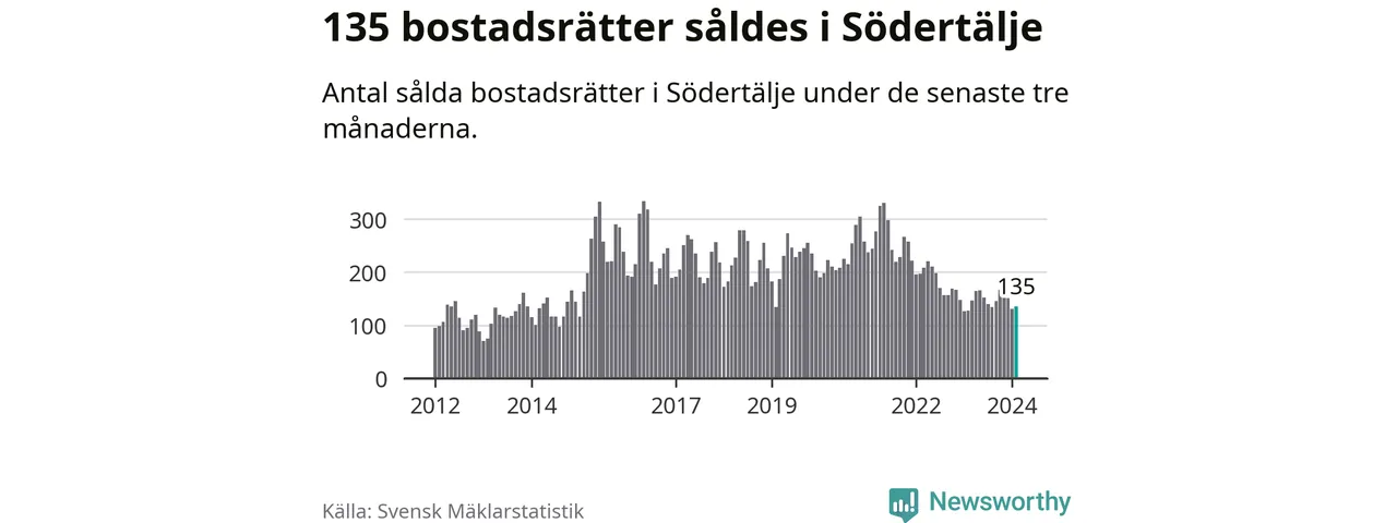 Sammanlagt såldes 135 bostadsrätter i Södertälje kommun mellan december och februari till ett genomsnittligt pris på 1,9 miljoner kronor. I fjol gjordes 128 affärer vid den här tiden på året.