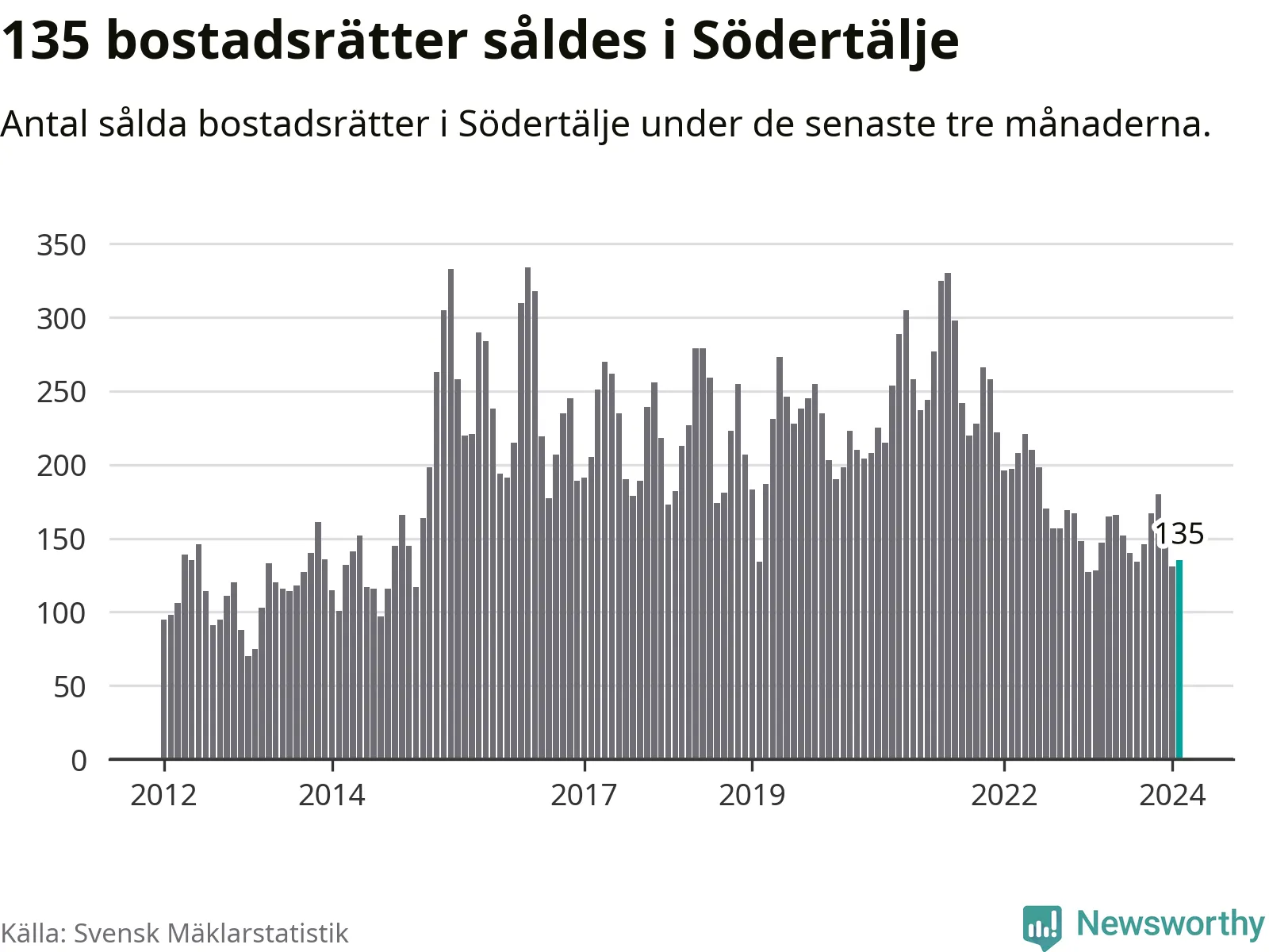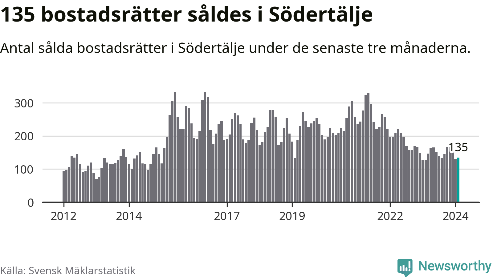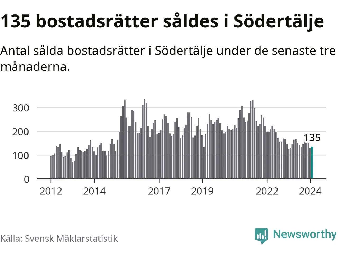 Sammanlagt såldes 135 bostadsrätter i Södertälje kommun mellan december och februari till ett genomsnittligt pris på 1,9 miljoner kronor. I fjol gjordes 128 affärer vid den här tiden på året.