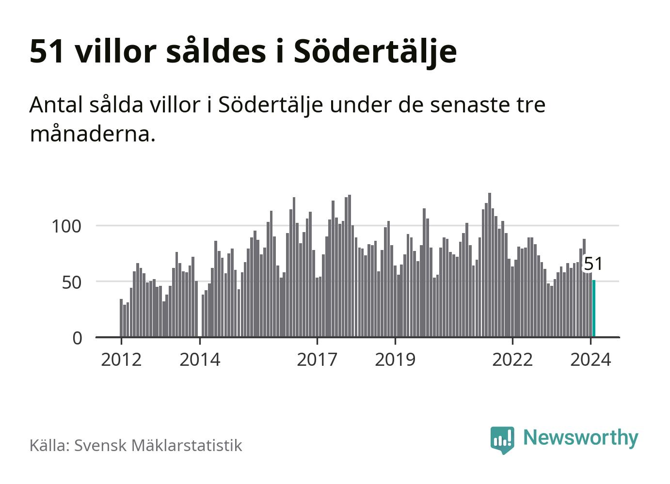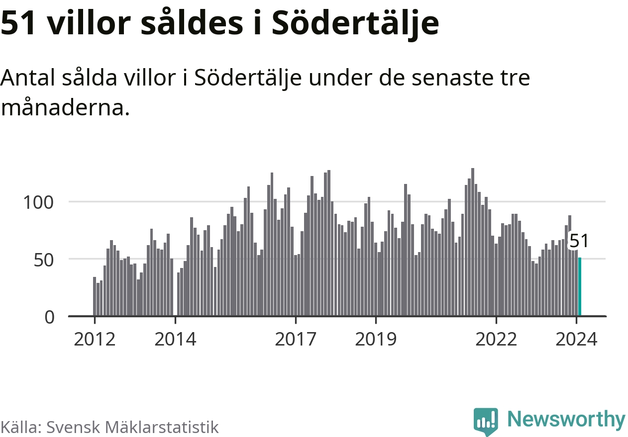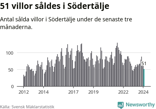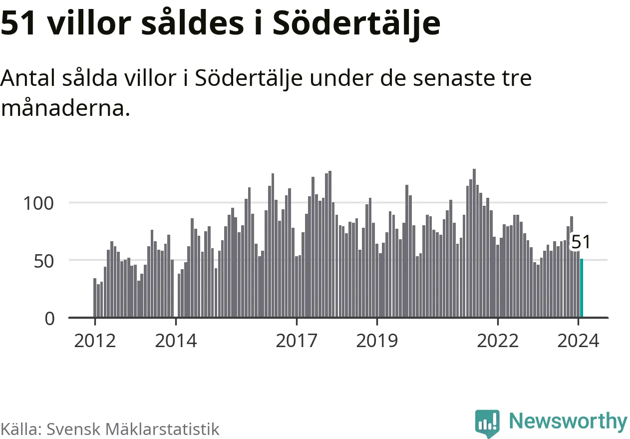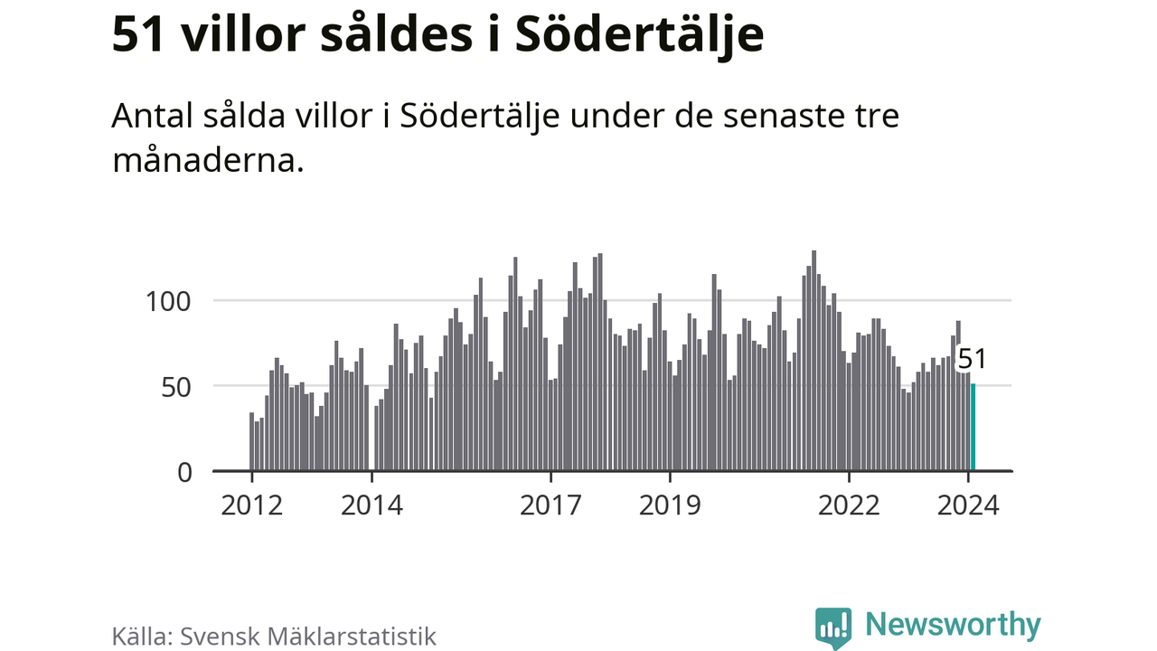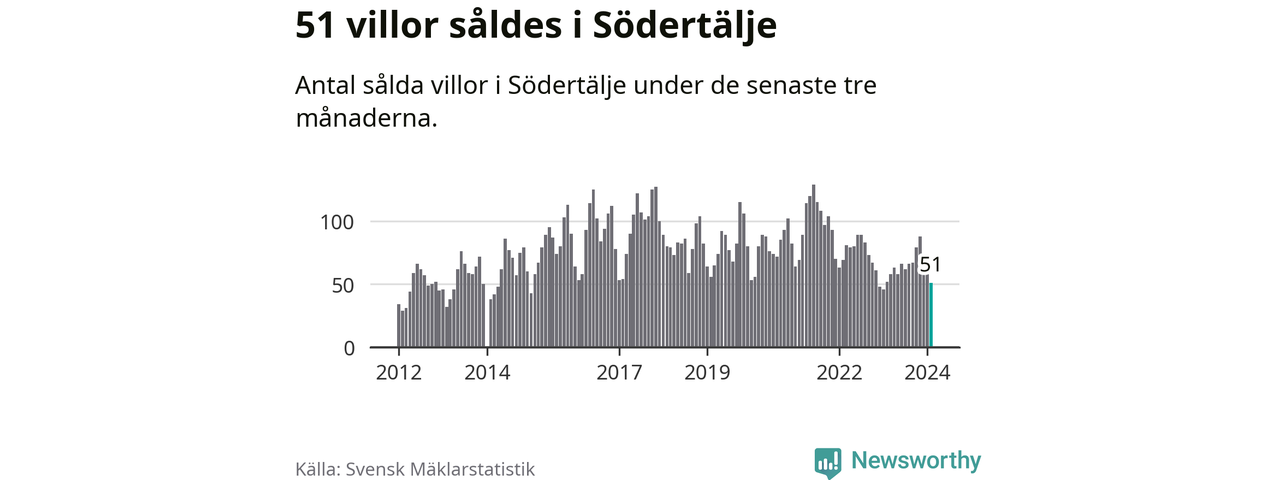 Sammanlagt såldes 51 villor i Södertälje kommun mellan december och februari till ett genomsnittligt pris på 4,1 miljoner kronor. I fjol gjordes 52 affärer vid den här tiden på året.