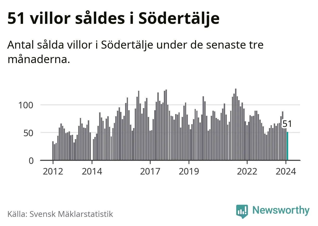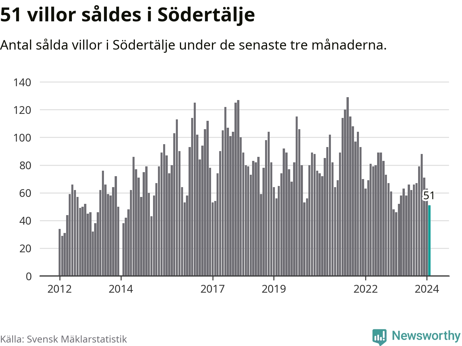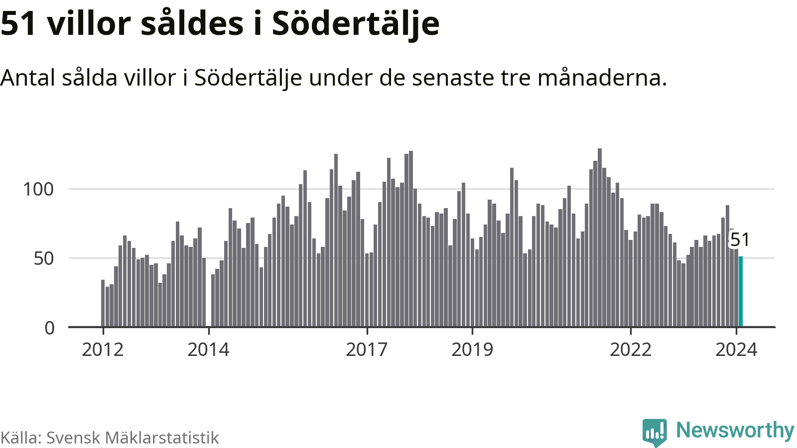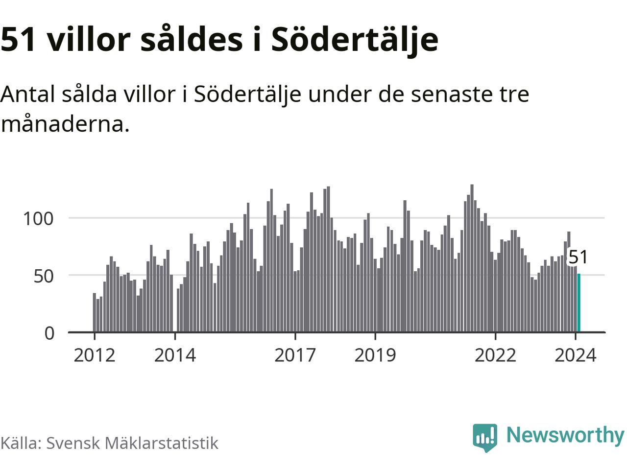 Sammanlagt såldes 51 villor i Södertälje kommun mellan december och februari till ett genomsnittligt pris på 4,1 miljoner kronor. I fjol gjordes 52 affärer vid den här tiden på året.