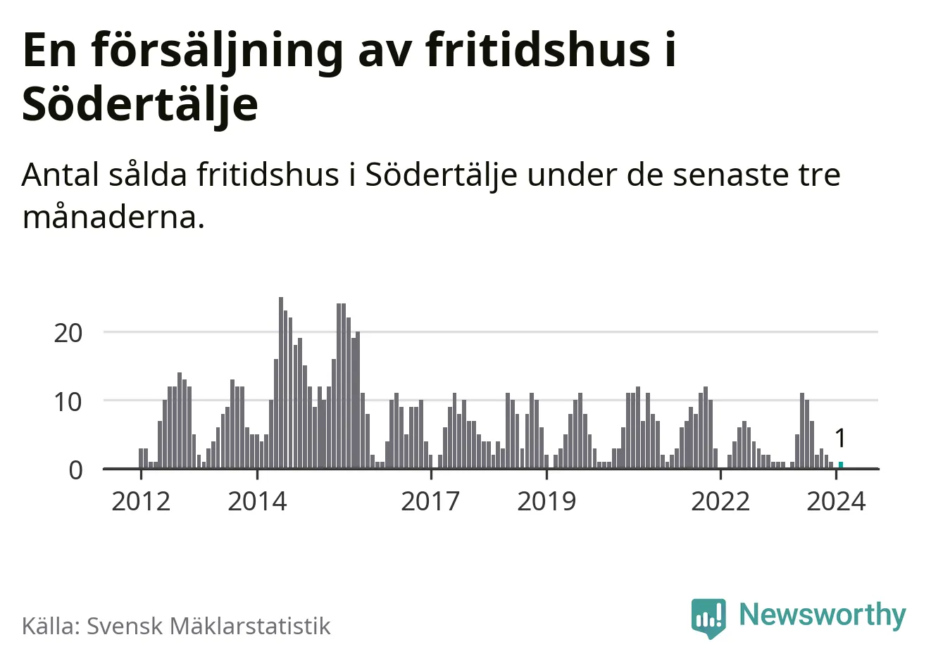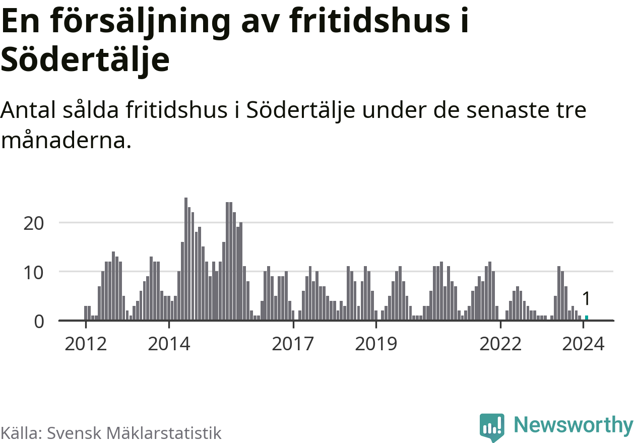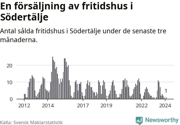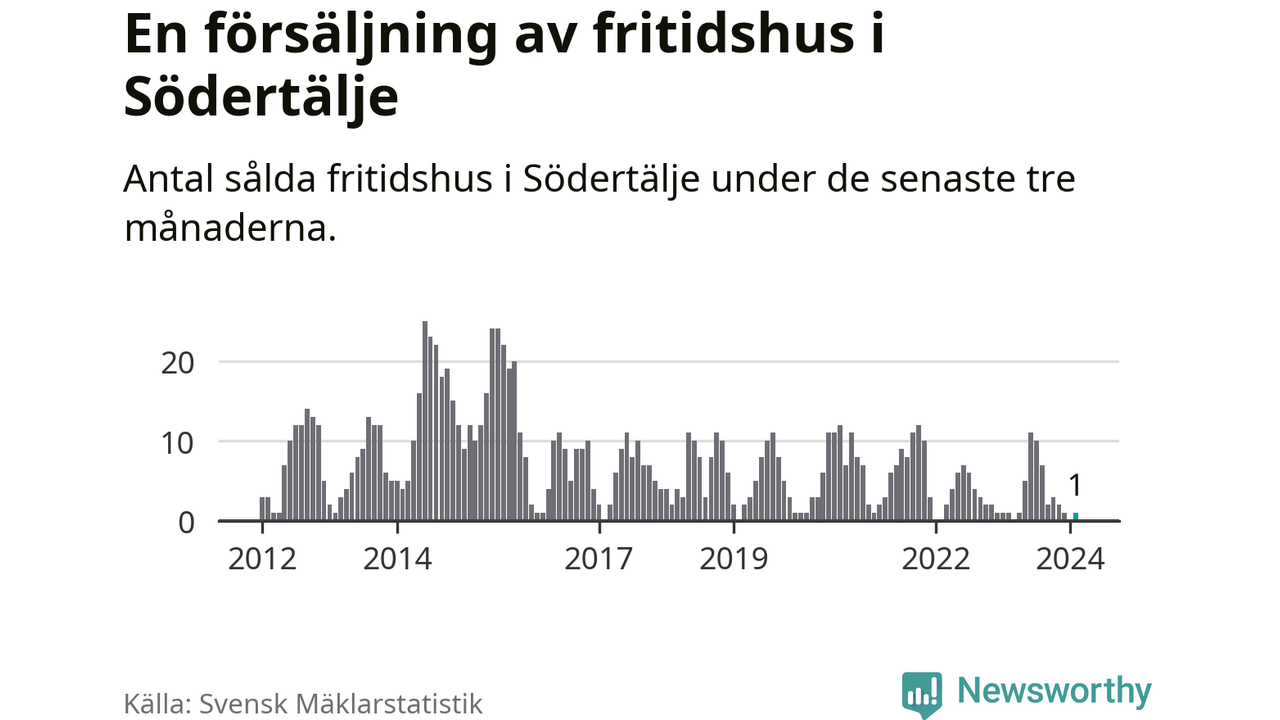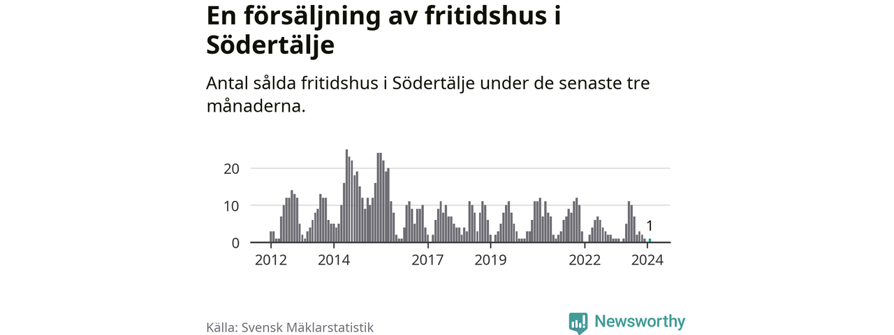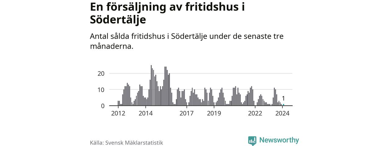 Mellan december och februari gjordes sammanlagt en affär med fritidshus i Södertälje kommun. Det är lika många affärer som vid motsvarande tid i fjol.