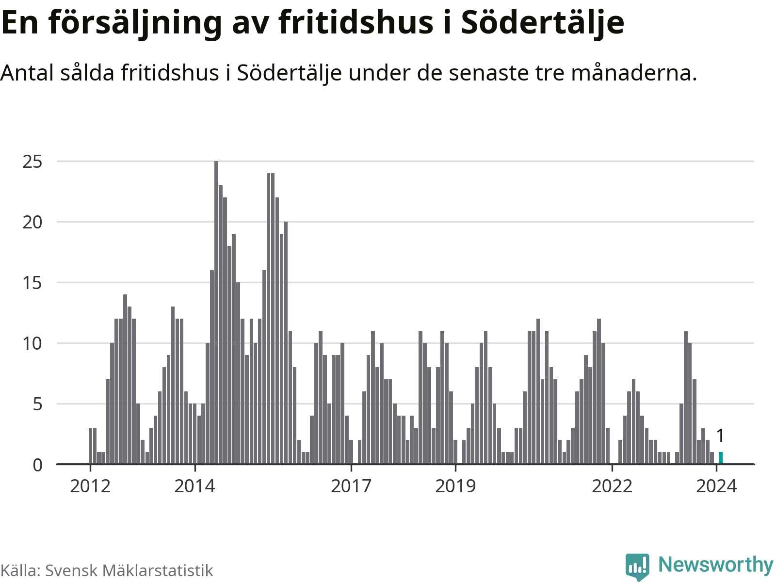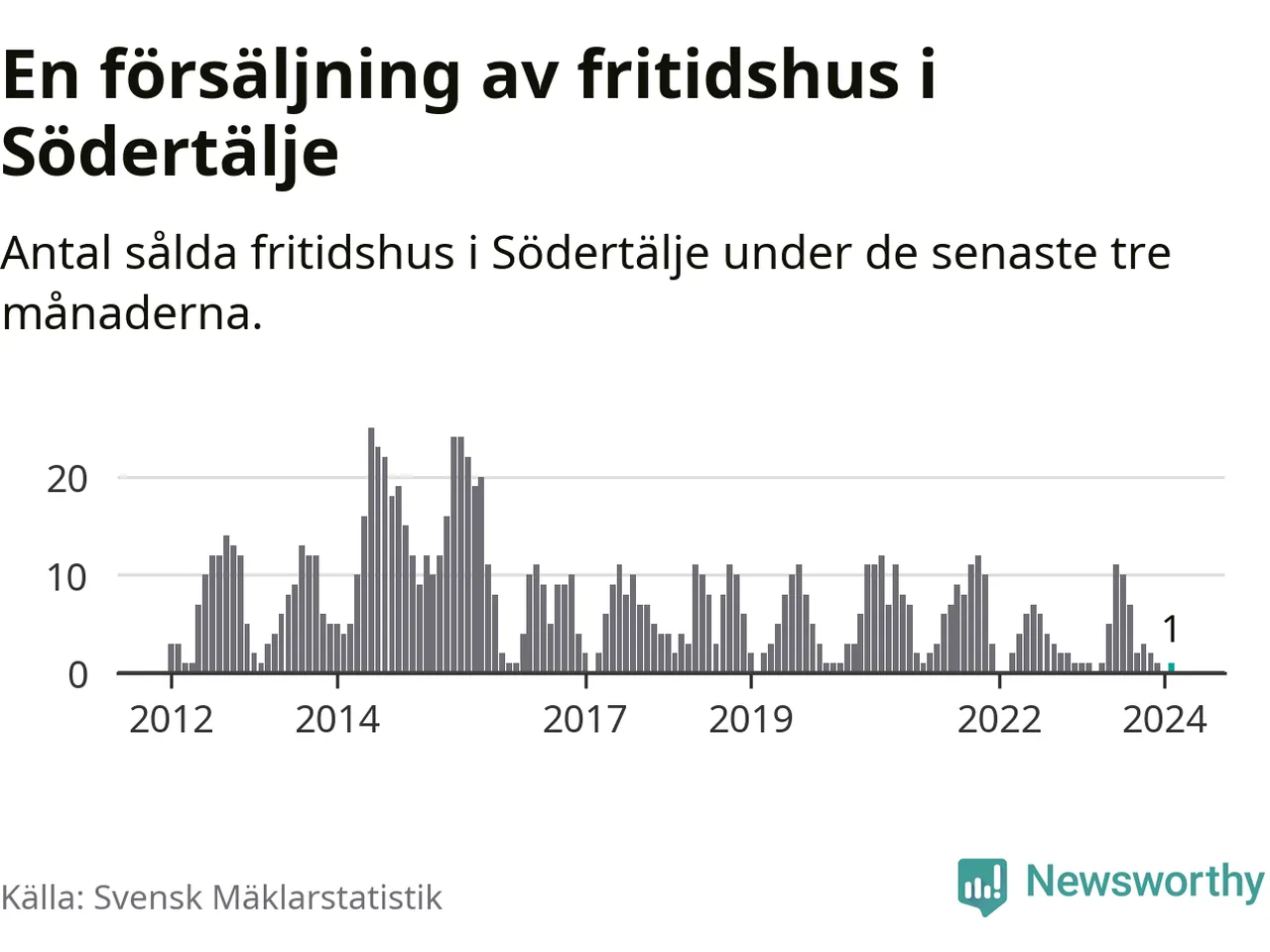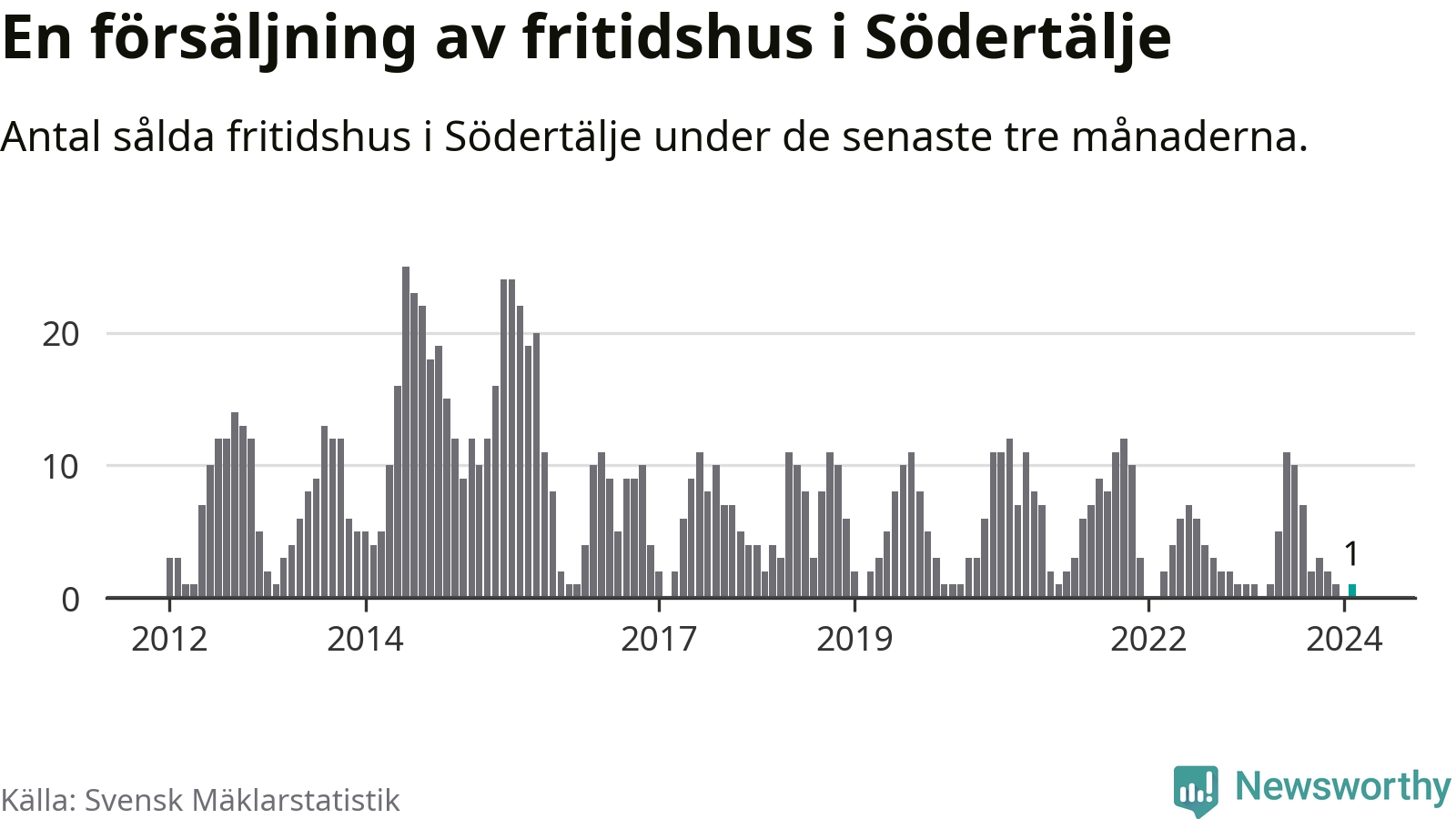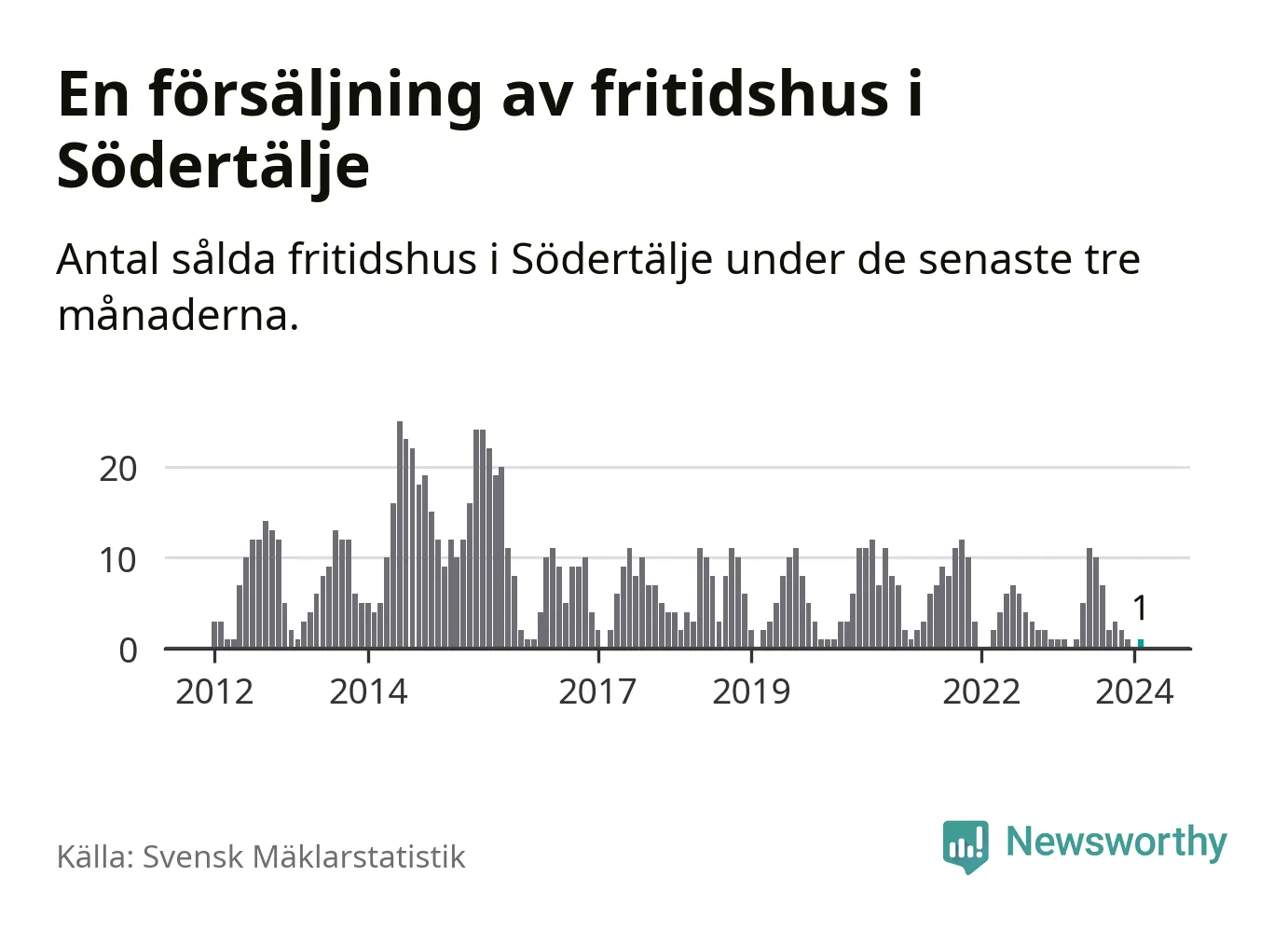 Mellan december och februari gjordes sammanlagt en affär med fritidshus i Södertälje kommun. Det är lika många affärer som vid motsvarande tid i fjol.