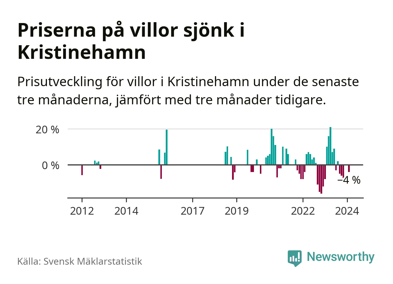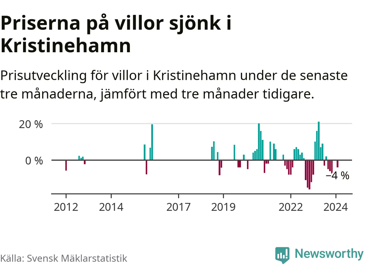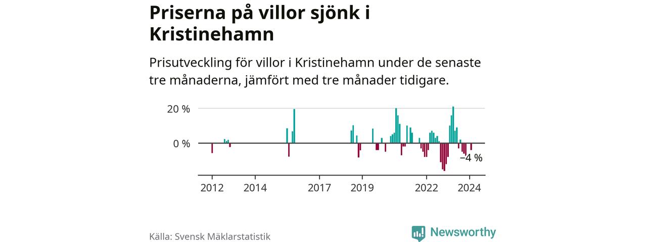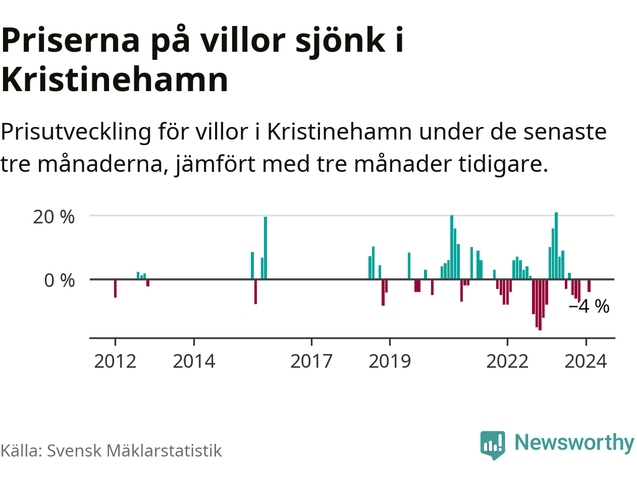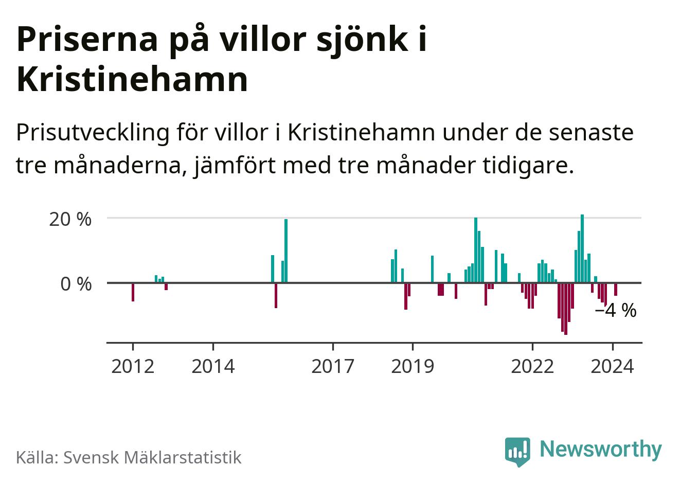 Statistiken visar även på en kännbar prisnedgång i Kristinehamns kommun. Medelpriset på försäljningarna av villor i kommunen var 4 procent lägre än för tre månader sedan. Även i hela Värmland sjunker villapriserna. I hela länet noterades en prisnedgång på 2 procent.
