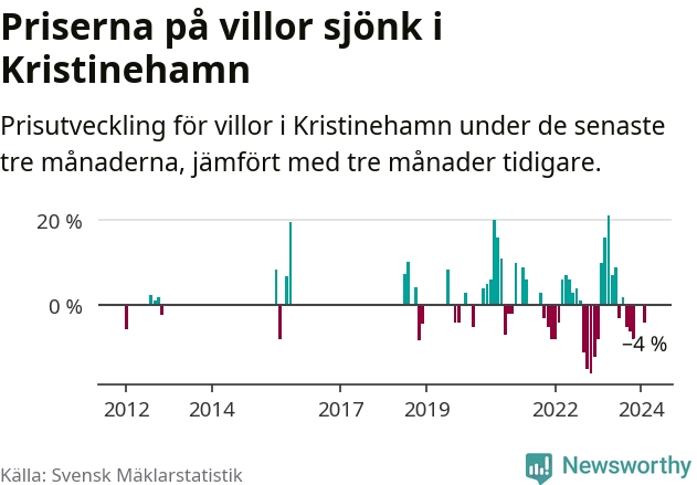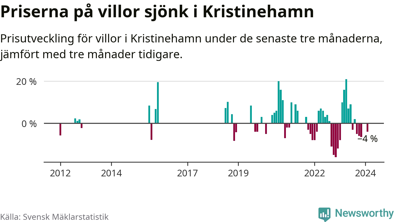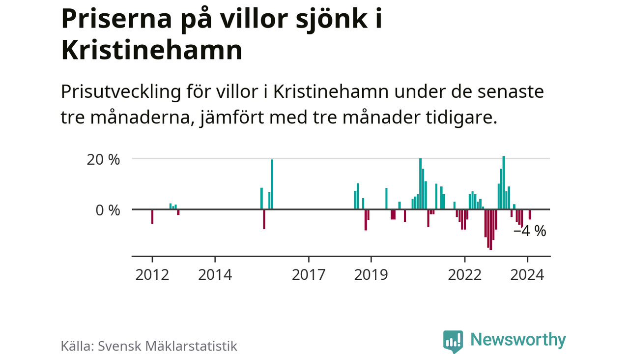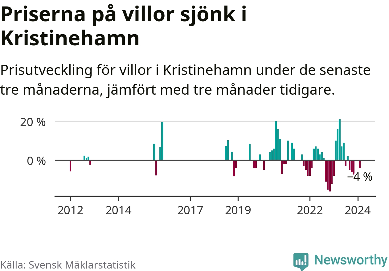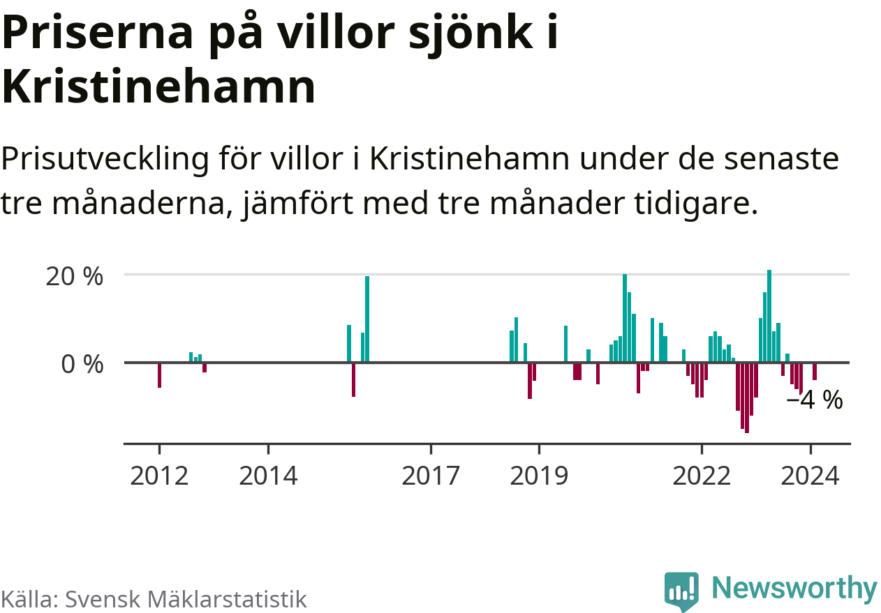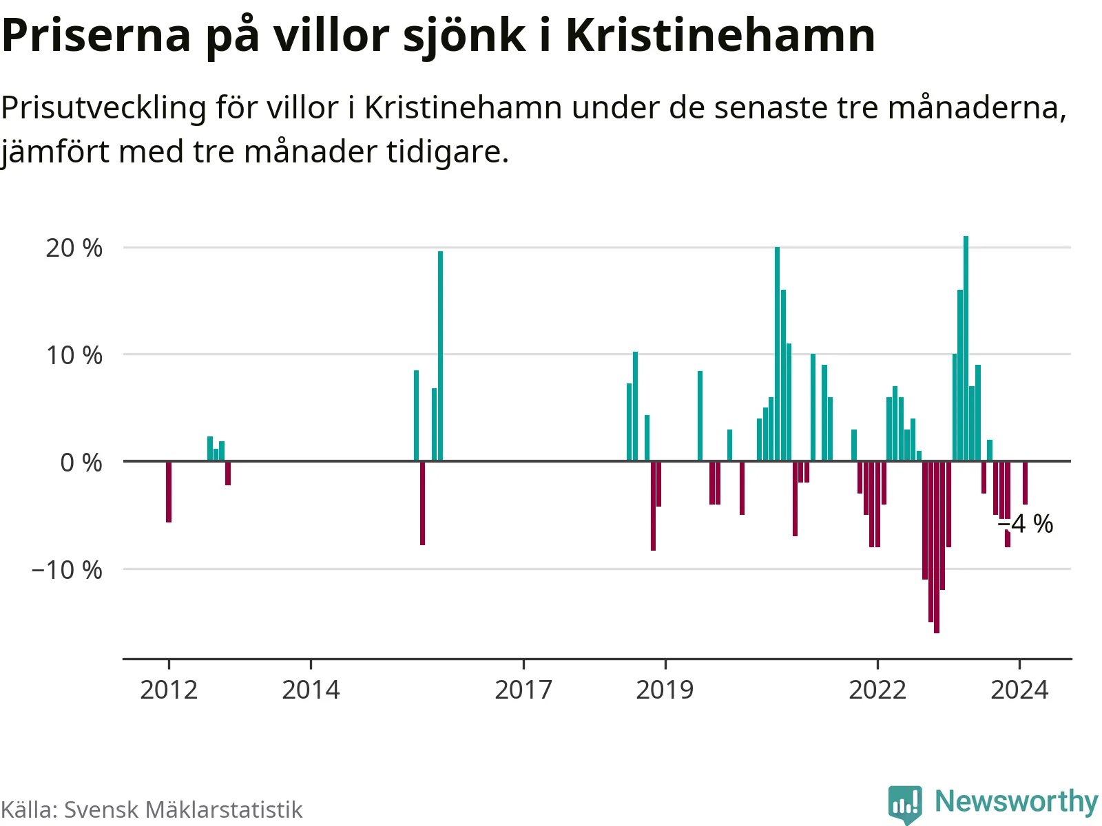 Statistiken visar även på en kännbar prisnedgång i Kristinehamns kommun. Medelpriset på försäljningarna av villor i kommunen var 4 procent lägre än för tre månader sedan. Även i hela Värmland sjunker villapriserna. I hela länet noterades en prisnedgång på 2 procent.