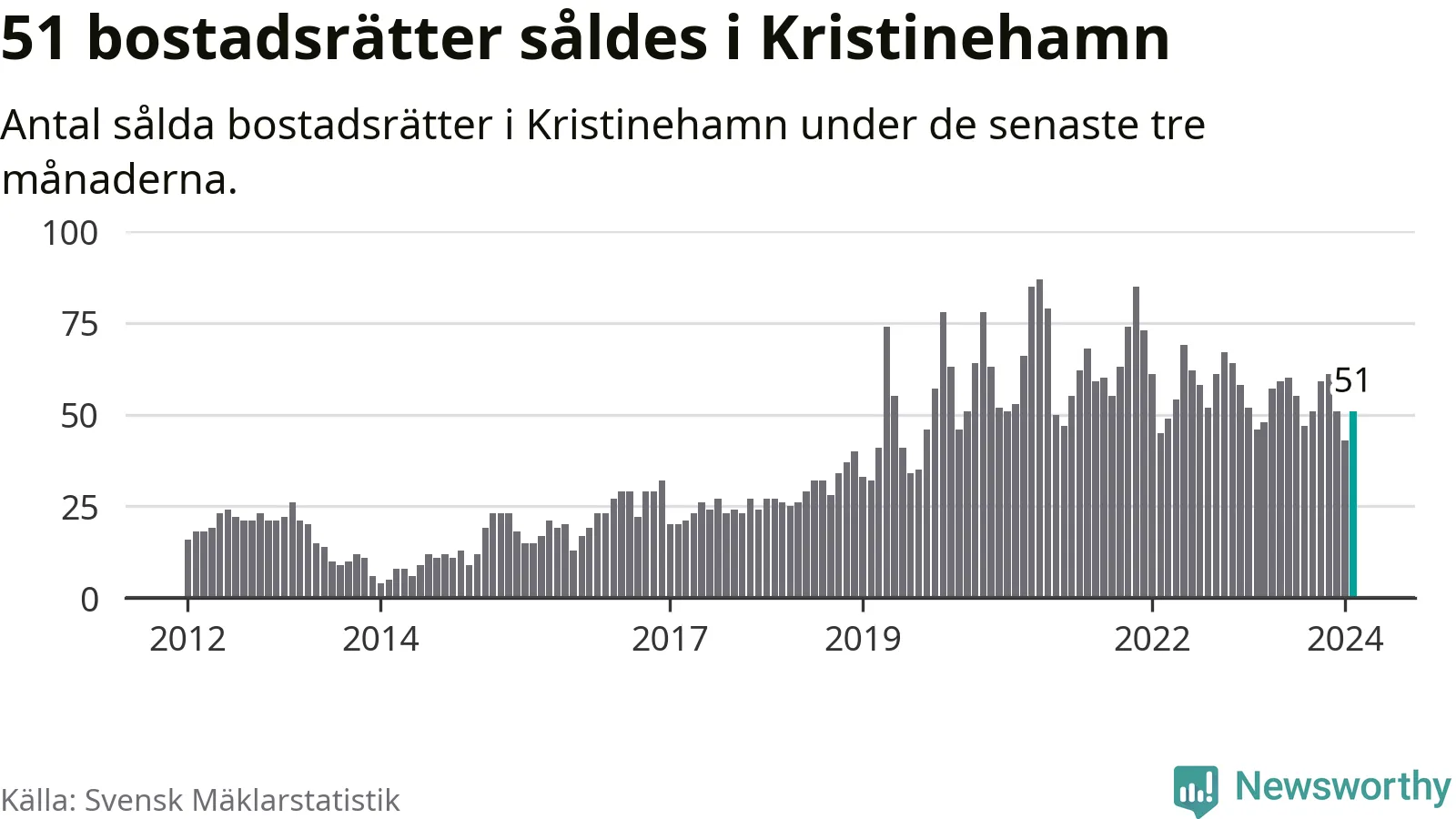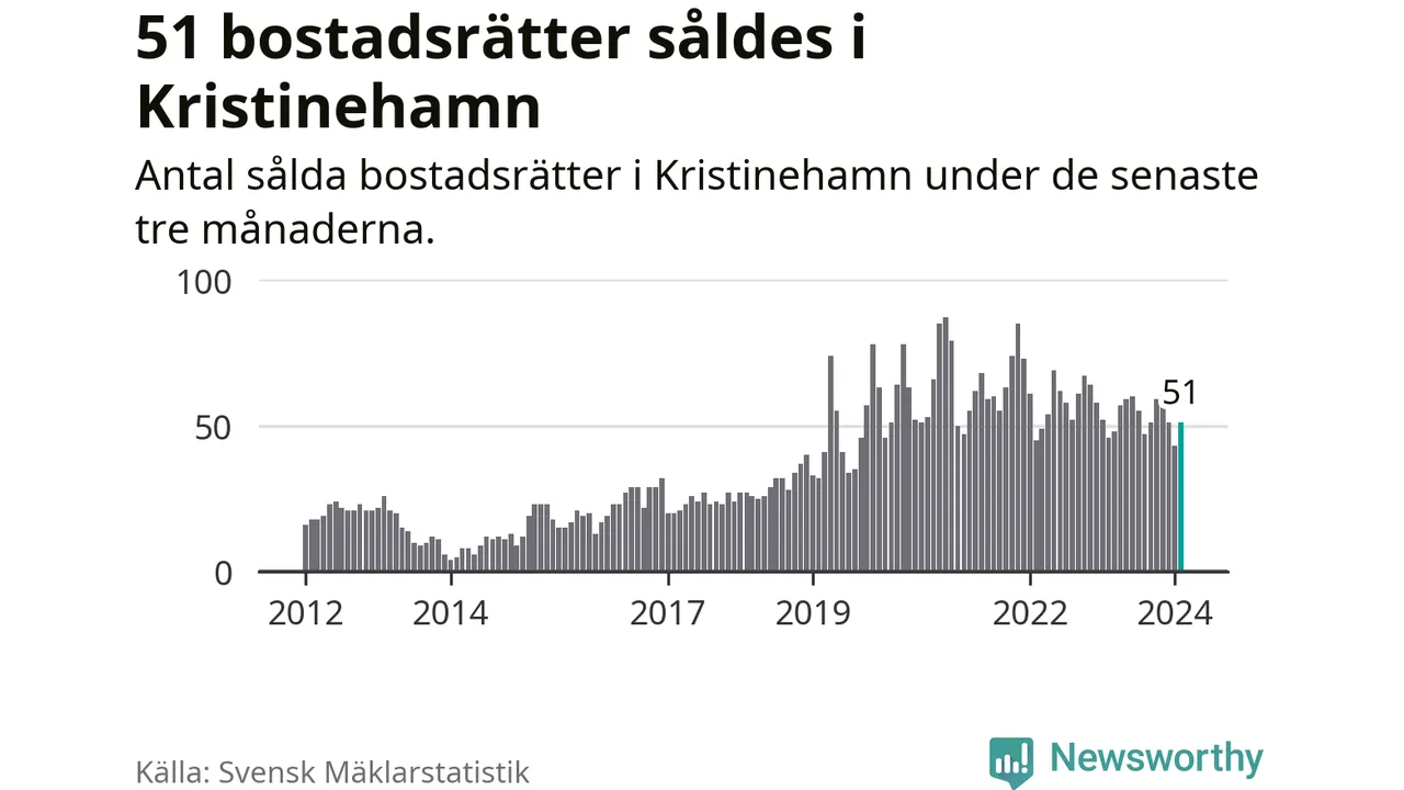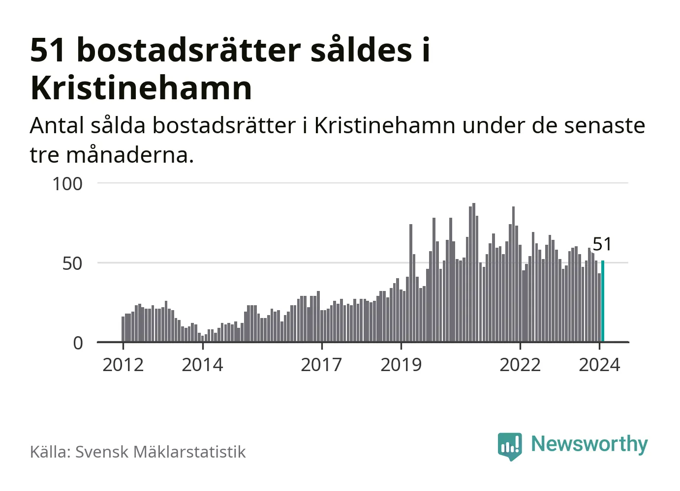 Sammanlagt såldes 51 bostadsrätter i Kristinehamns kommun mellan december och februari till ett genomsnittligt pris på 0,3 miljoner kronor. I fjol gjordes 46 affärer vid den här tiden på året.