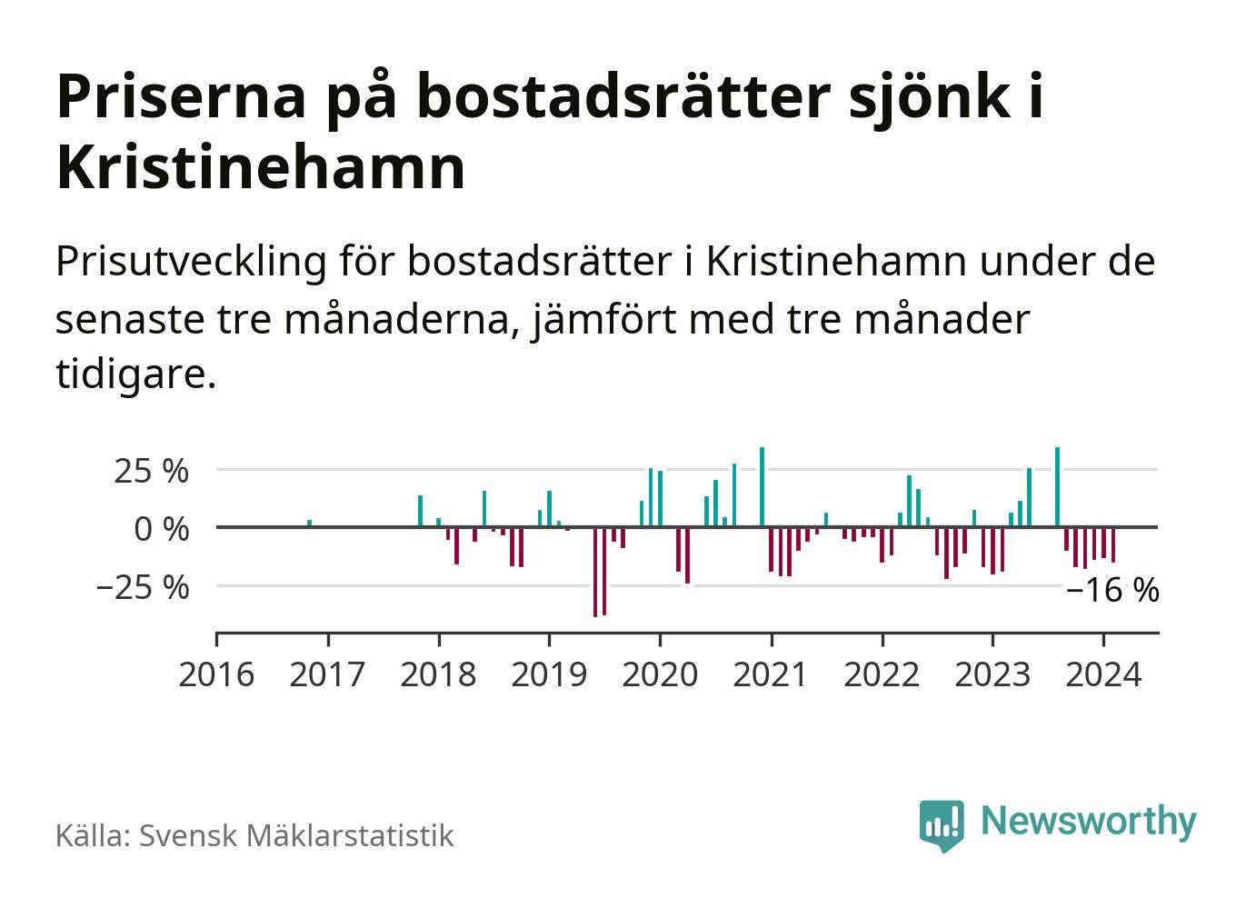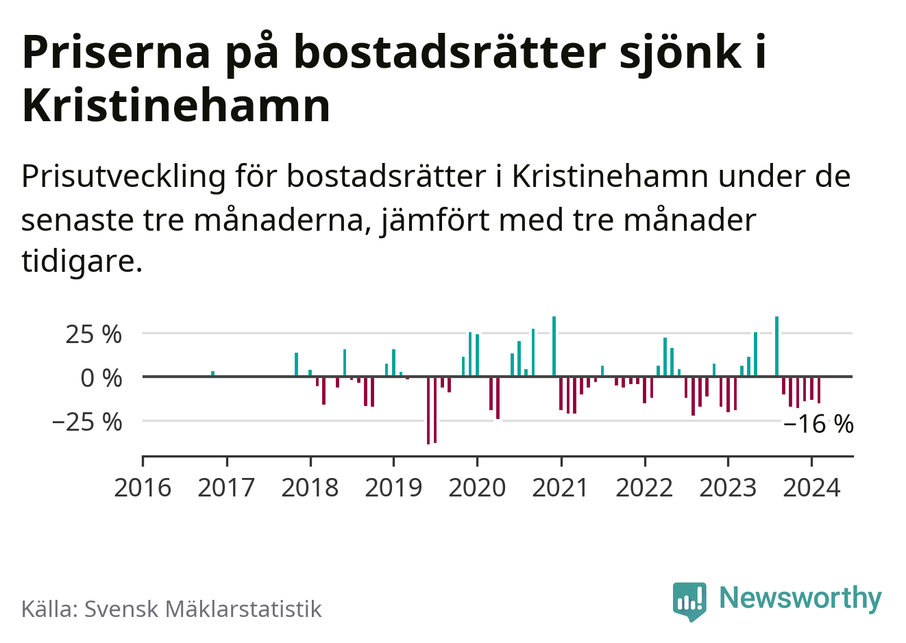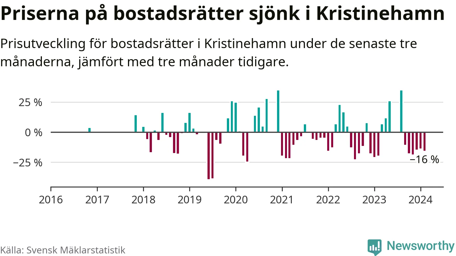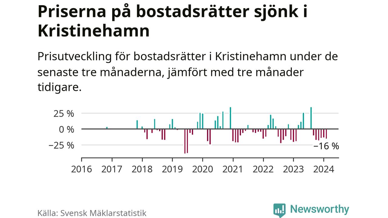 Priserna på bostadsrätter har gått ner i Kristinehamns kommun. Medelpriset på försäljningarna under de senaste tre månaderna visar på en nedgång med 16 procent.