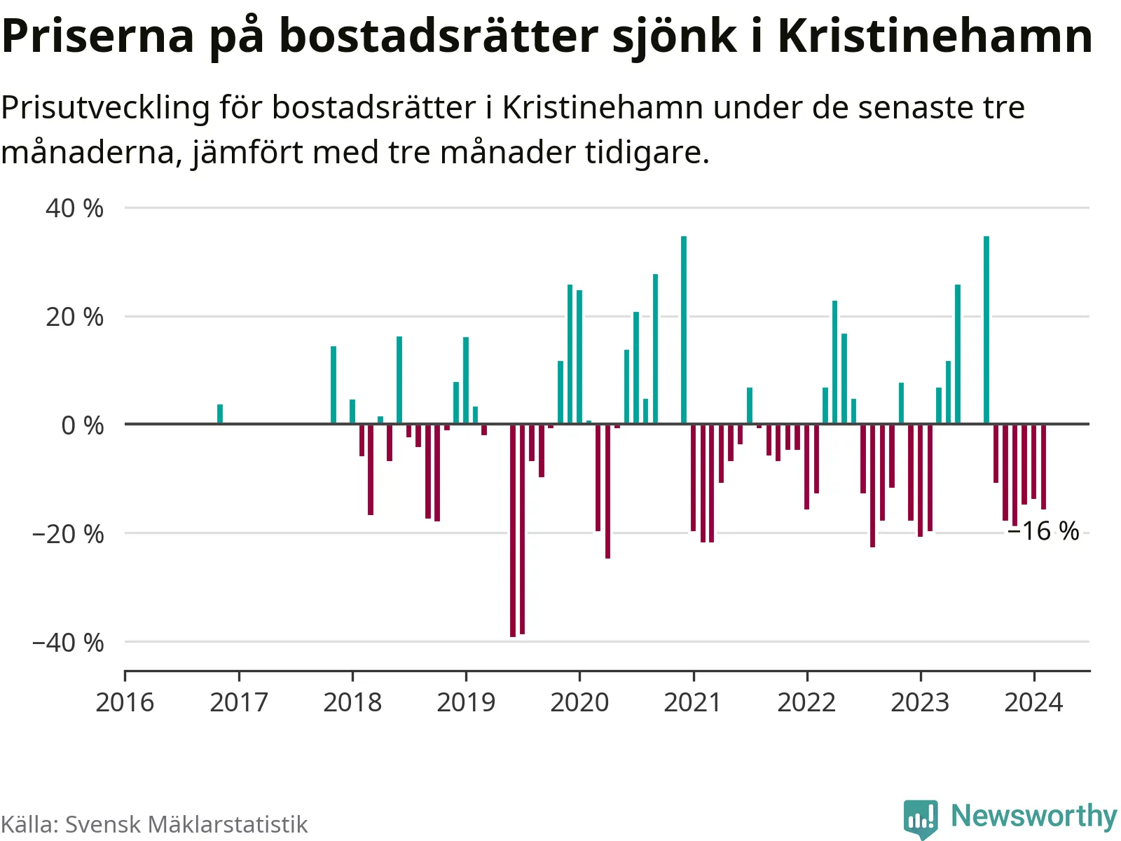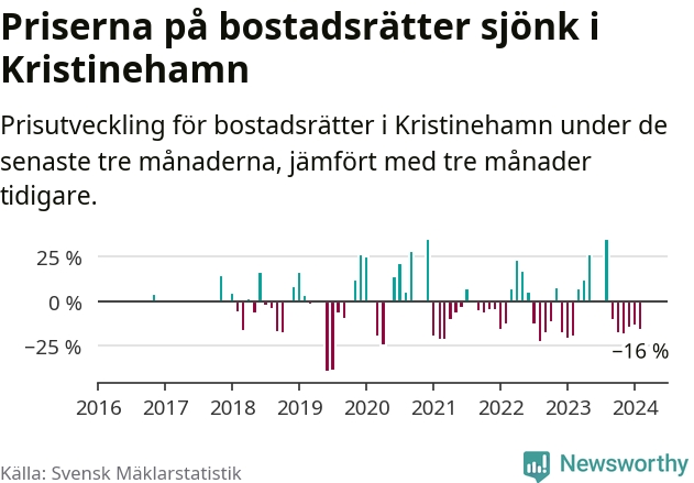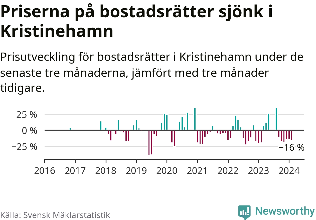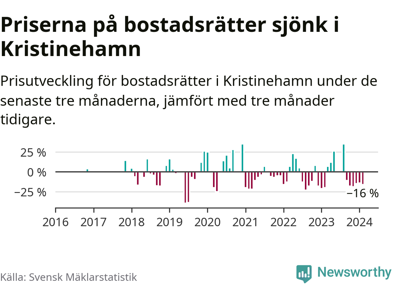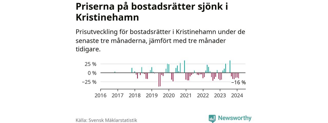 Priserna på bostadsrätter har gått ner i Kristinehamns kommun. Medelpriset på försäljningarna under de senaste tre månaderna visar på en nedgång med 16 procent.