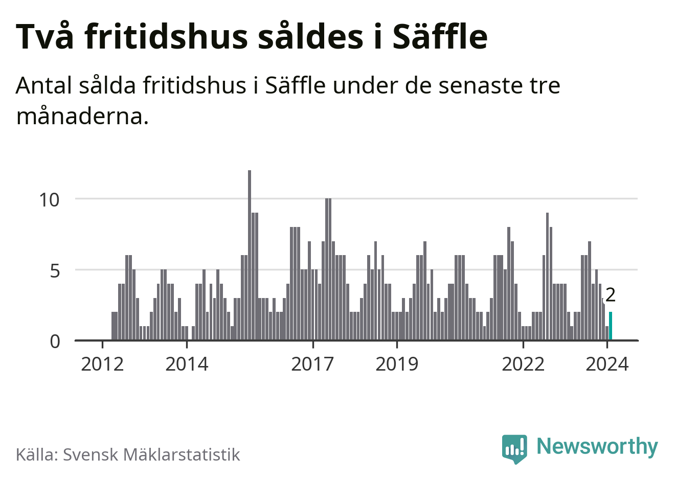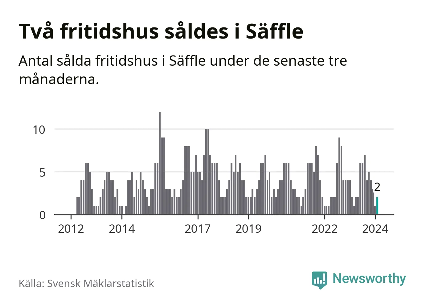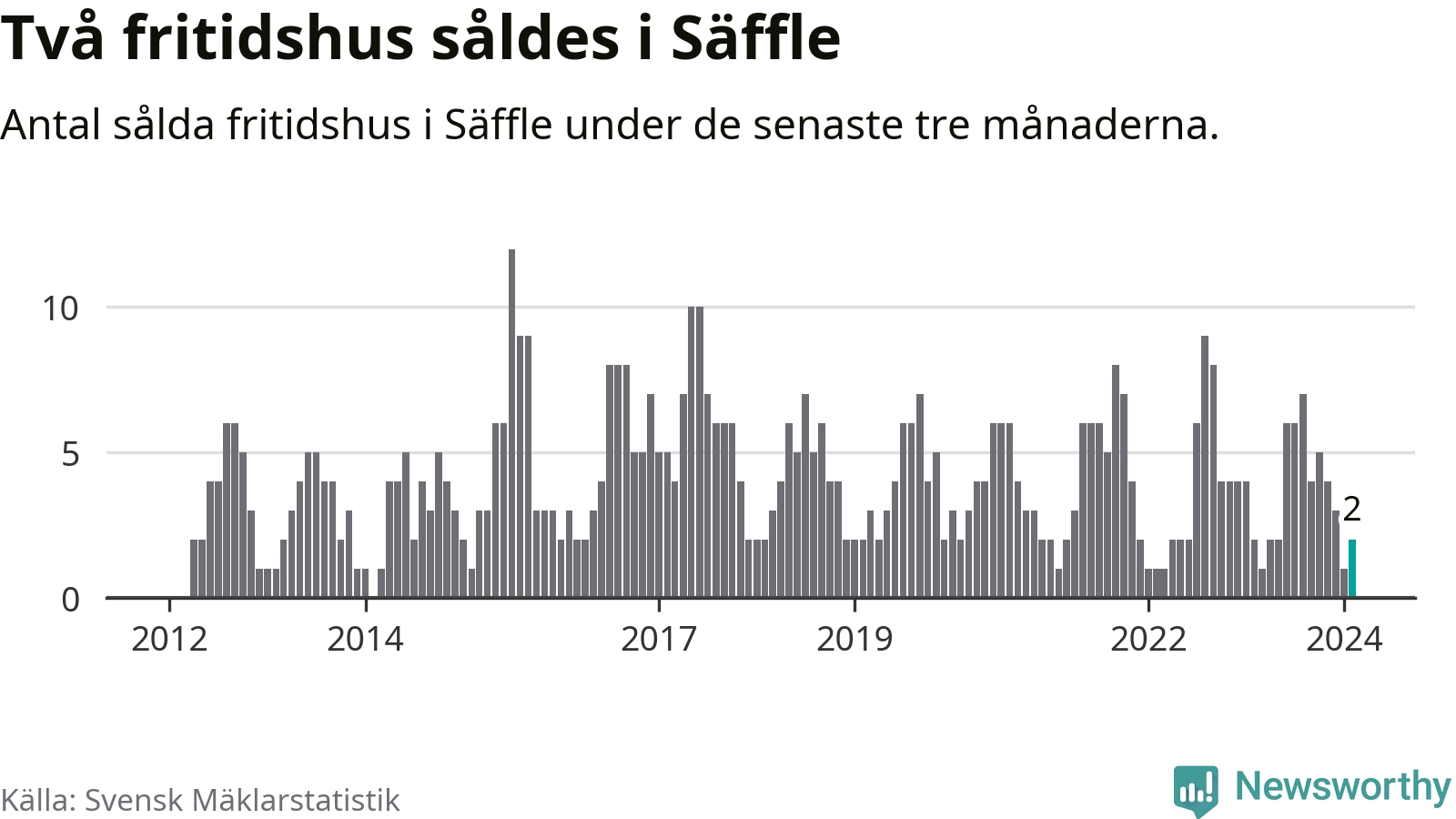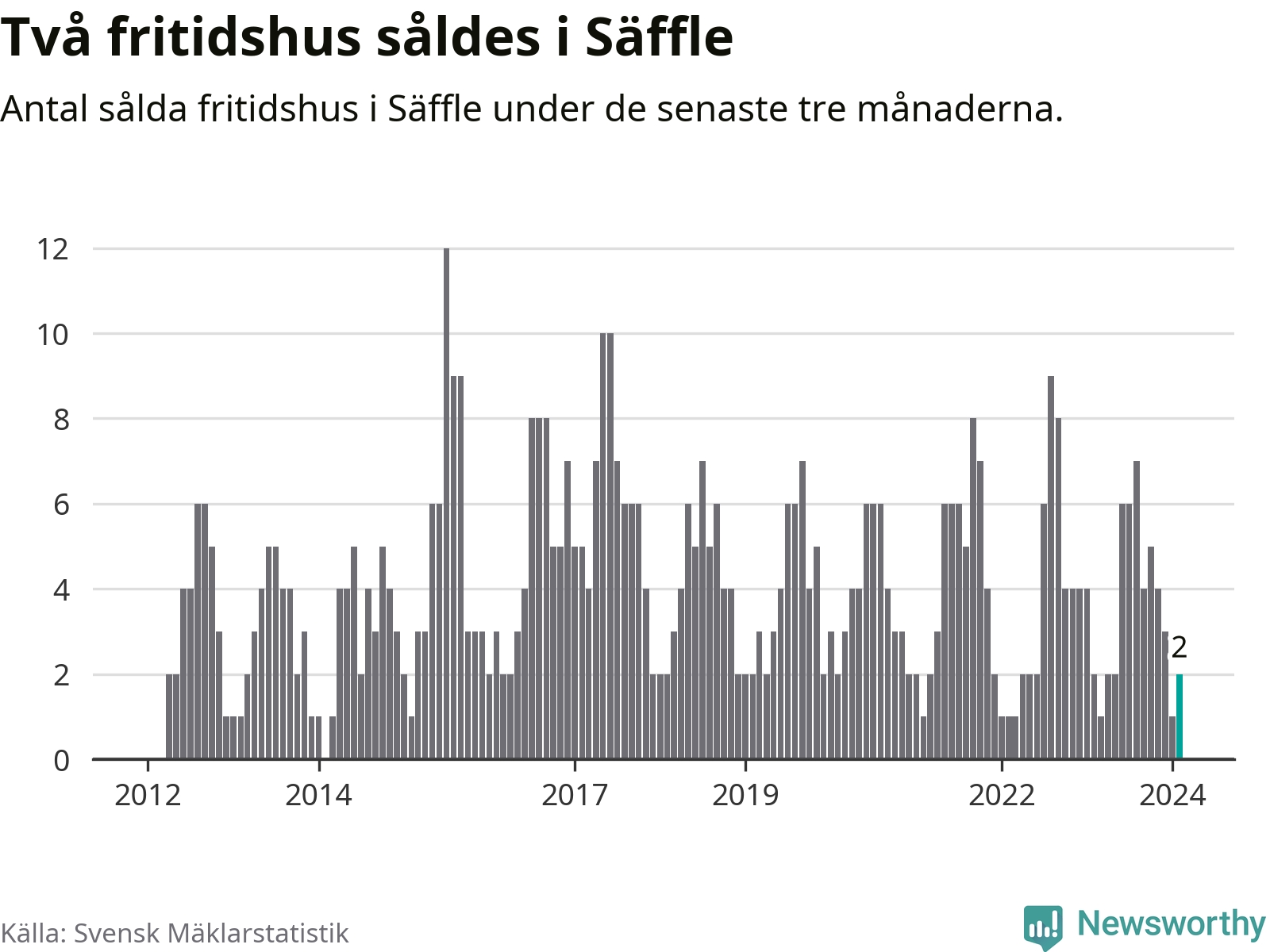 Mellan december och februari gjordes sammanlagt två affärer med fritidshus i Säffle kommun. Det är lika många affärer som vid motsvarande tid i fjol.