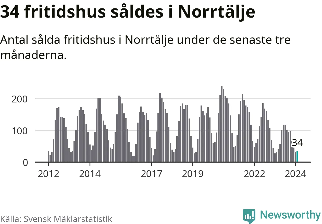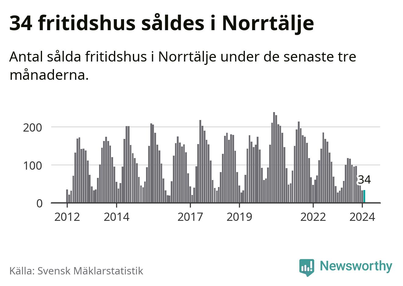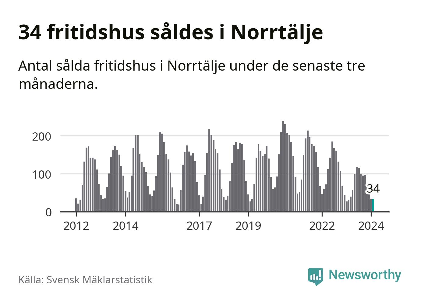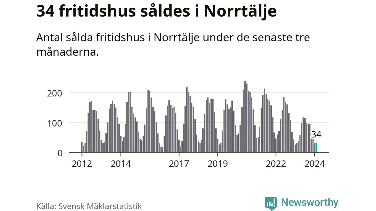 Sammanlagt såldes 34 fritidshus i Norrtälje kommun mellan december 2023 och februari till ett genomsnittligt pris på 3,1 miljoner kronor. I fjol gjordes 32 affärer vid den här tiden på året.