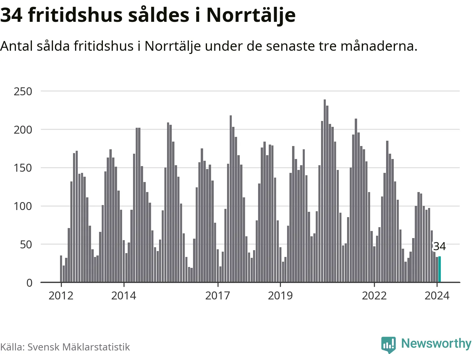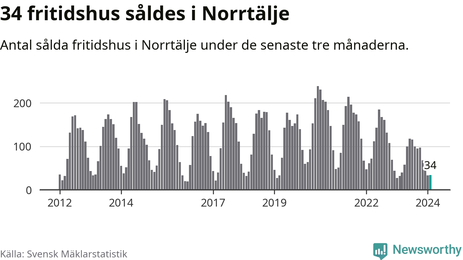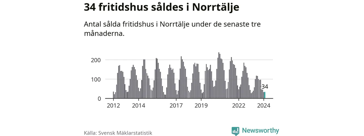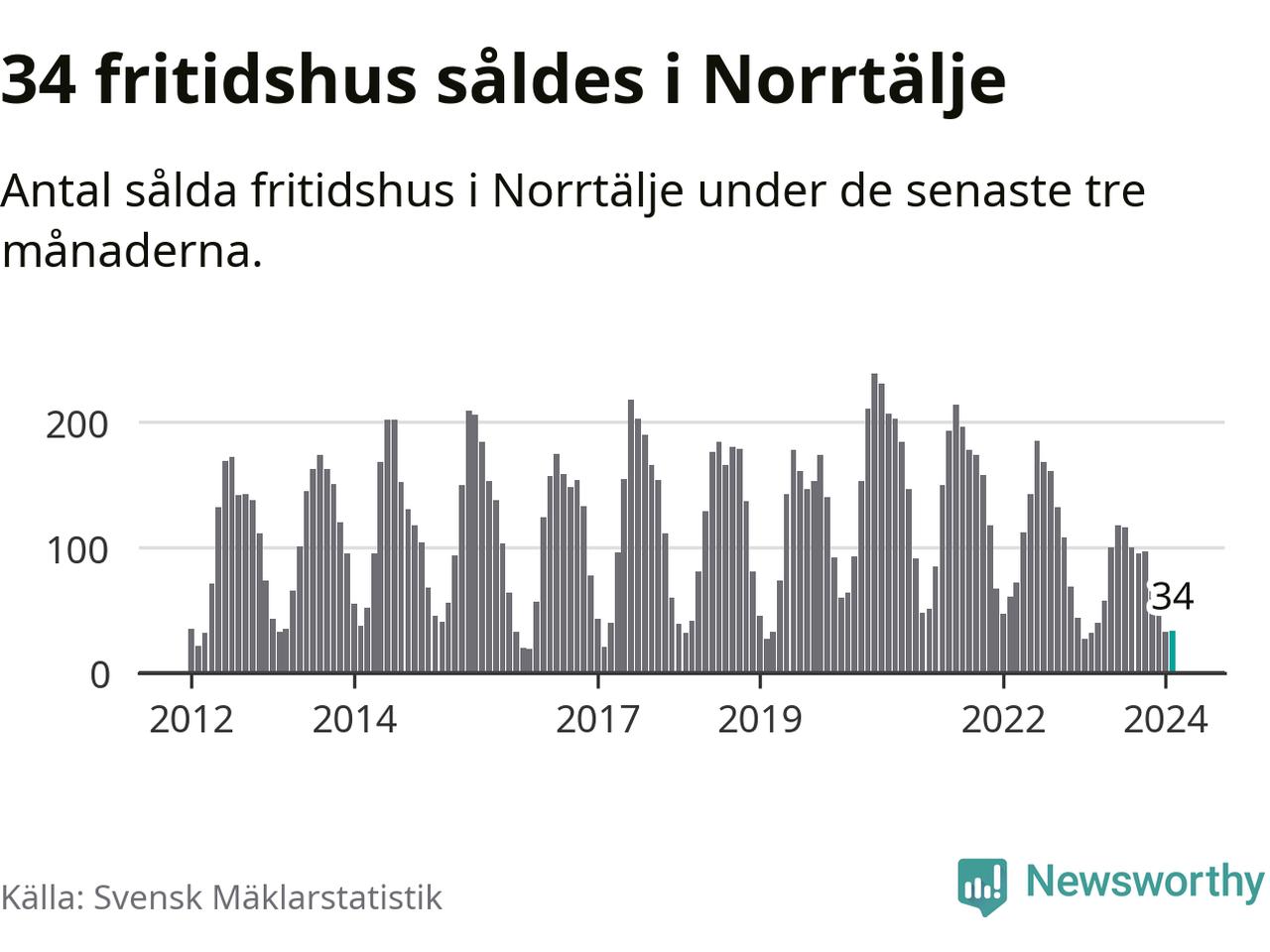 Sammanlagt såldes 34 fritidshus i Norrtälje kommun mellan december 2023 och februari till ett genomsnittligt pris på 3,1 miljoner kronor. I fjol gjordes 32 affärer vid den här tiden på året.