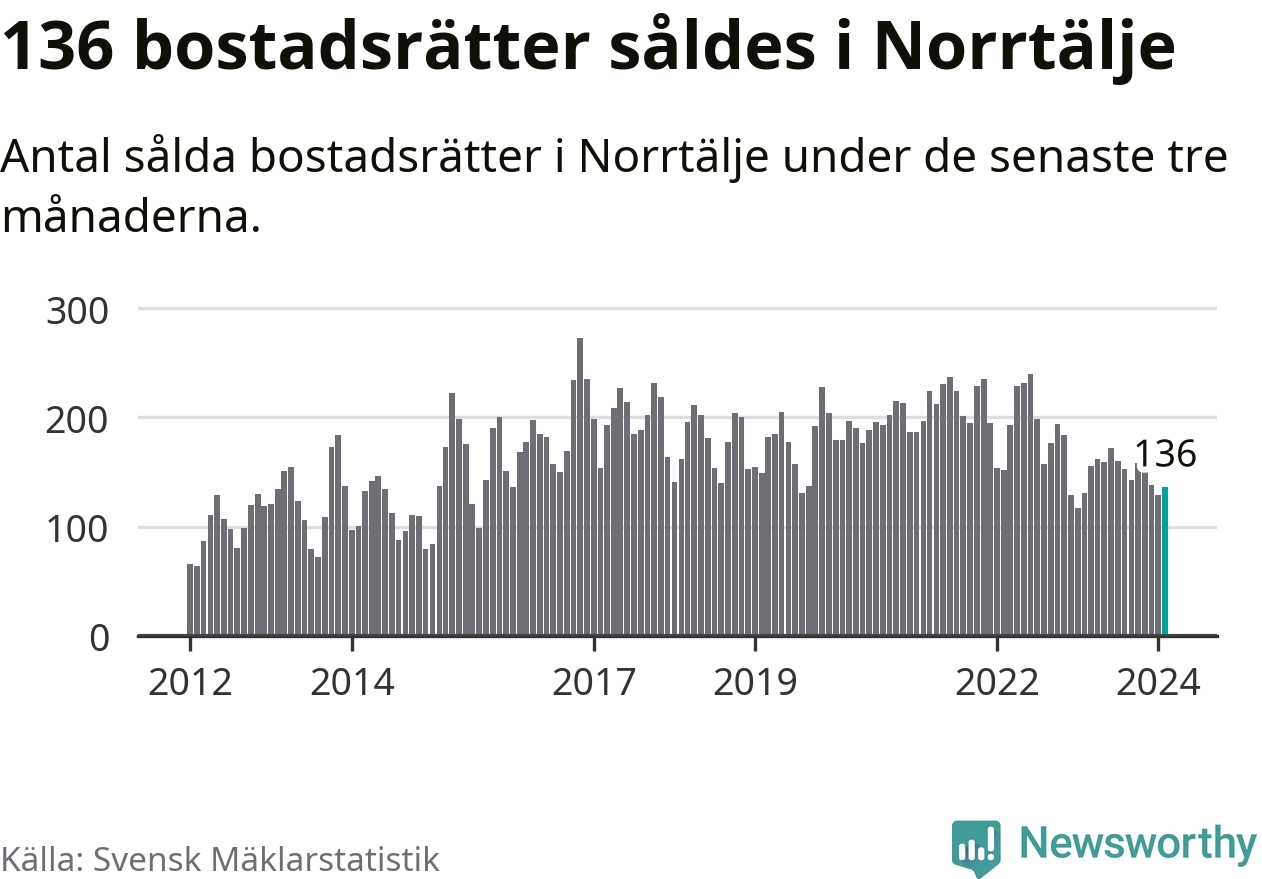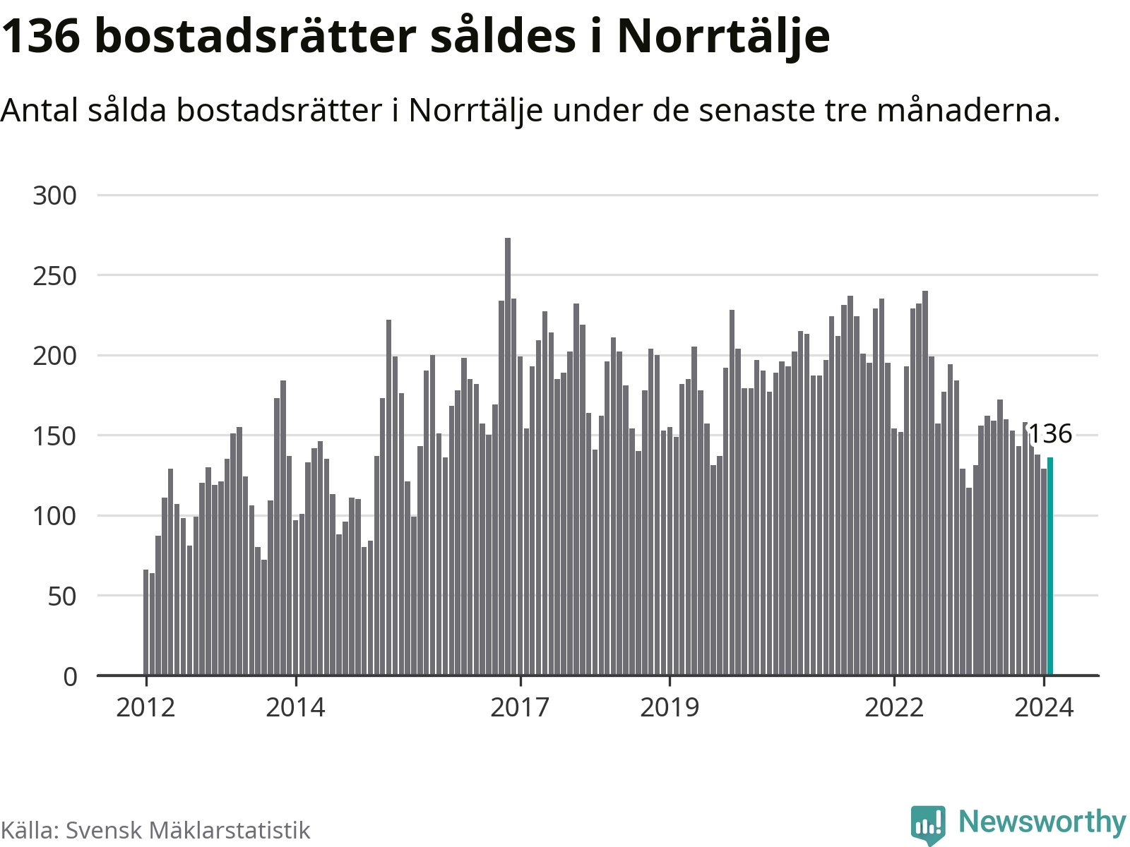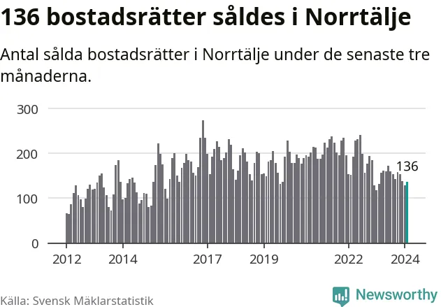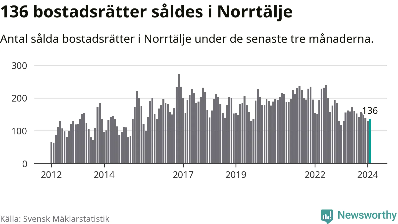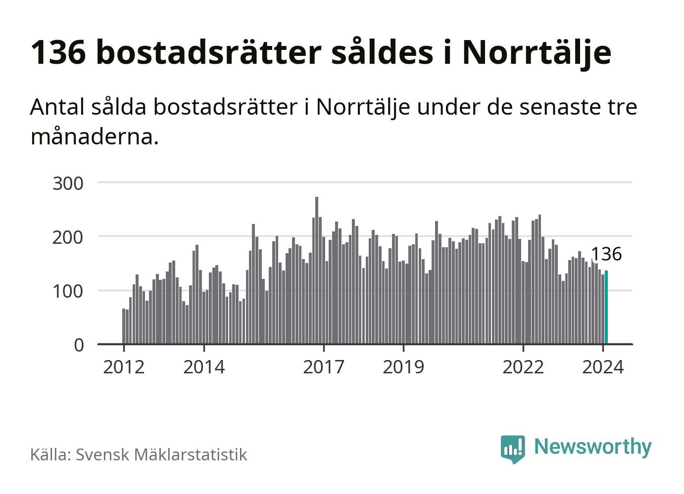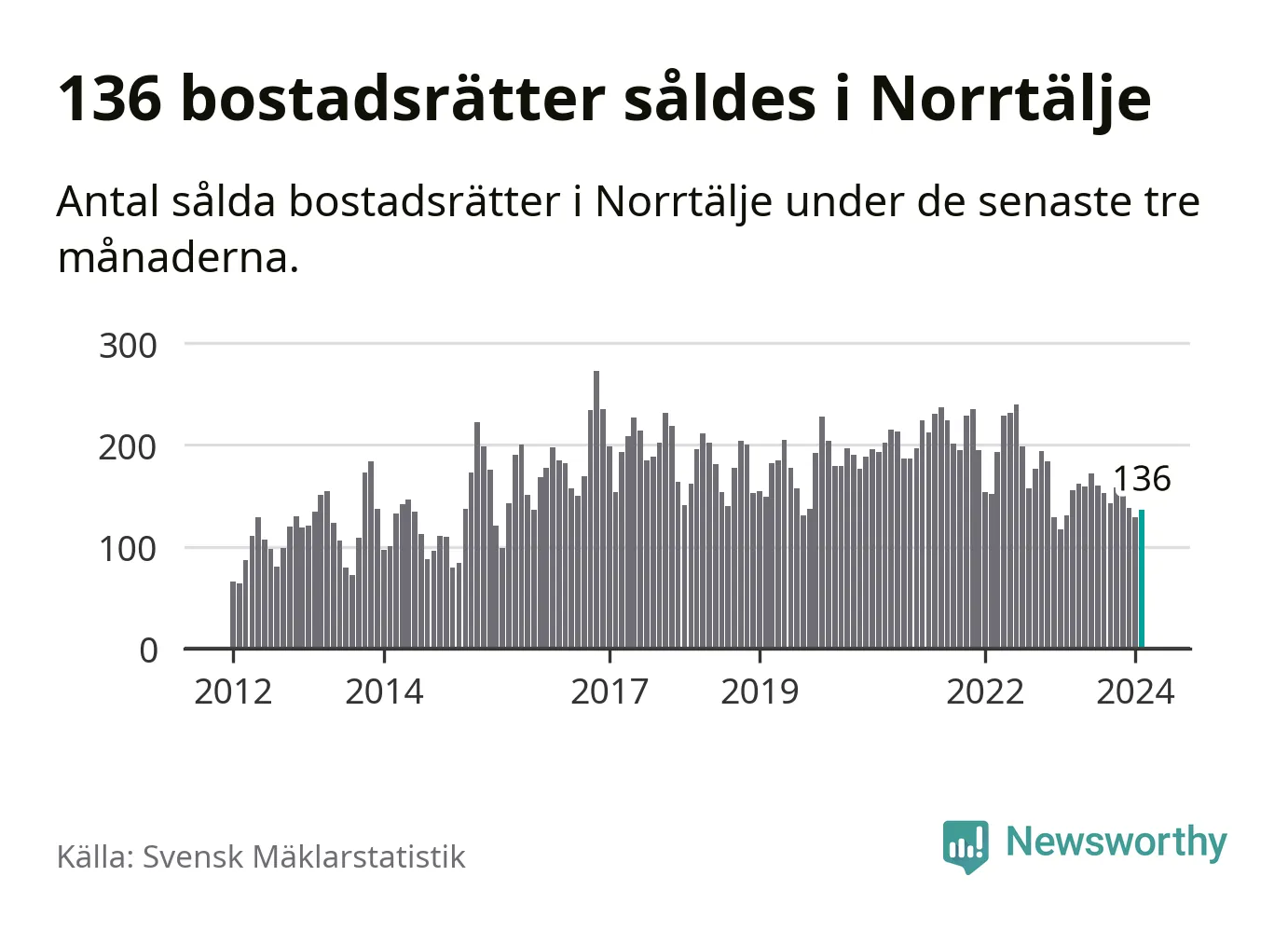 Sammanlagt såldes 136 bostadsrätter i Norrtälje kommun mellan december och februari till ett genomsnittligt pris på 1,9 miljoner kronor. I fjol gjordes 131 affärer vid den här tiden på året.