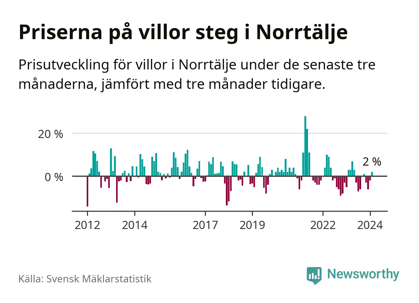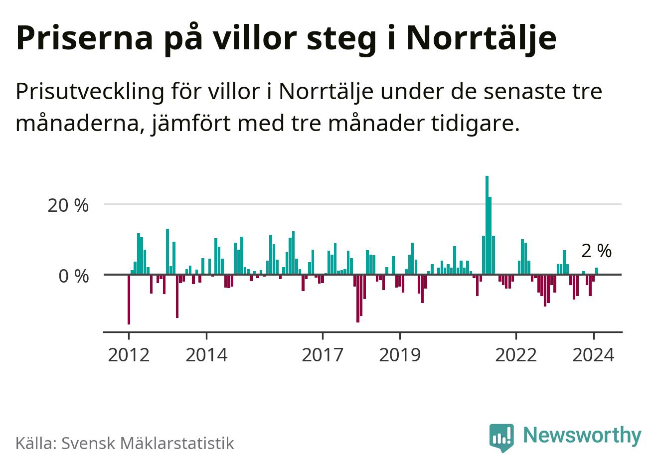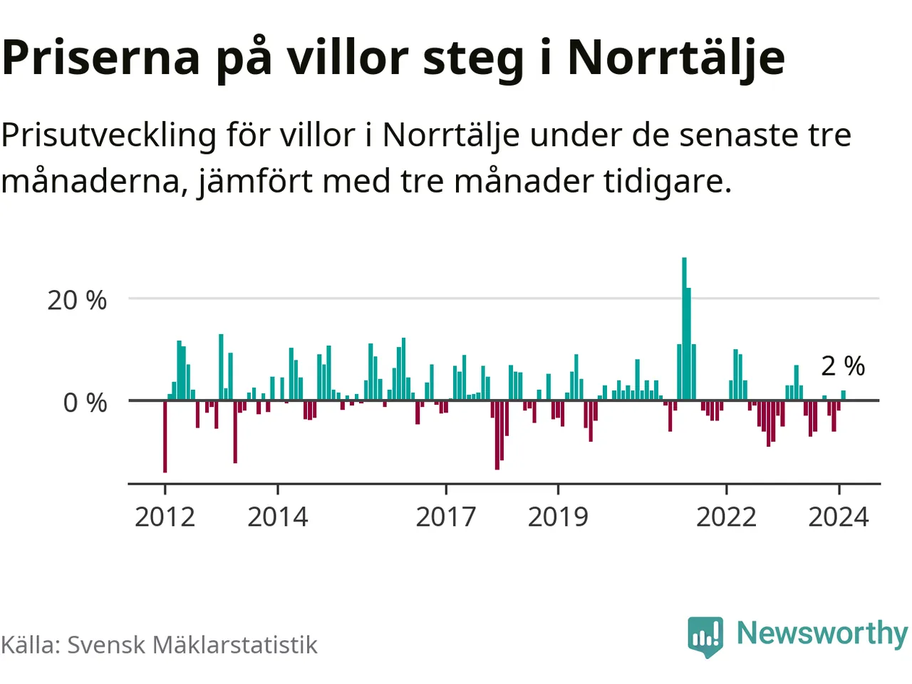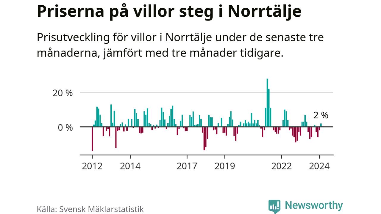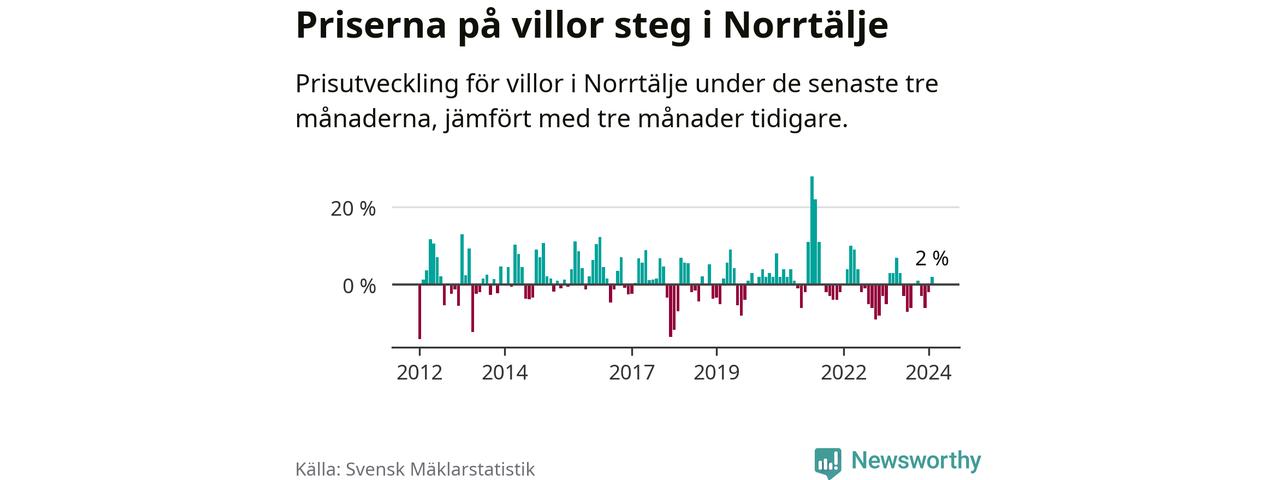 Villapriserna har gått upp i Norrtälje kommun. Medelpriset på försäljningarna under de senaste tre månaderna visar på en uppgång med 2 procent.