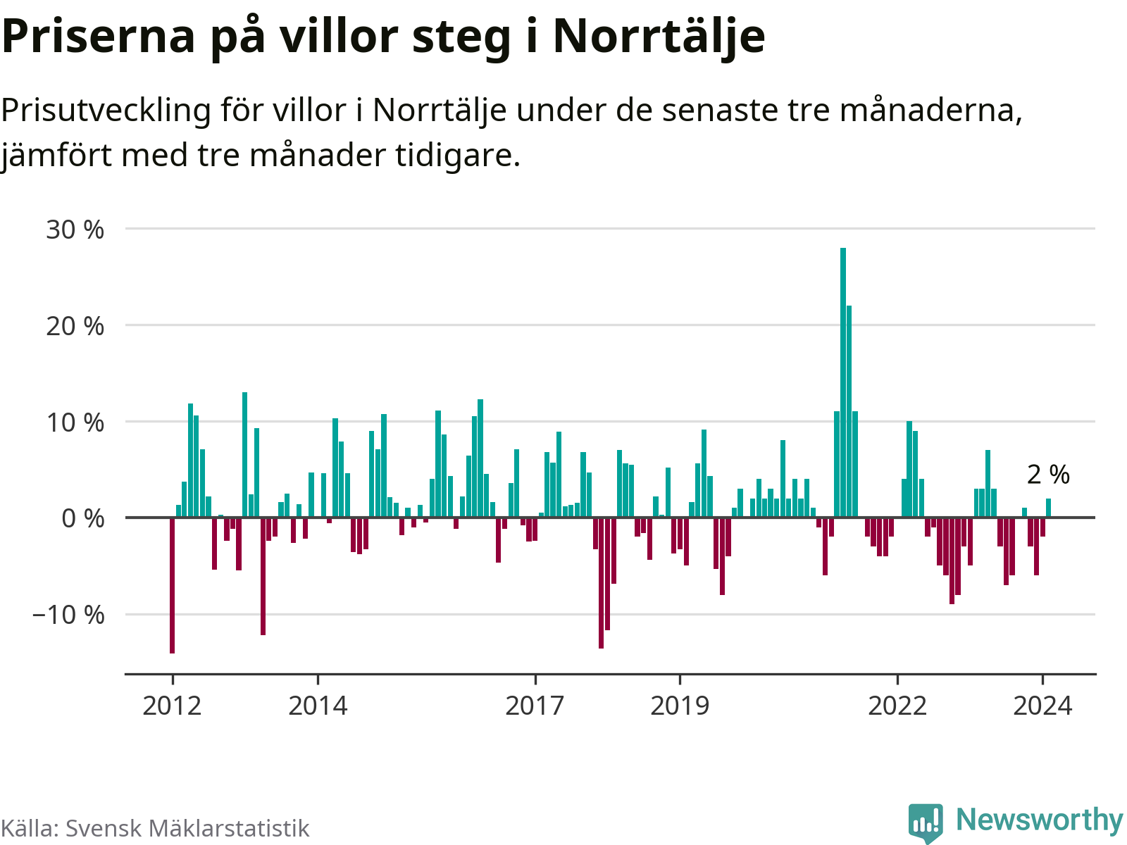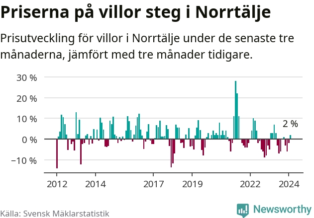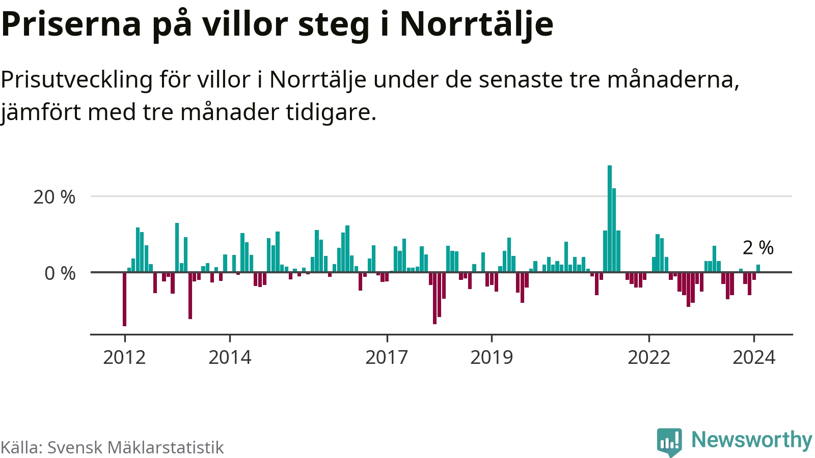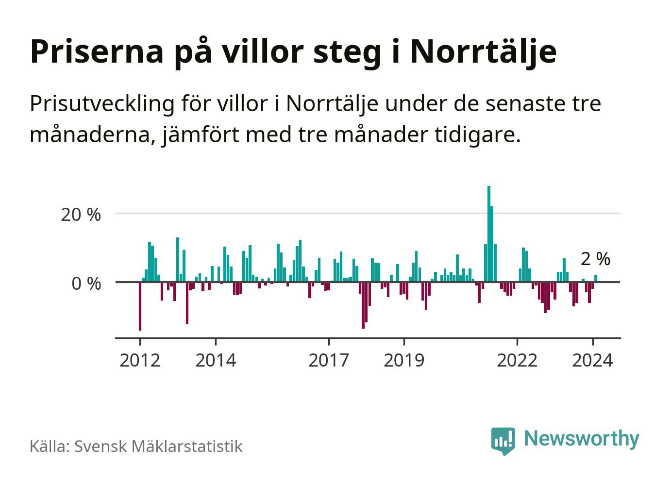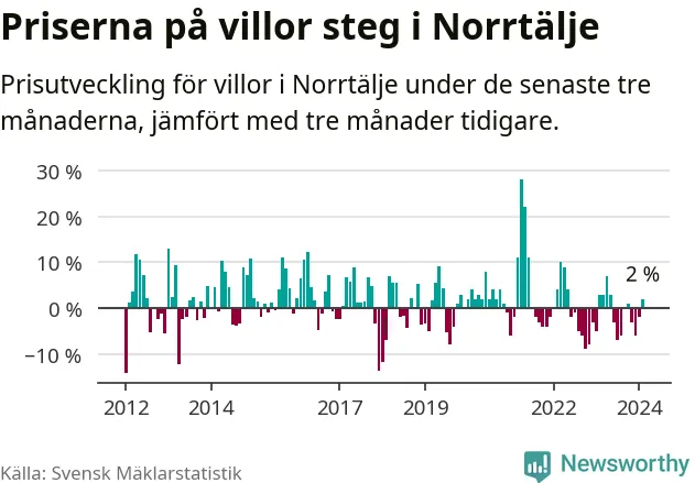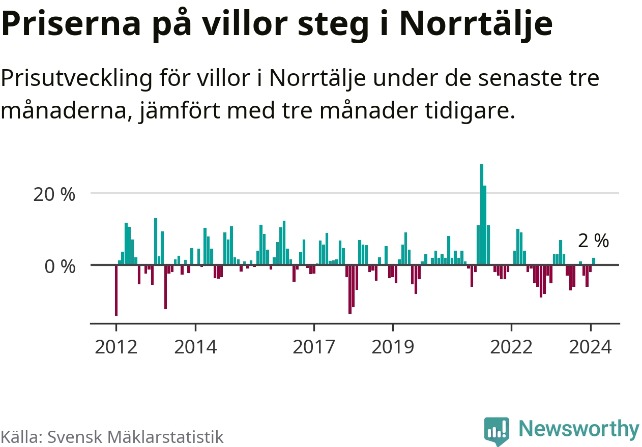 Villapriserna har gått upp i Norrtälje kommun. Medelpriset på försäljningarna under de senaste tre månaderna visar på en uppgång med 2 procent.