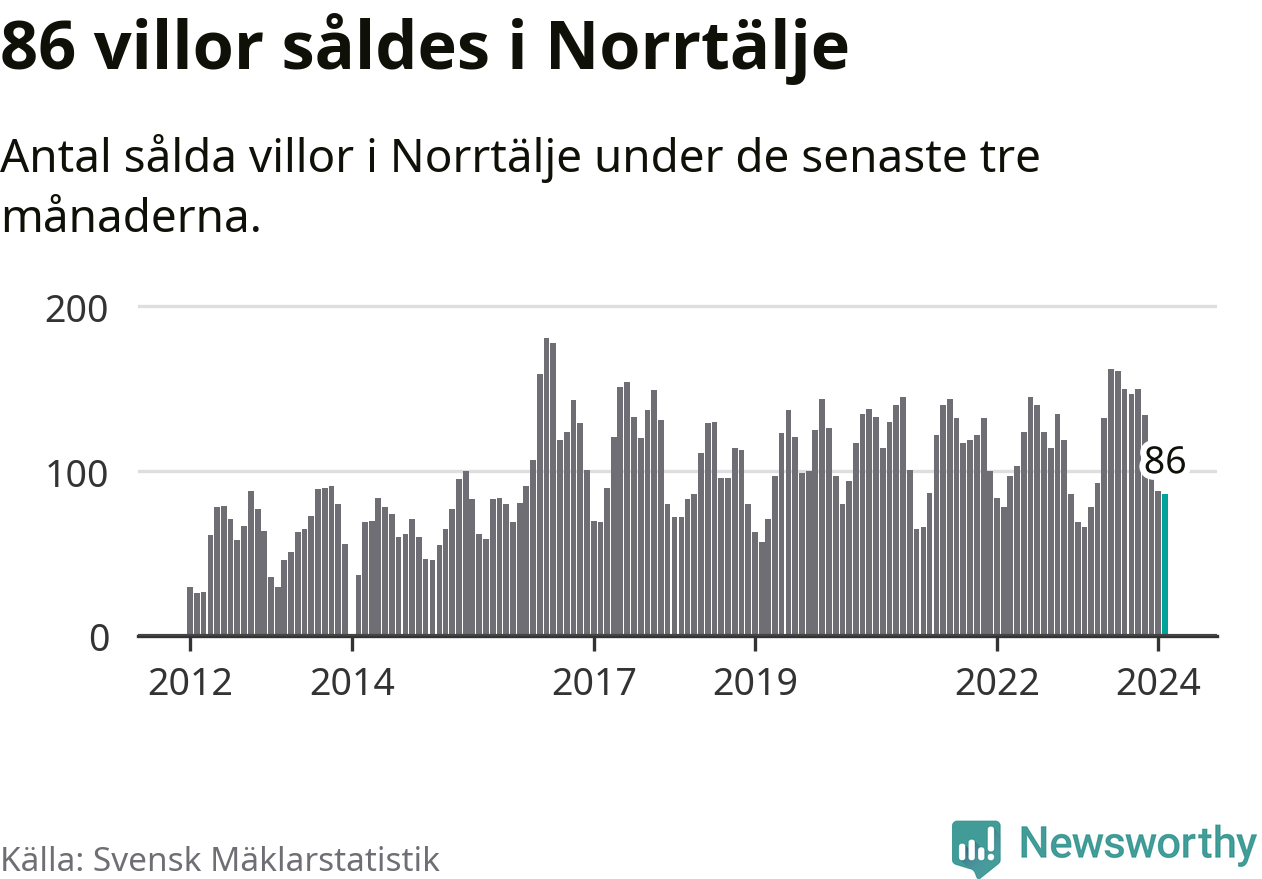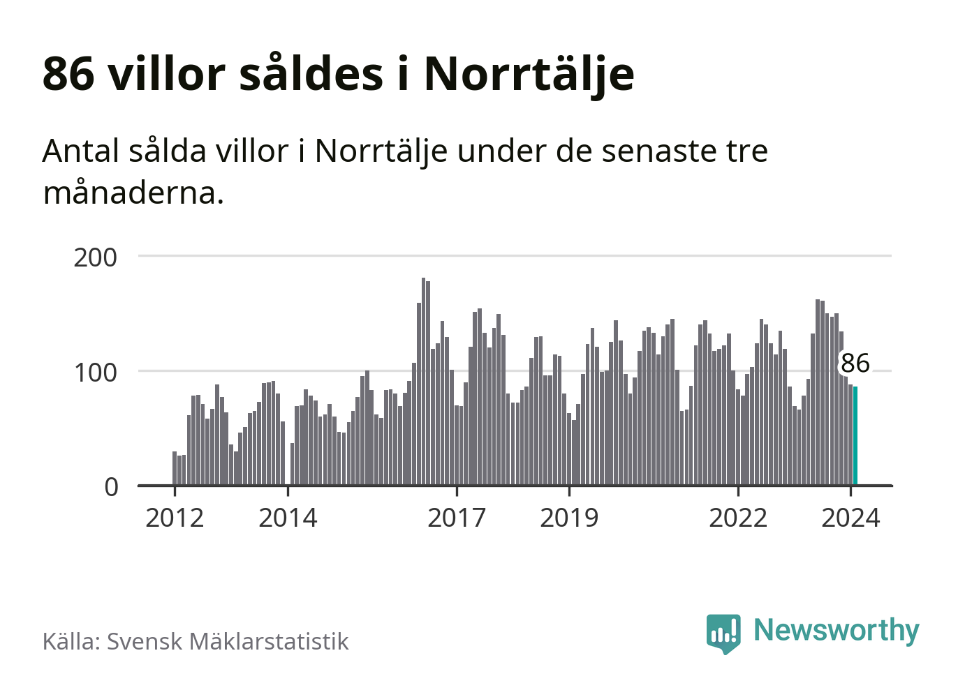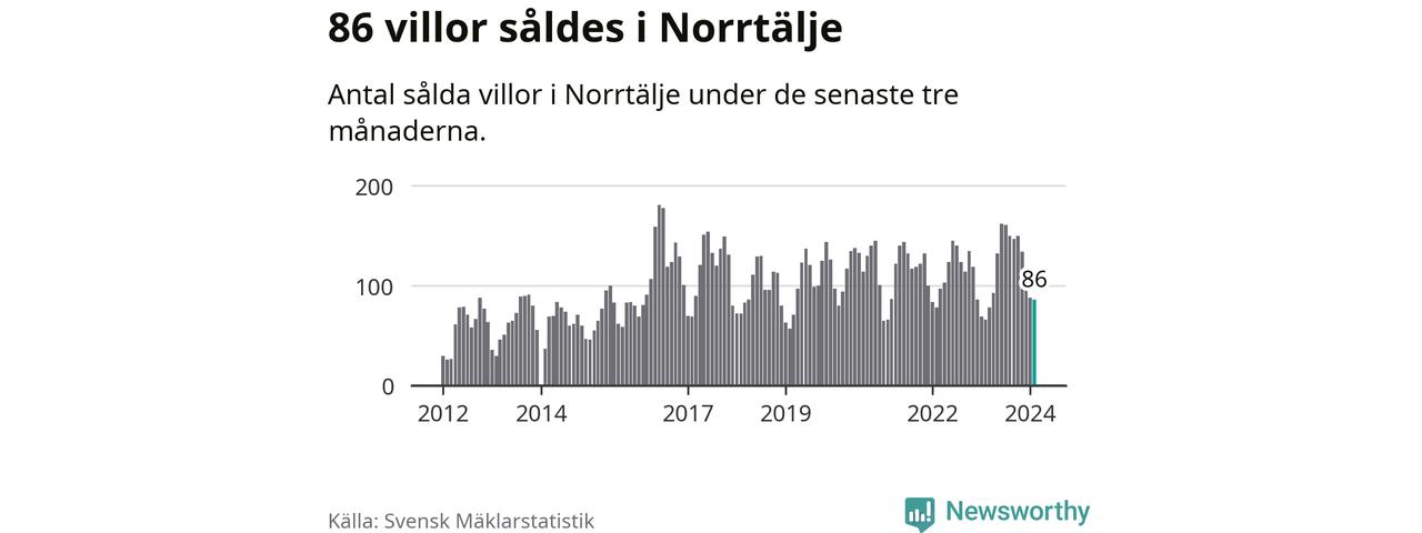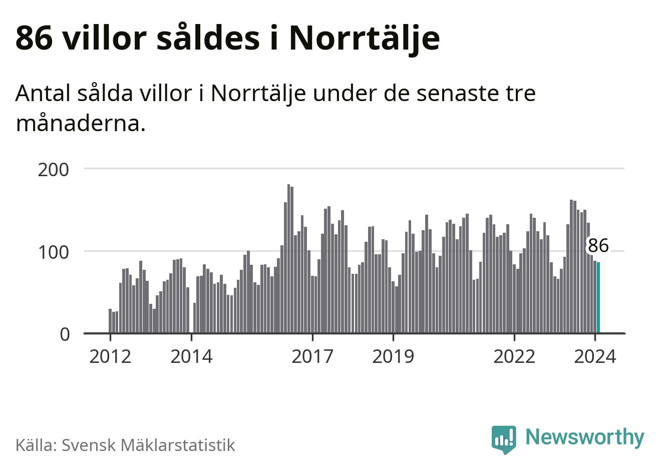 Sammanlagt såldes 86 villor i Norrtälje kommun mellan december och februari till ett genomsnittligt pris på 3,6 miljoner kronor. I fjol gjordes 66 affärer vid den här tiden på året.