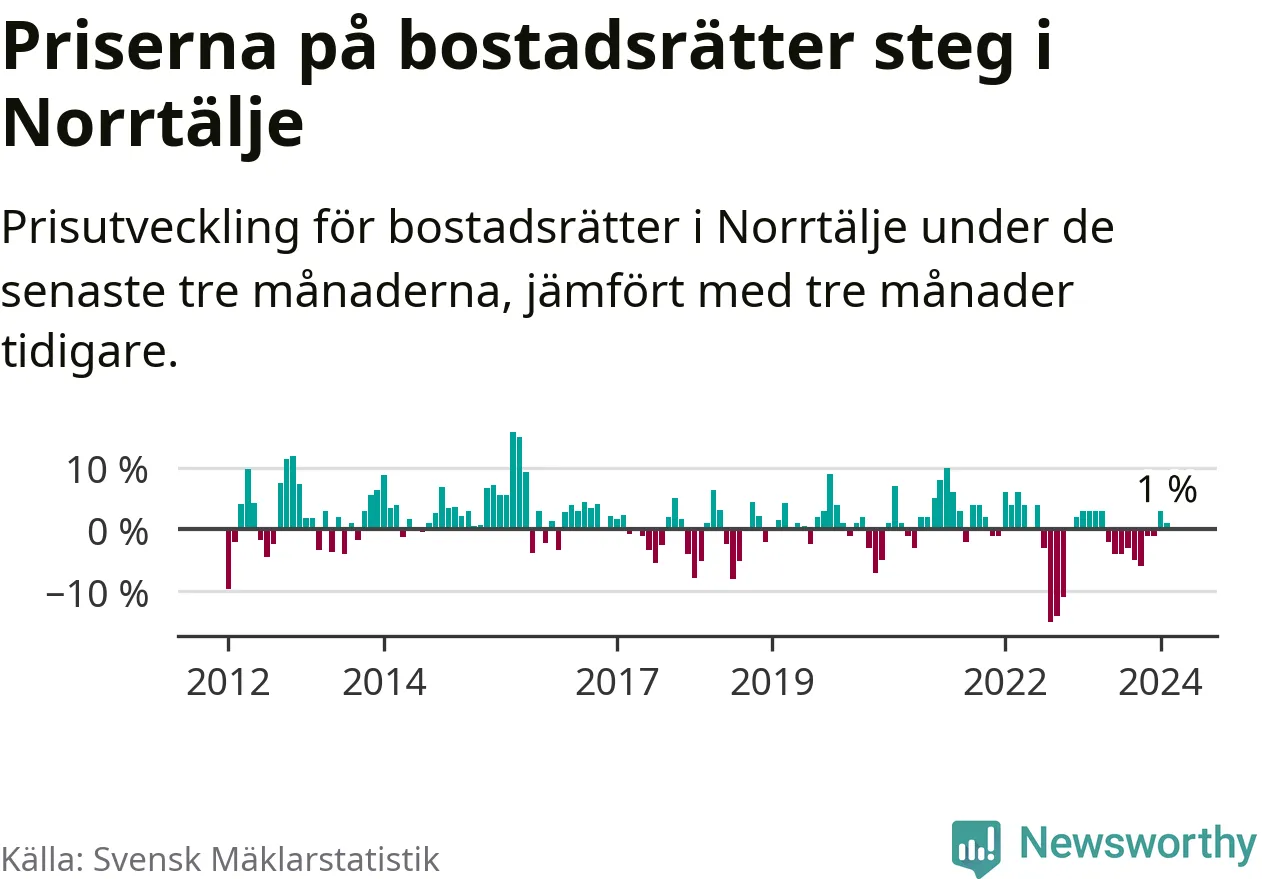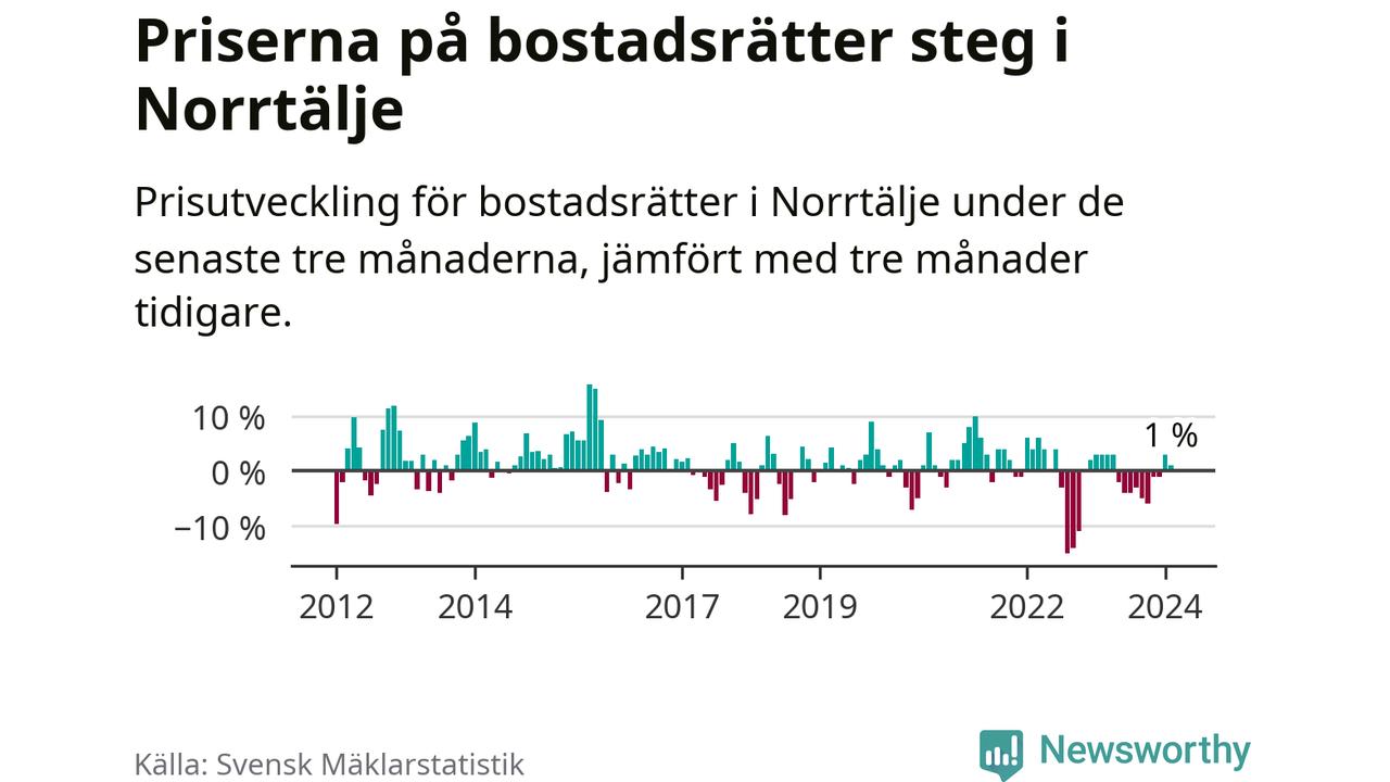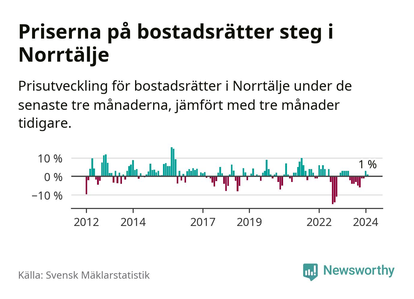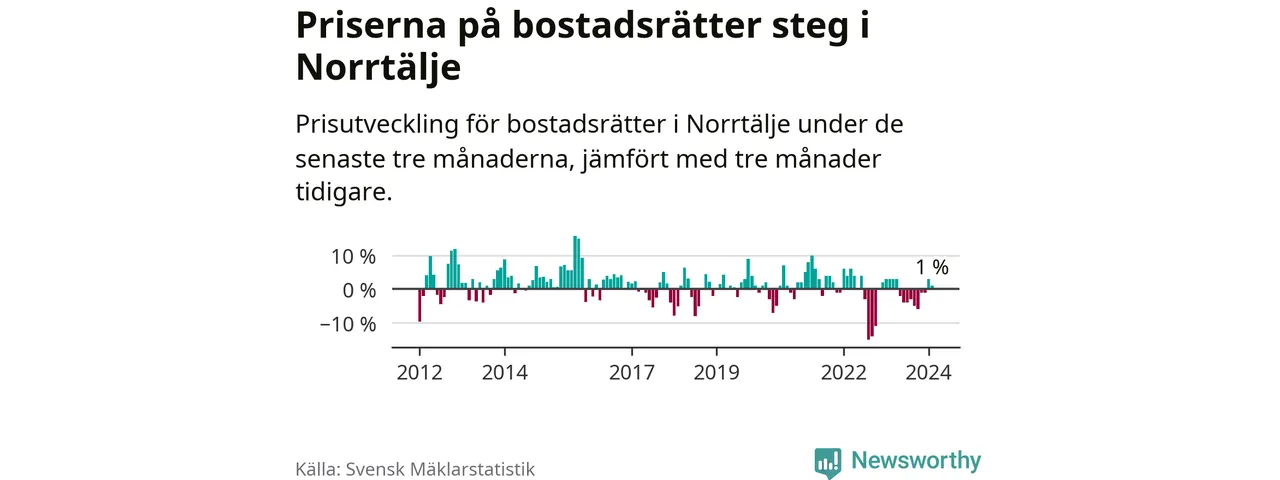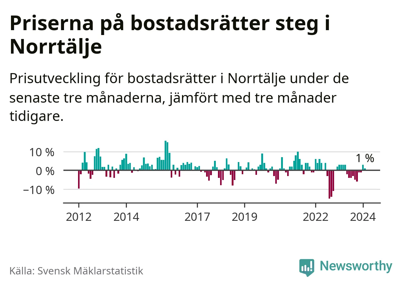 Priserna på bostadsrätter har gått upp i Norrtälje kommun. Medelpriset på försäljningarna under de senaste tre månaderna visar på en uppgång med 1 procent.