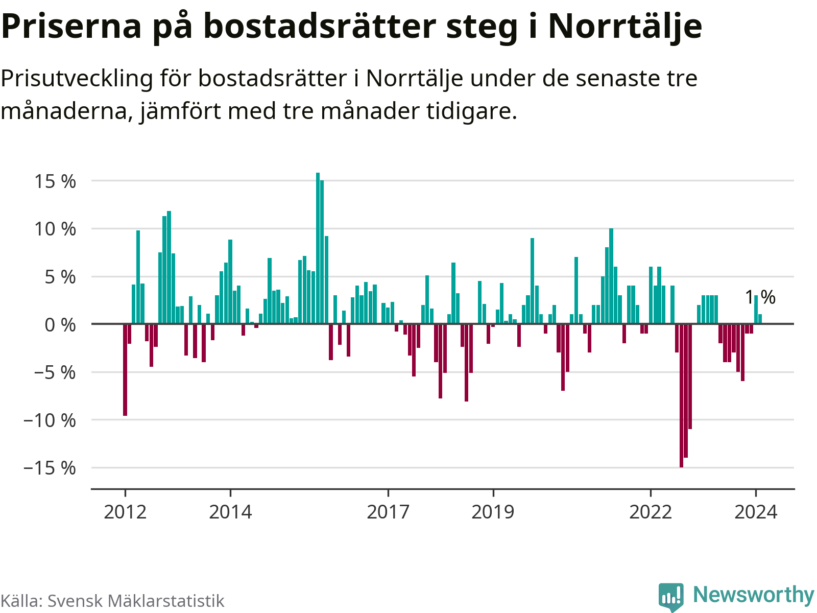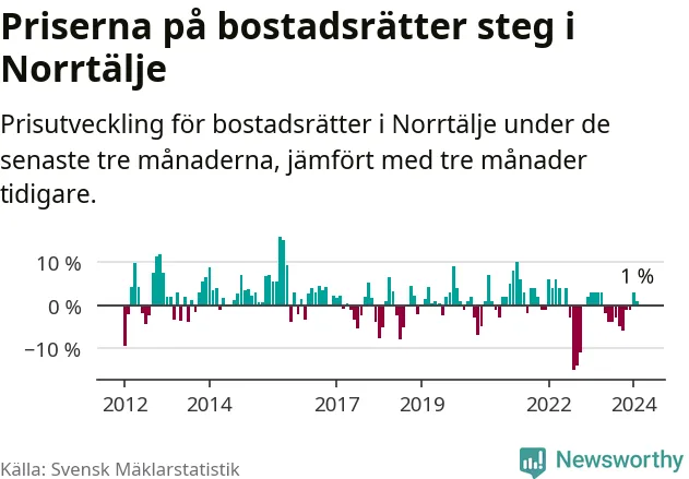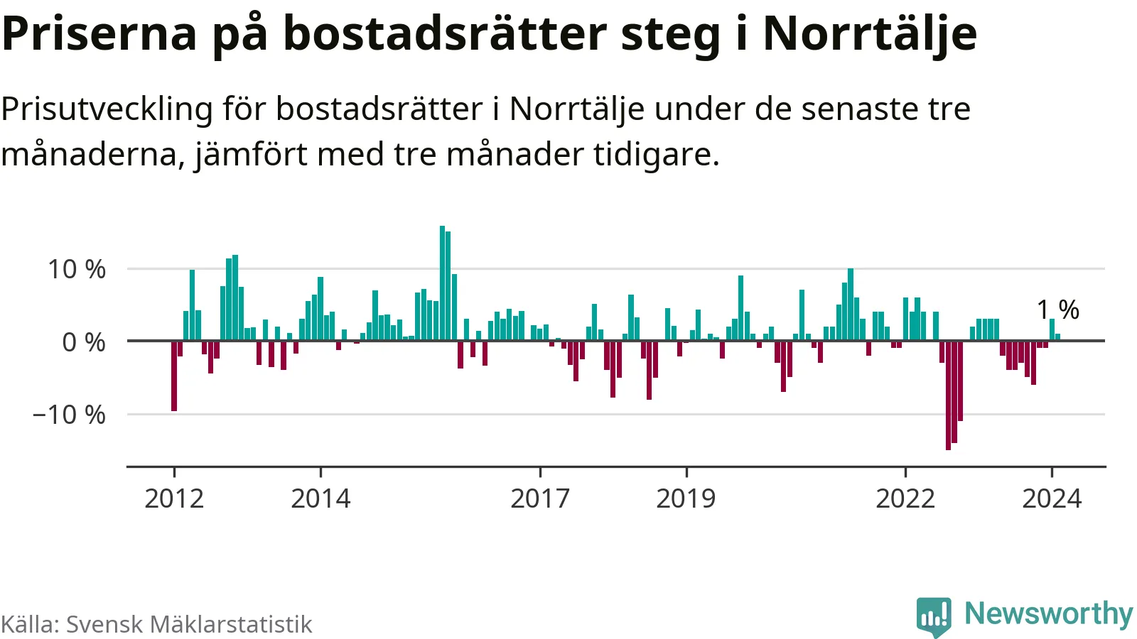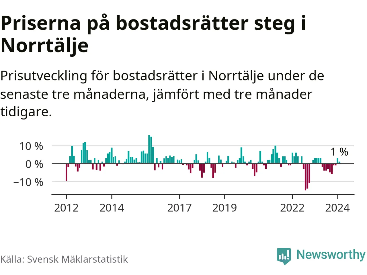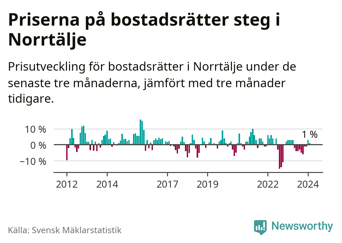 Priserna på bostadsrätter har gått upp i Norrtälje kommun. Medelpriset på försäljningarna under de senaste tre månaderna visar på en uppgång med 1 procent.