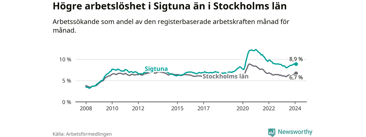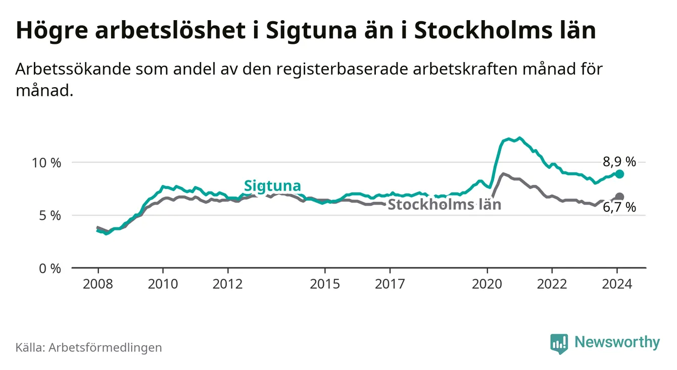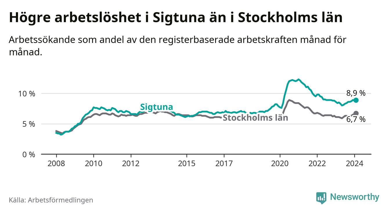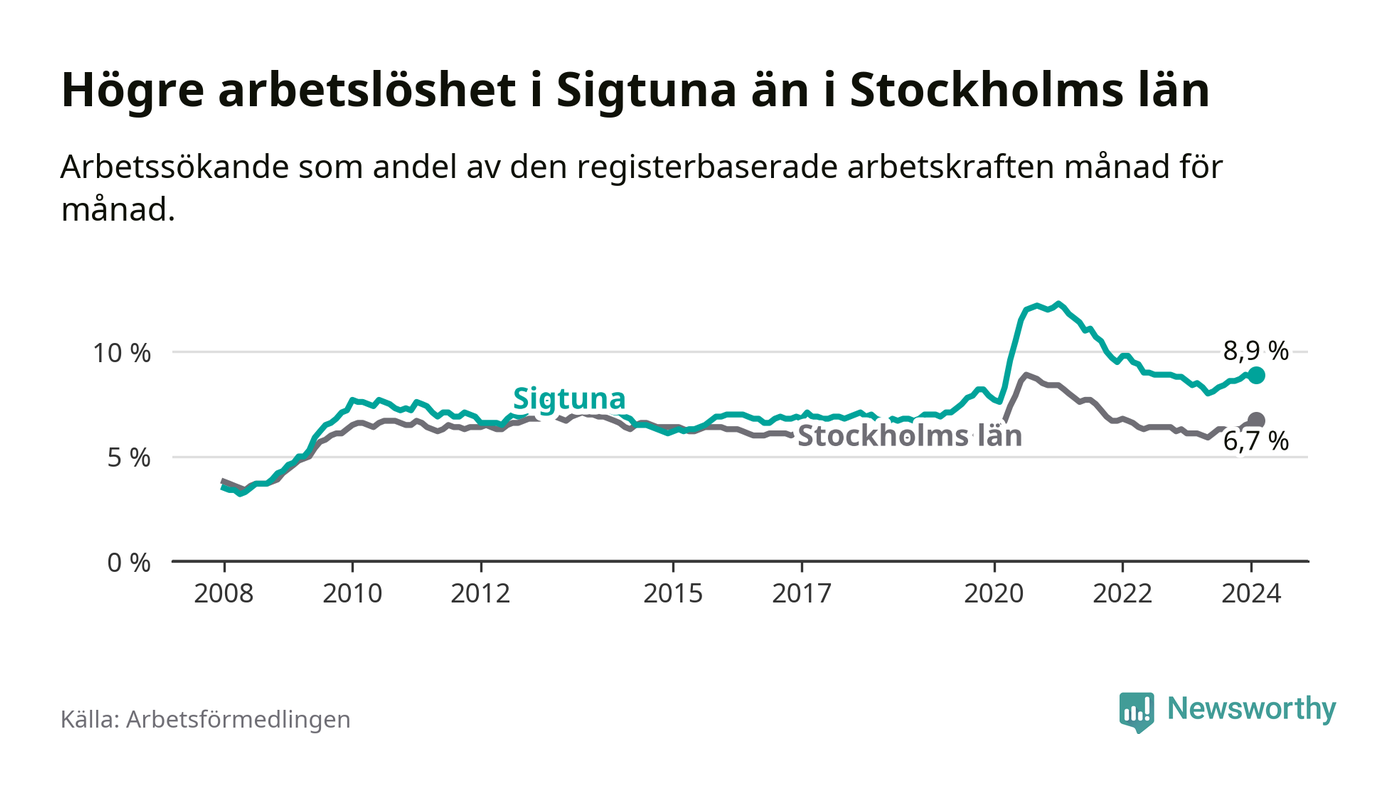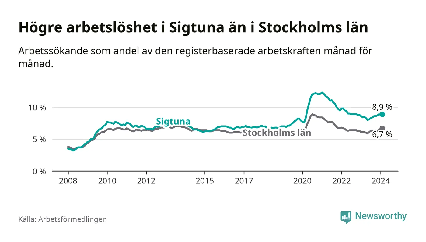 Sigtuna hade redan tidigare högre arbetslöshet än snittet i hela Stockholms län och nu växer klyftan (8,9 procent i kommunen, jämfört med 6,7 procent i hela länet). Ekerö har den lägsta arbetslösheten i länet (3,5 procent), medan Botkyrka har den högsta (11,1 procent).