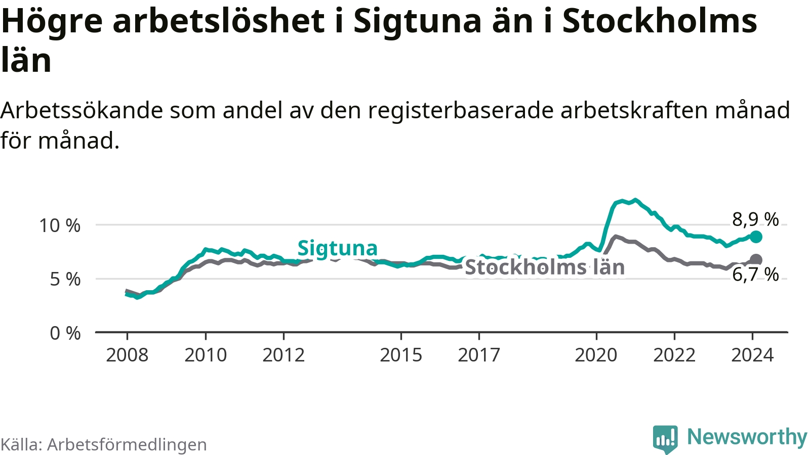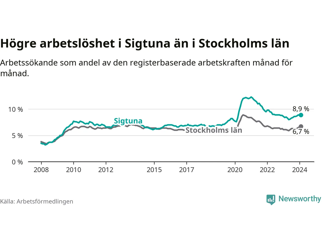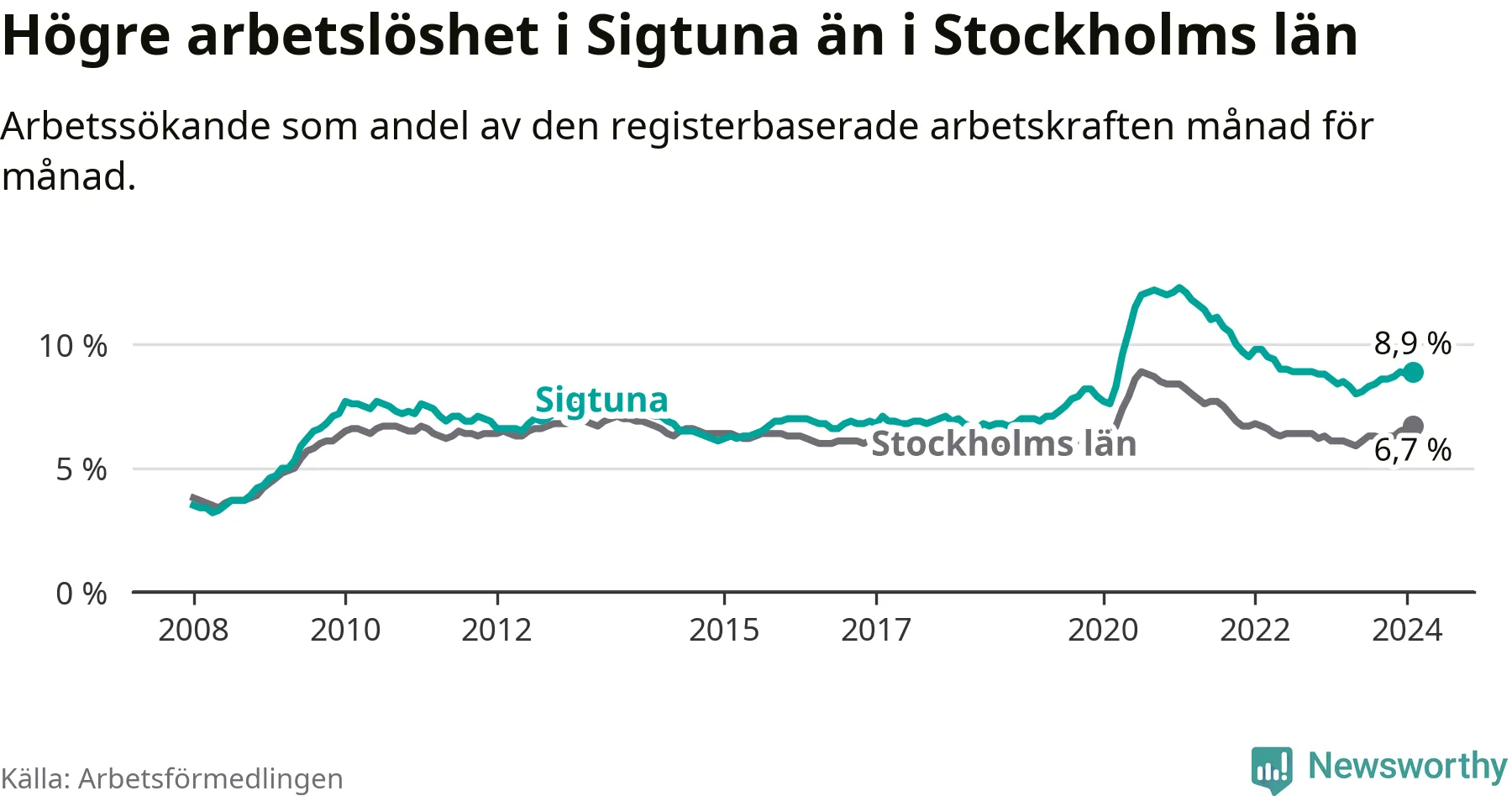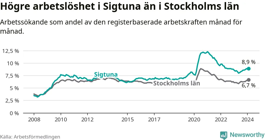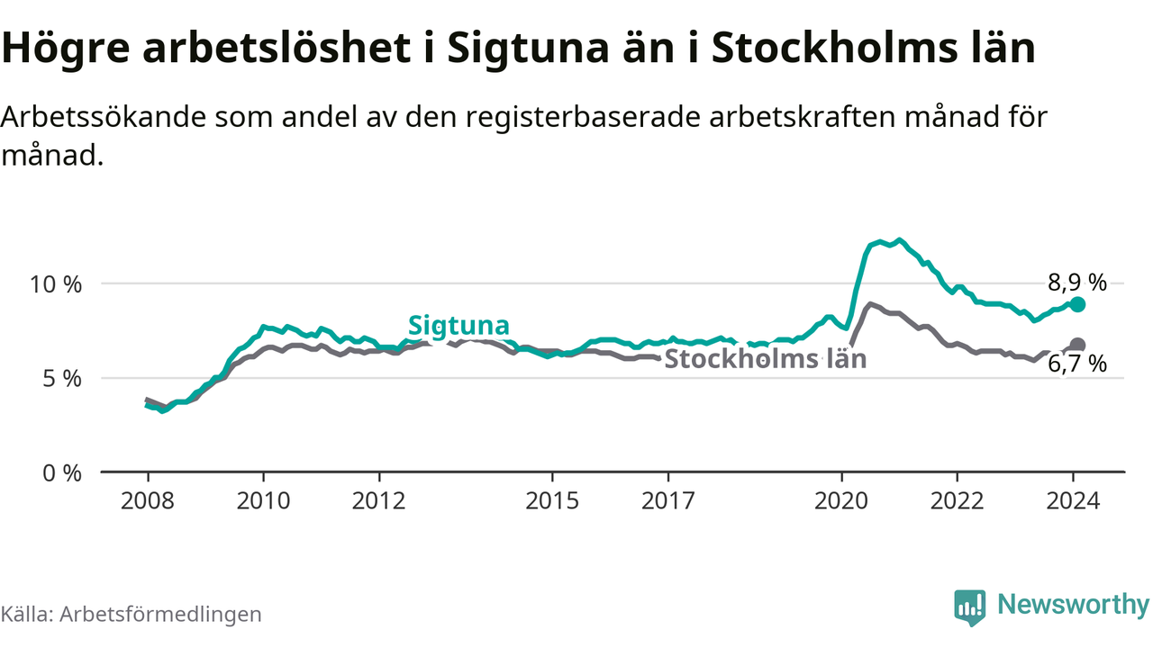 Sigtuna hade redan tidigare högre arbetslöshet än snittet i hela Stockholms län och nu växer klyftan (8,9 procent i kommunen, jämfört med 6,7 procent i hela länet). Ekerö har den lägsta arbetslösheten i länet (3,5 procent), medan Botkyrka har den högsta (11,1 procent).