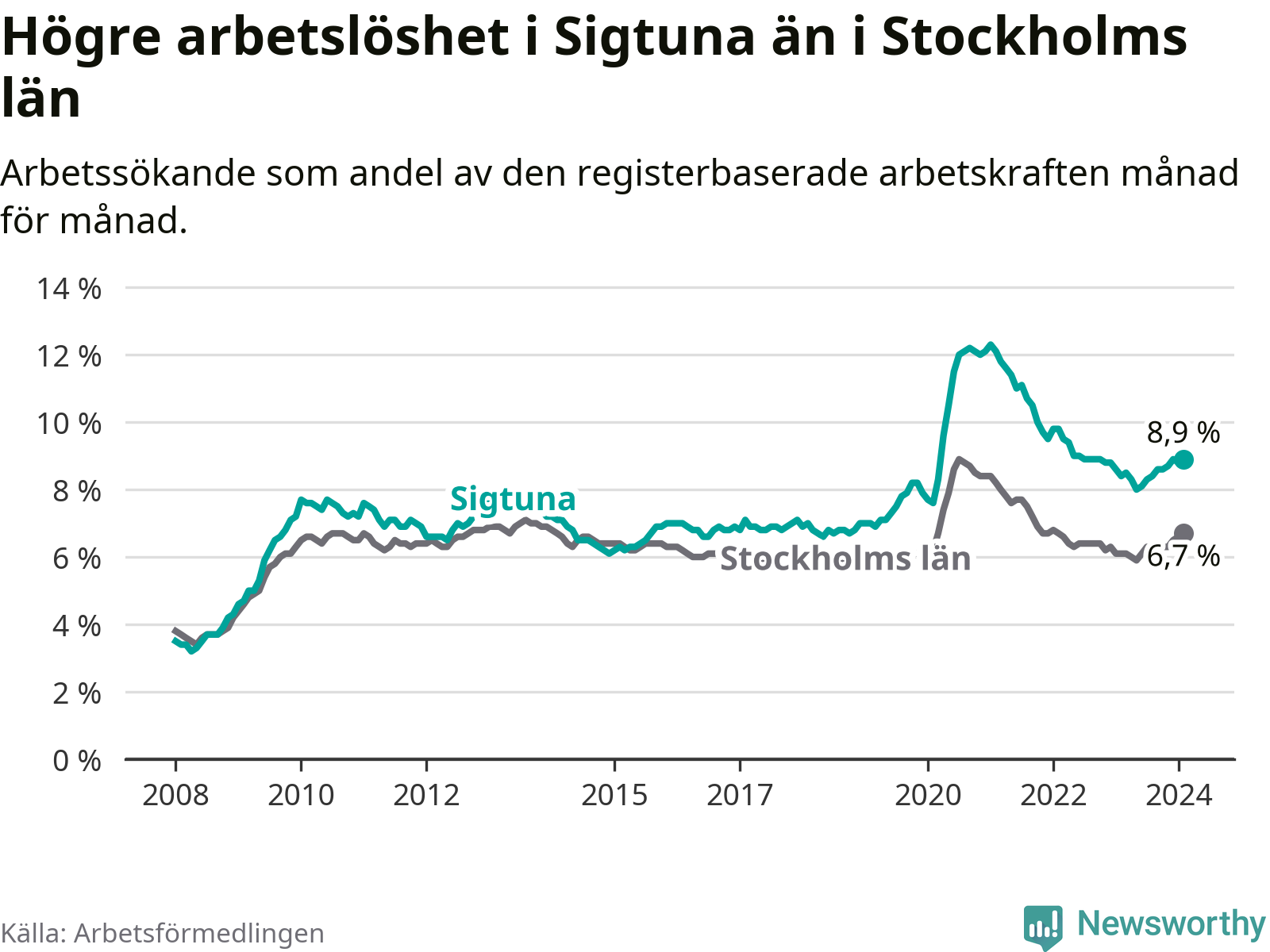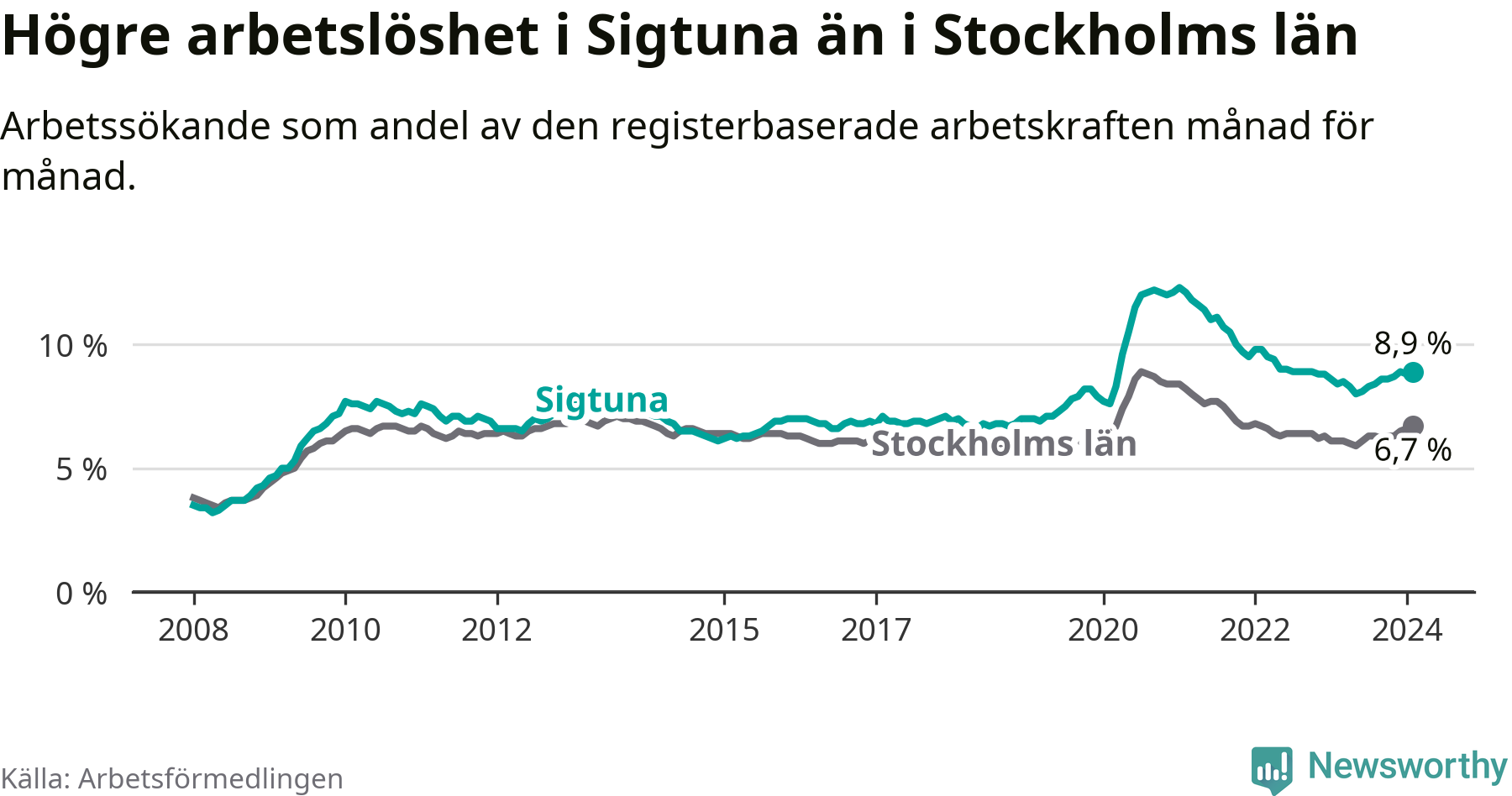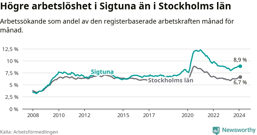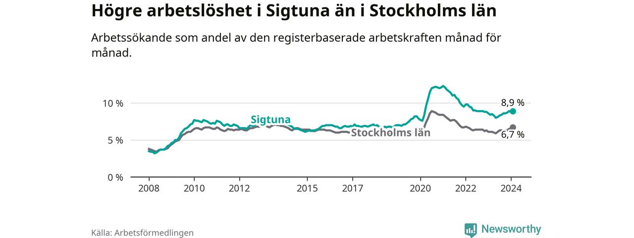 Under februari månad rapporterade Sigtuna kommun en total arbetslöshet på 8,9 procent. Det är en ökning jämfört med samma tidpunkt i fjol (+0,5 procentenheter). Även i Stockholms län stiger arbetslösheten .