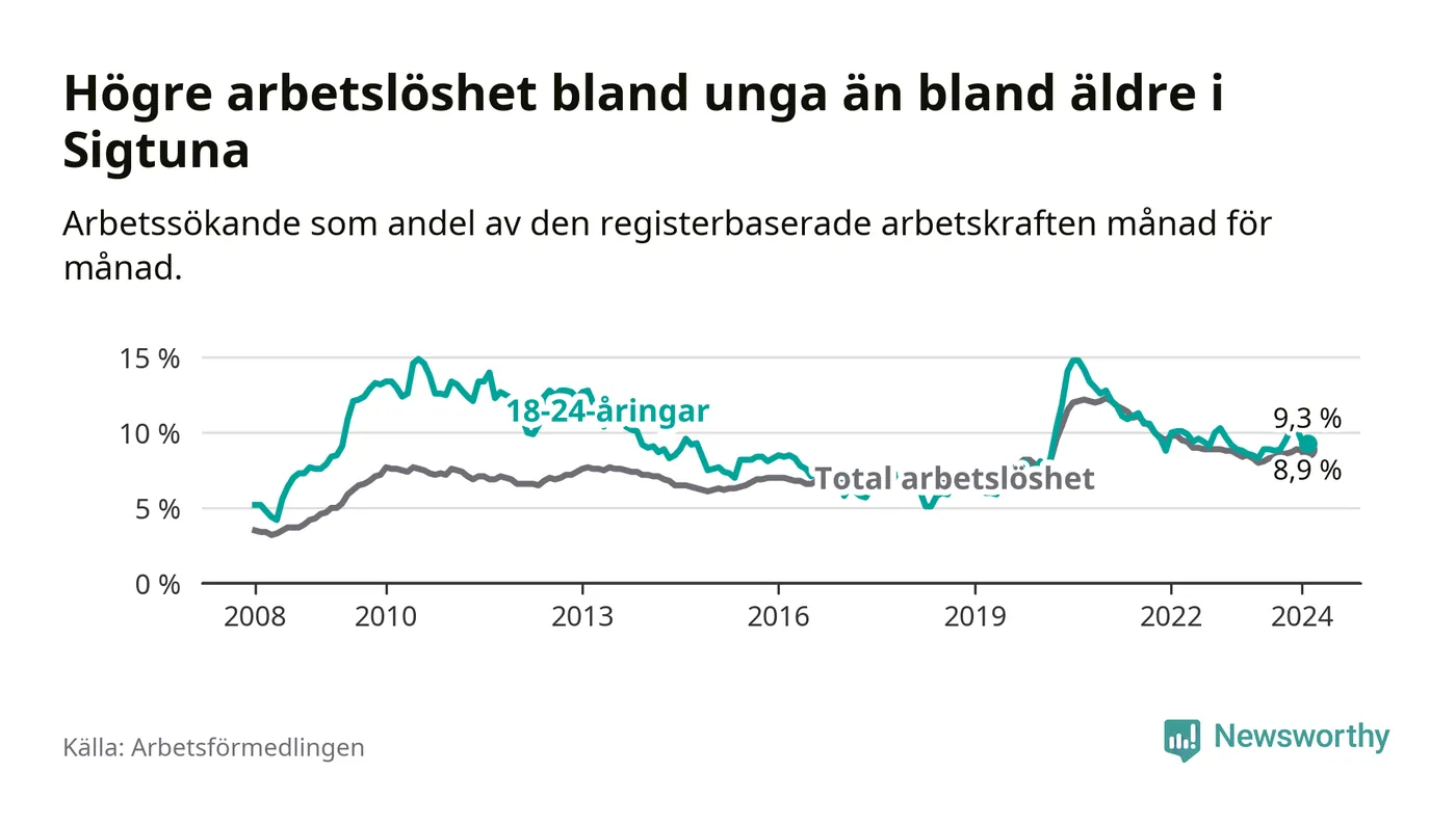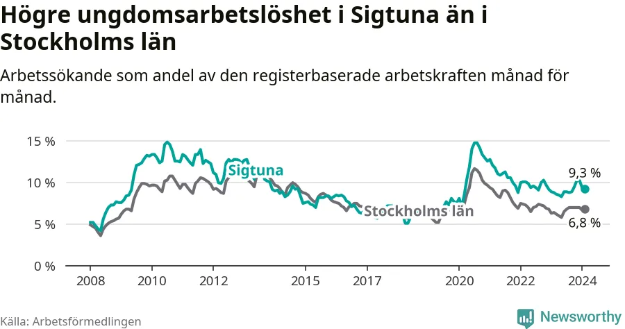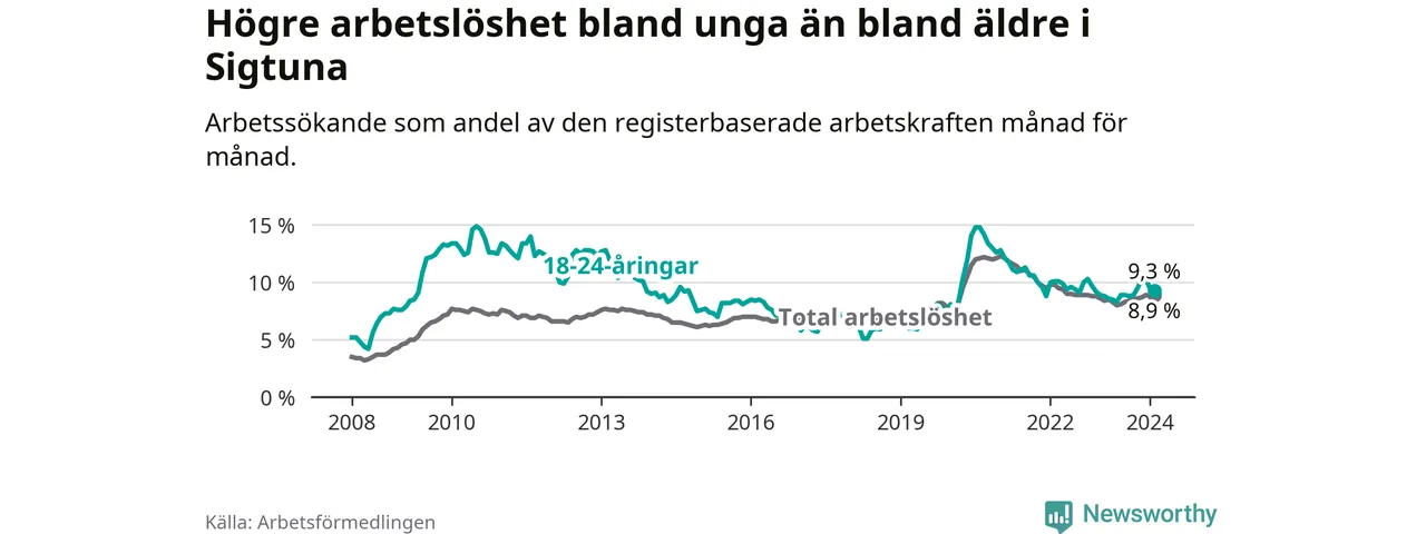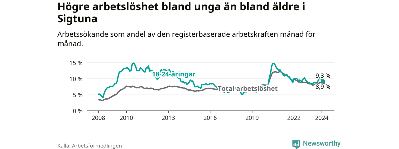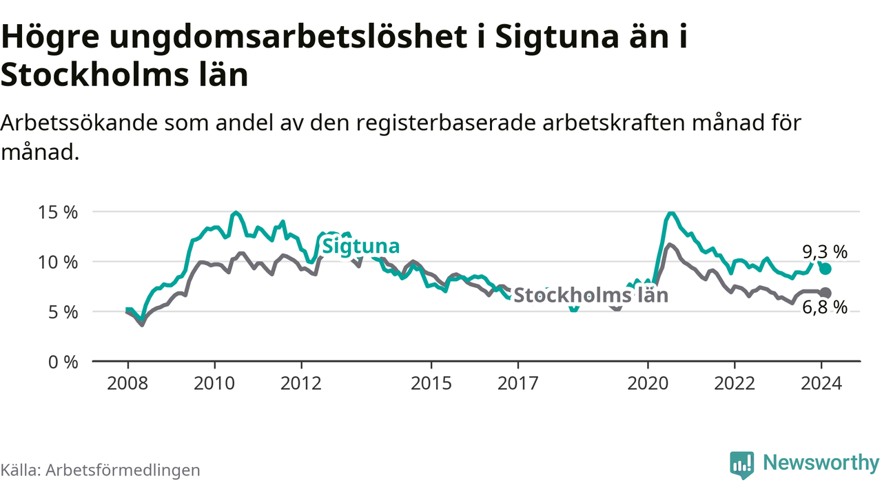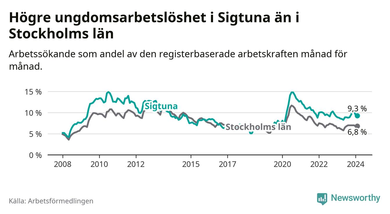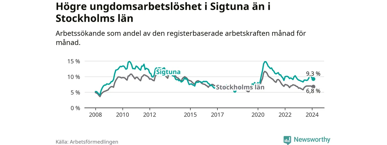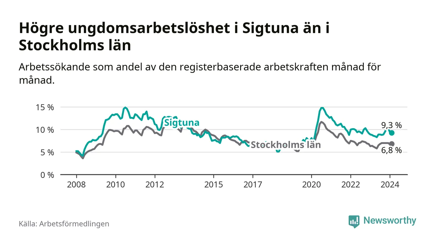 Precis som den totala arbetslösheten ligger ungdomsarbetslösheten i Sigtuna högre än i Stockholms län som helhet. Skillnaden mellan kommunen och länet är 2,5 procentenheter.