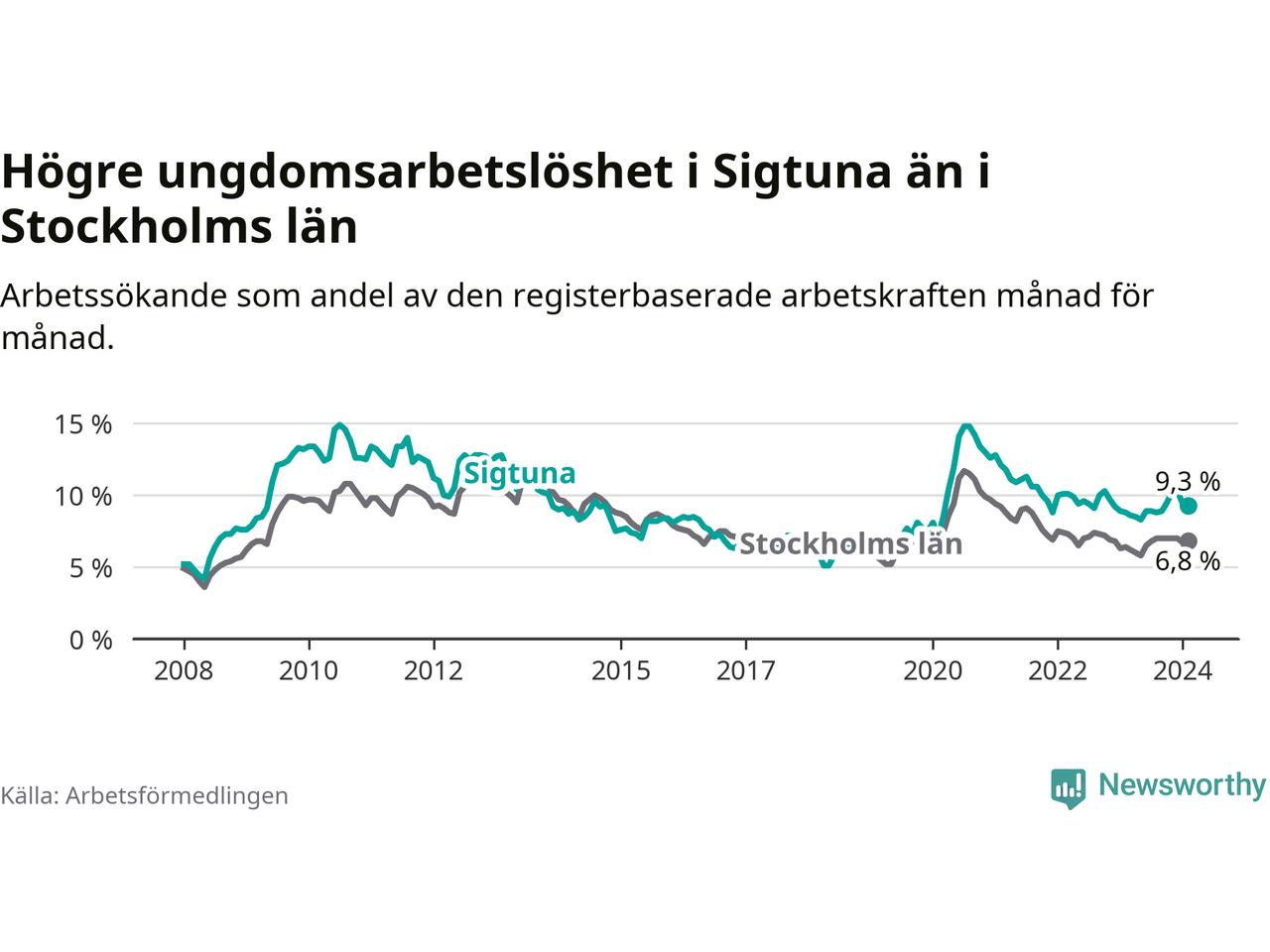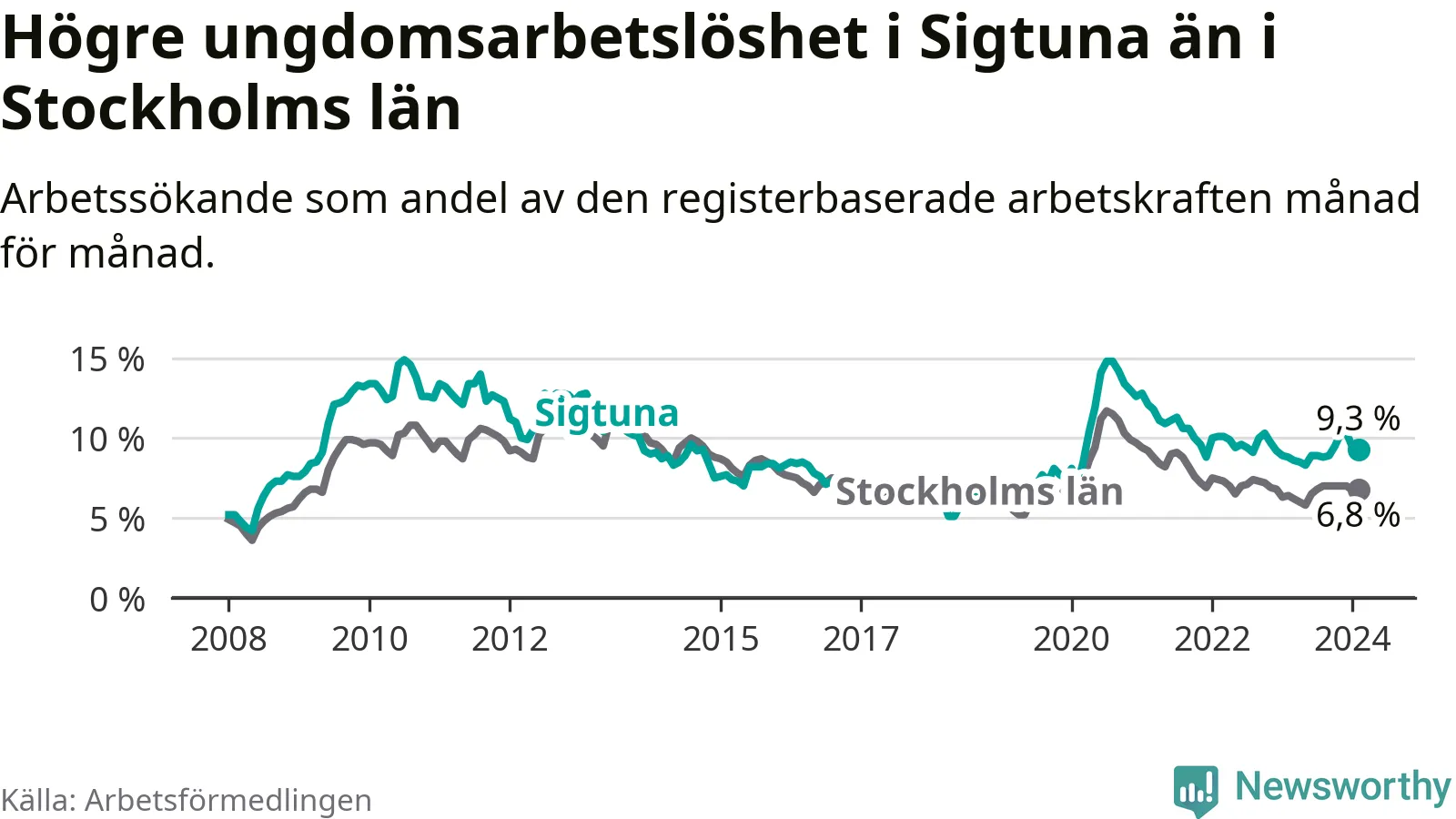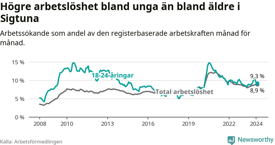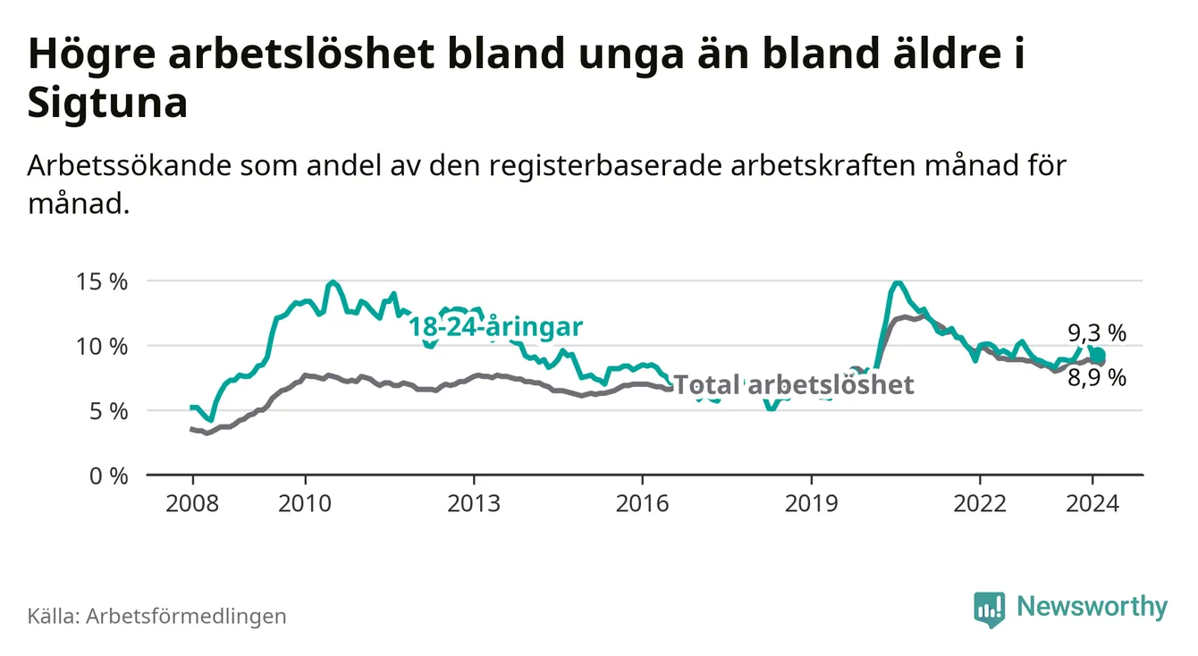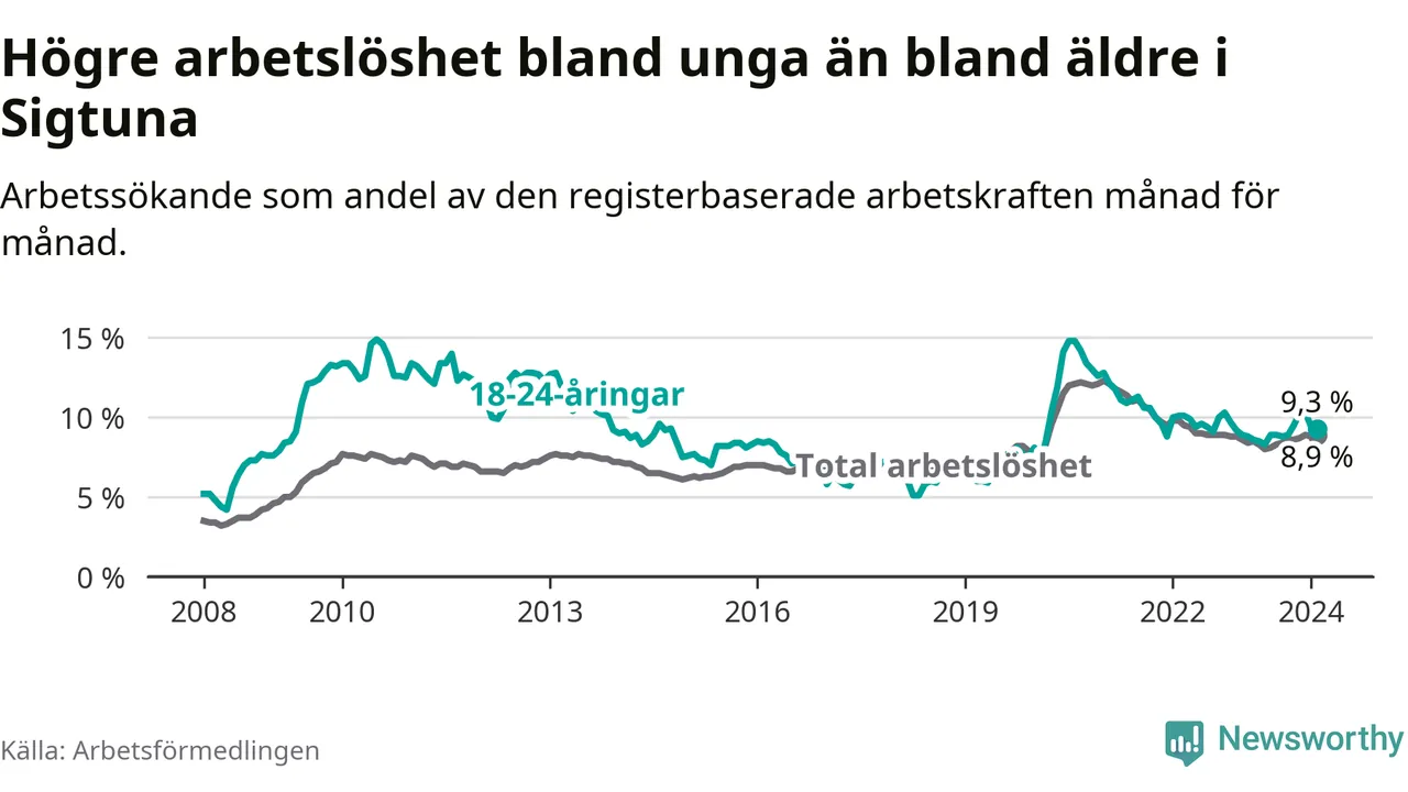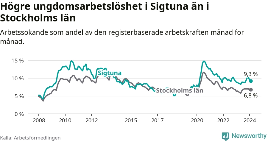 Precis som den totala arbetslösheten ligger ungdomsarbetslösheten i Sigtuna högre än i Stockholms län som helhet. Skillnaden mellan kommunen och länet är 2,5 procentenheter.