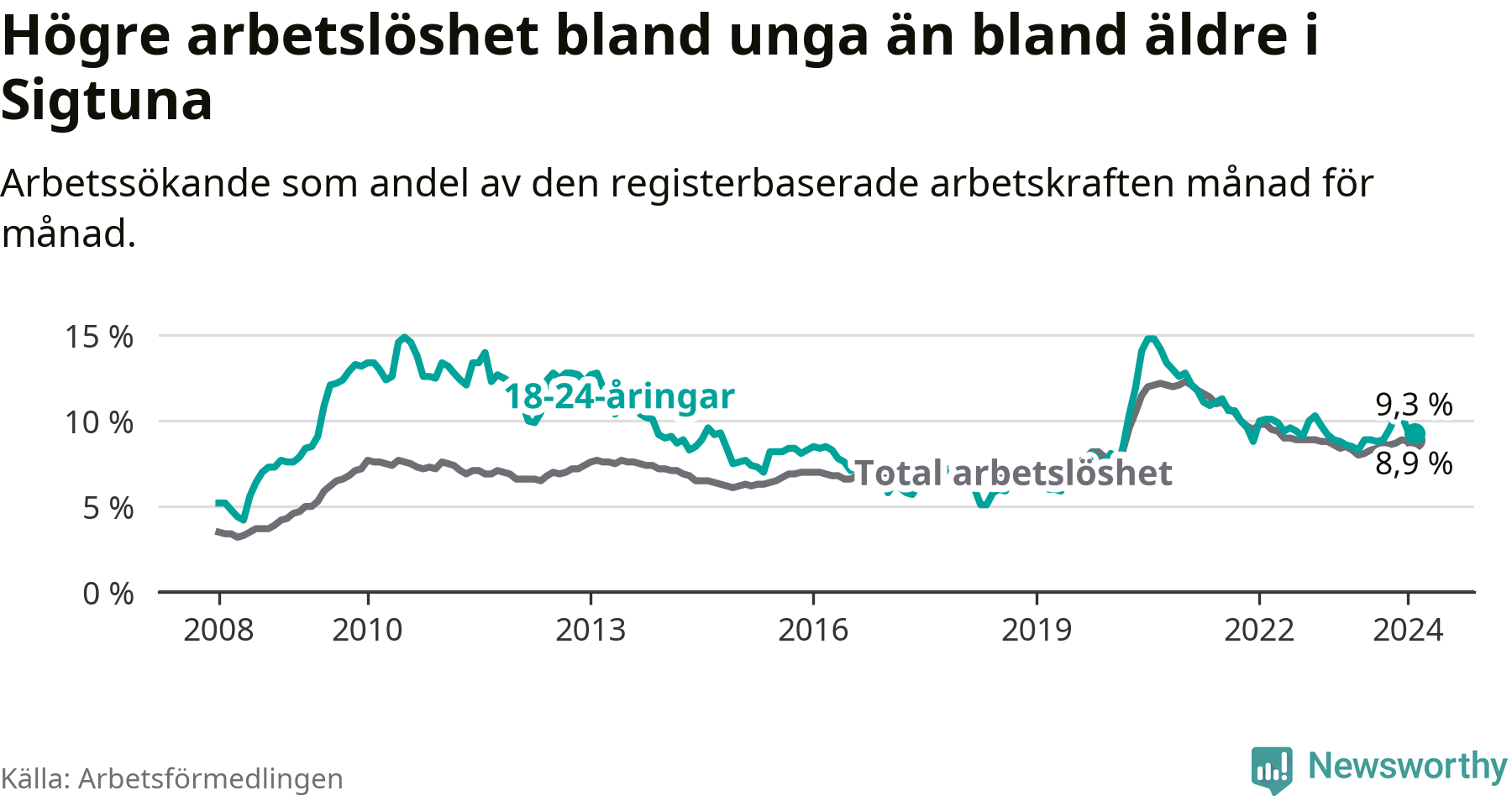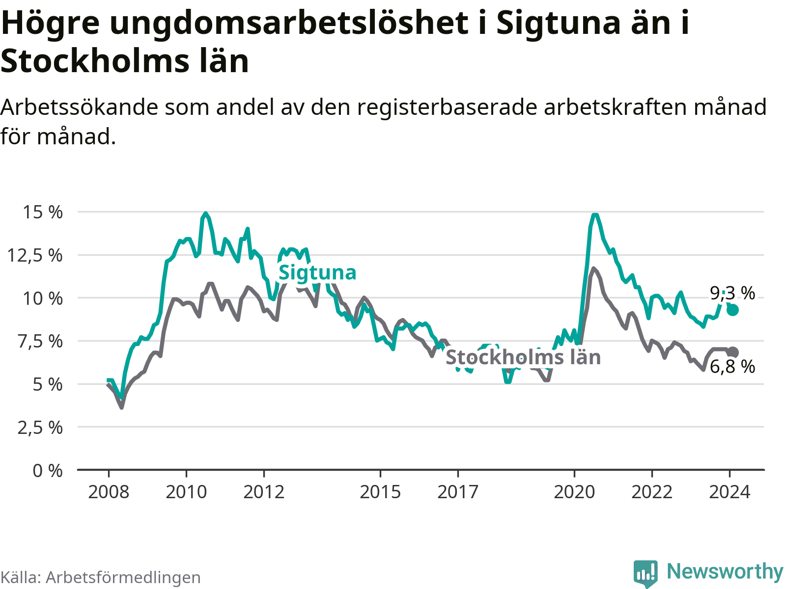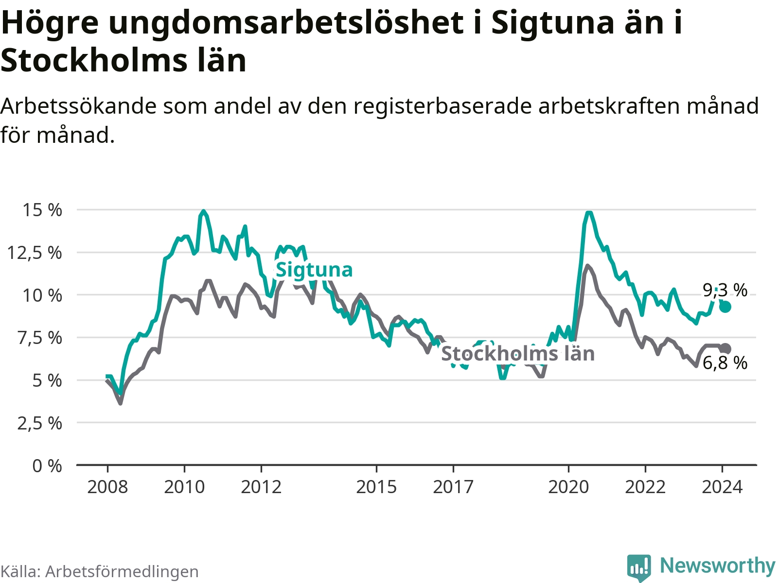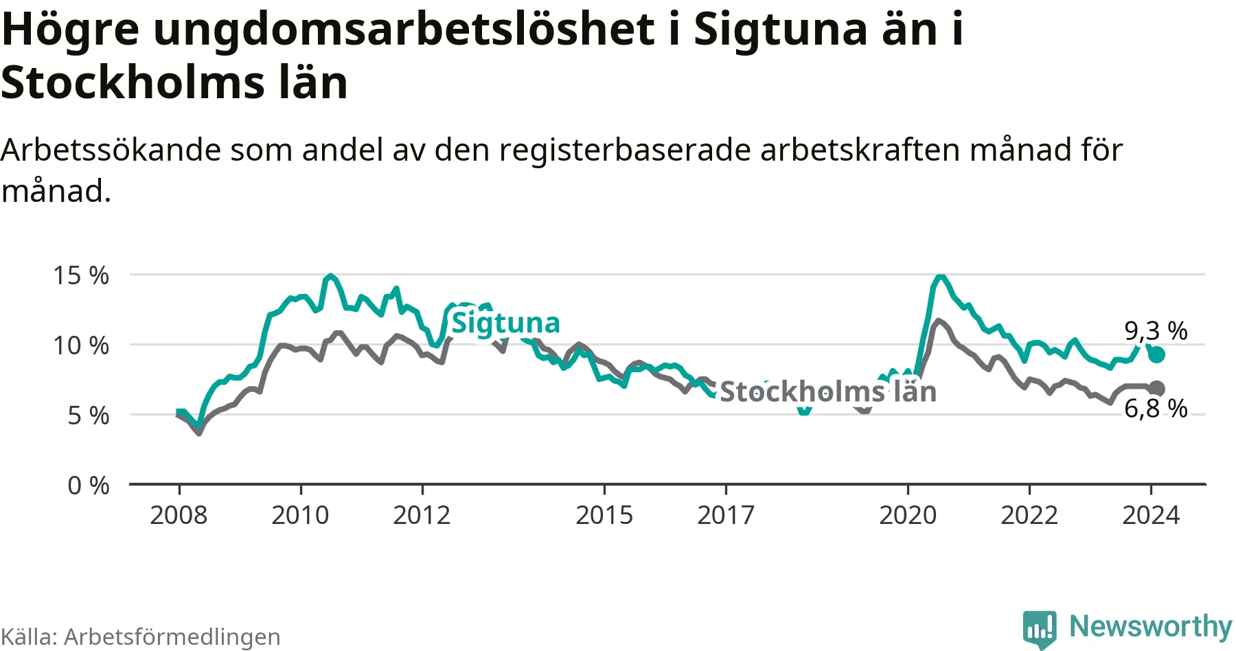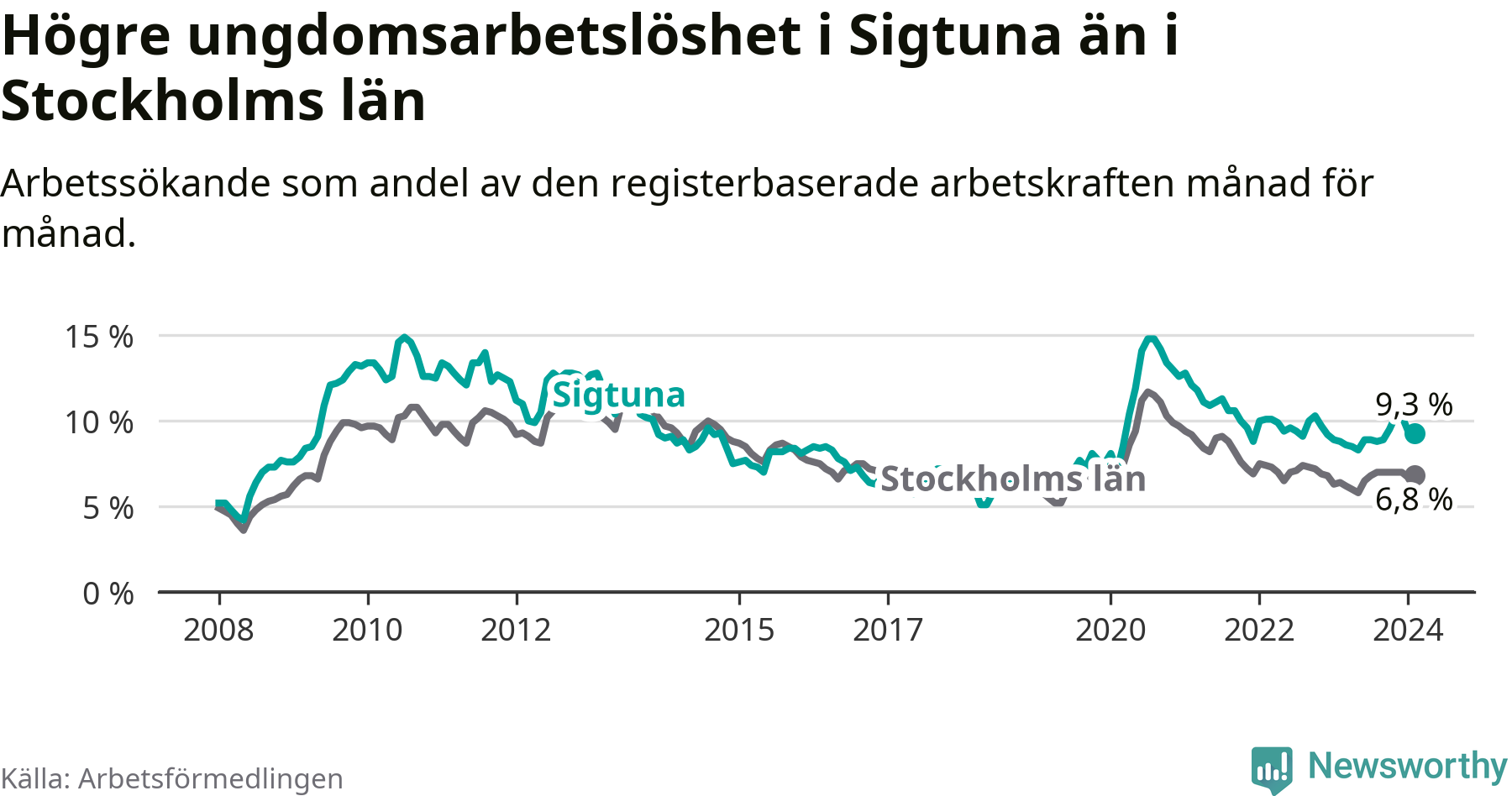 Precis som den totala arbetslösheten ligger ungdomsarbetslösheten i Sigtuna högre än i Stockholms län som helhet. Skillnaden mellan kommunen och länet är 2,5 procentenheter.